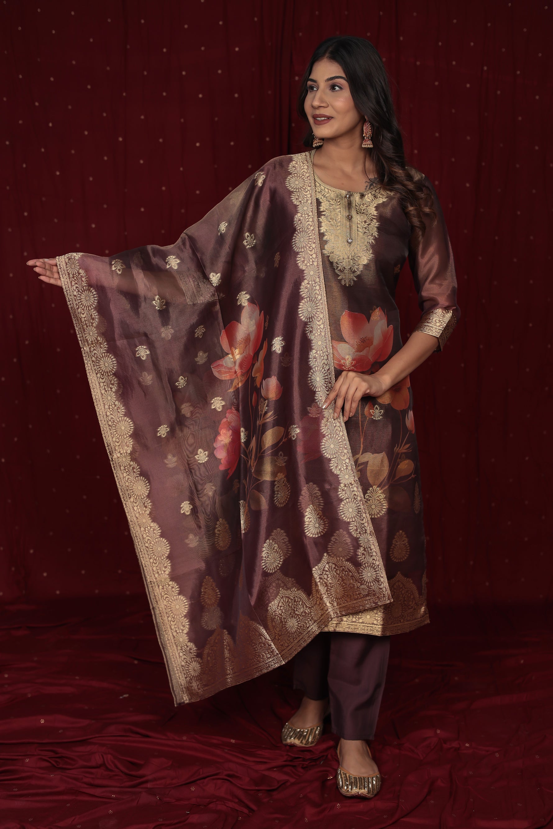 Deluxe Jacquard Organza Brown Suit with Jacquard Dupatta, Soft Silk Pant and Inner Lining in Kurti