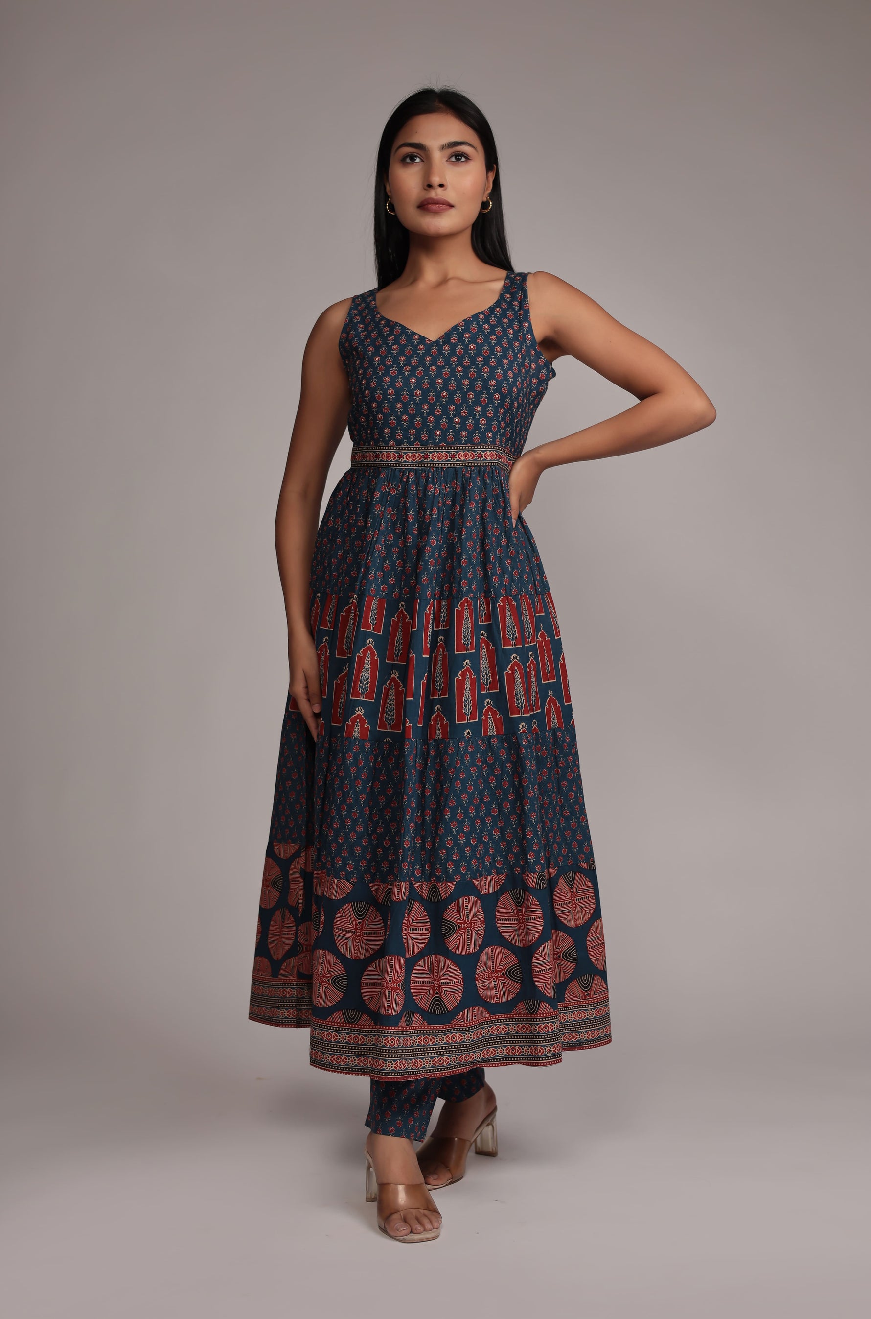 Step out in trendy comfort with our Indigo Print Dress and Pant set. This stylish ensemble is detailed beautifully with shimmering sequin work for a touch of subtle glamour.