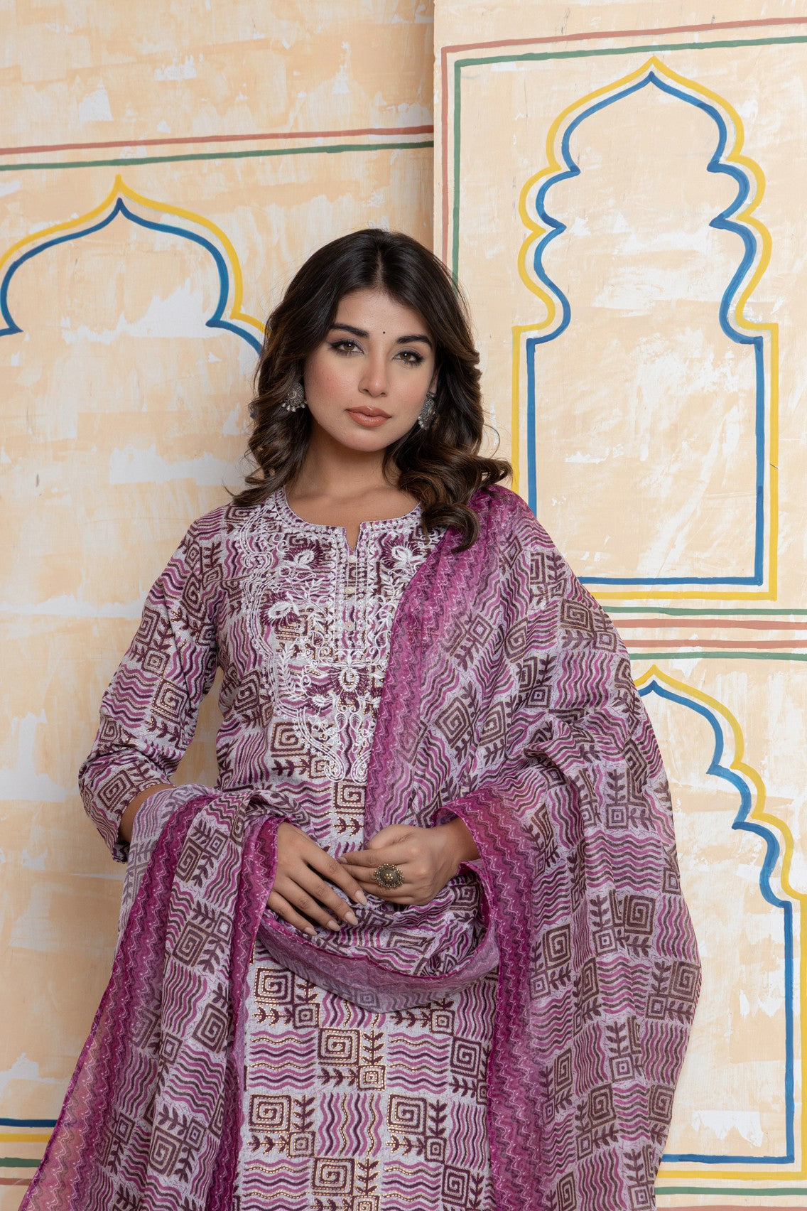 The Navra Dusty Pink Floral Cotton Kurta Set with Embroidery & Dupatta