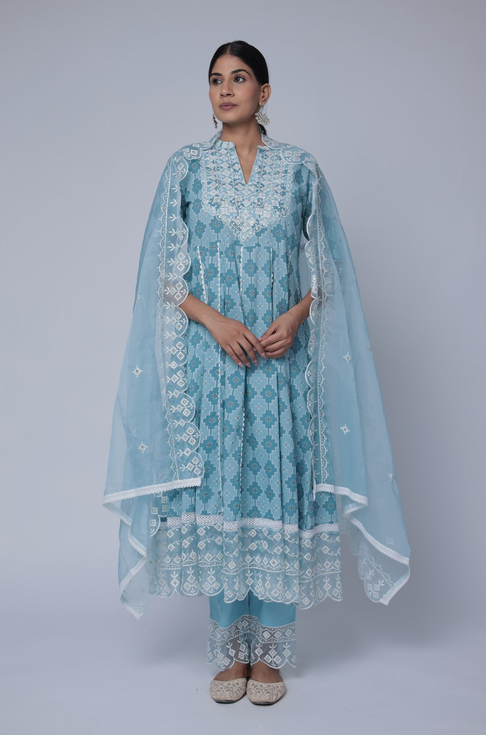 Ocean Blue anarkali cotton dupatta set detailed with white thread work