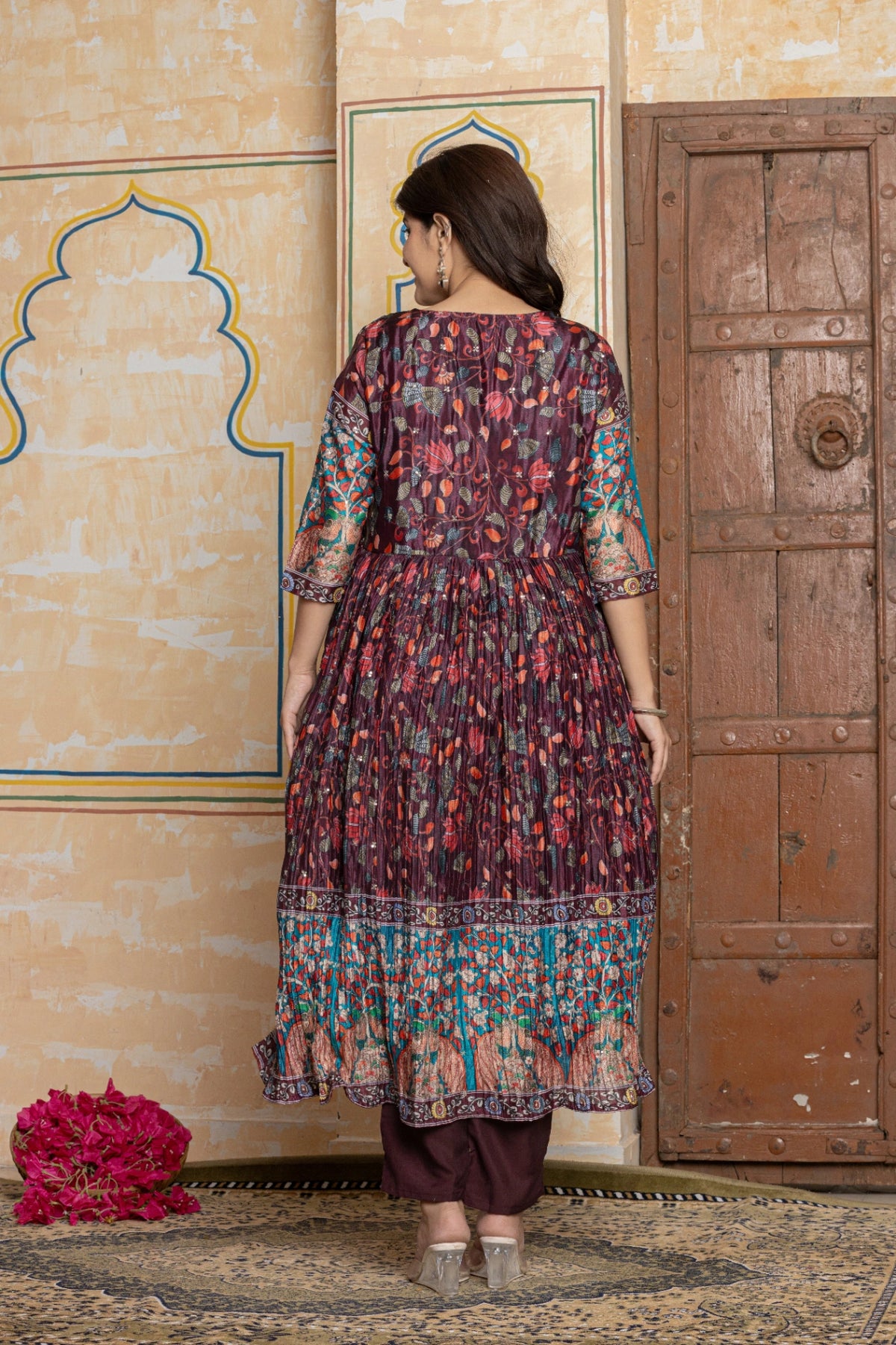 Wine Embroidered Anarkali Suit | Pichwai Peacock Print Festive Wear