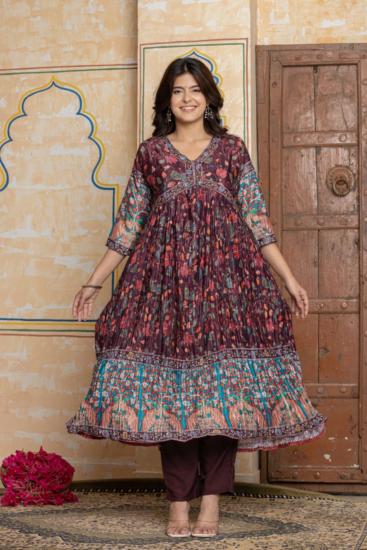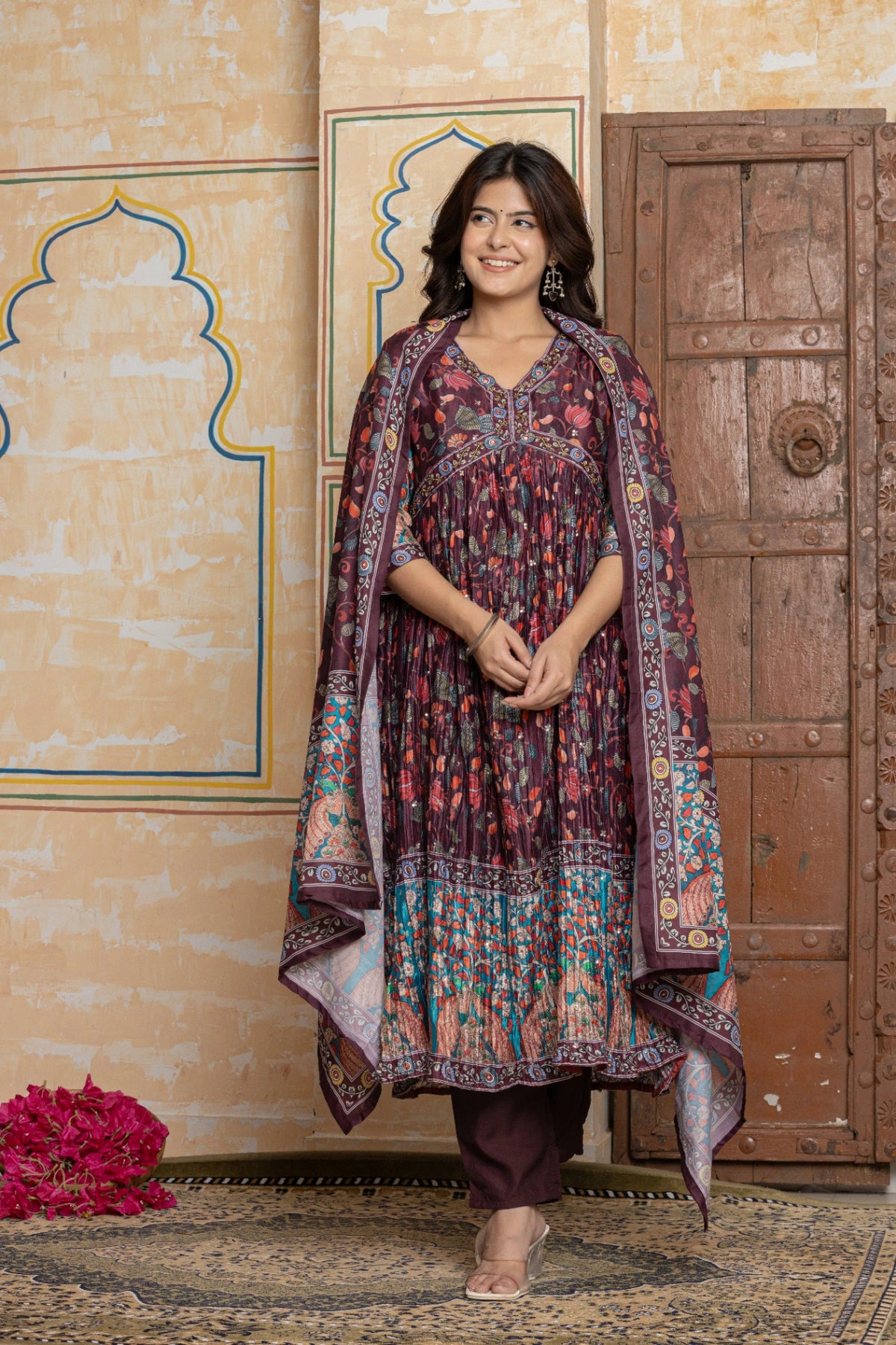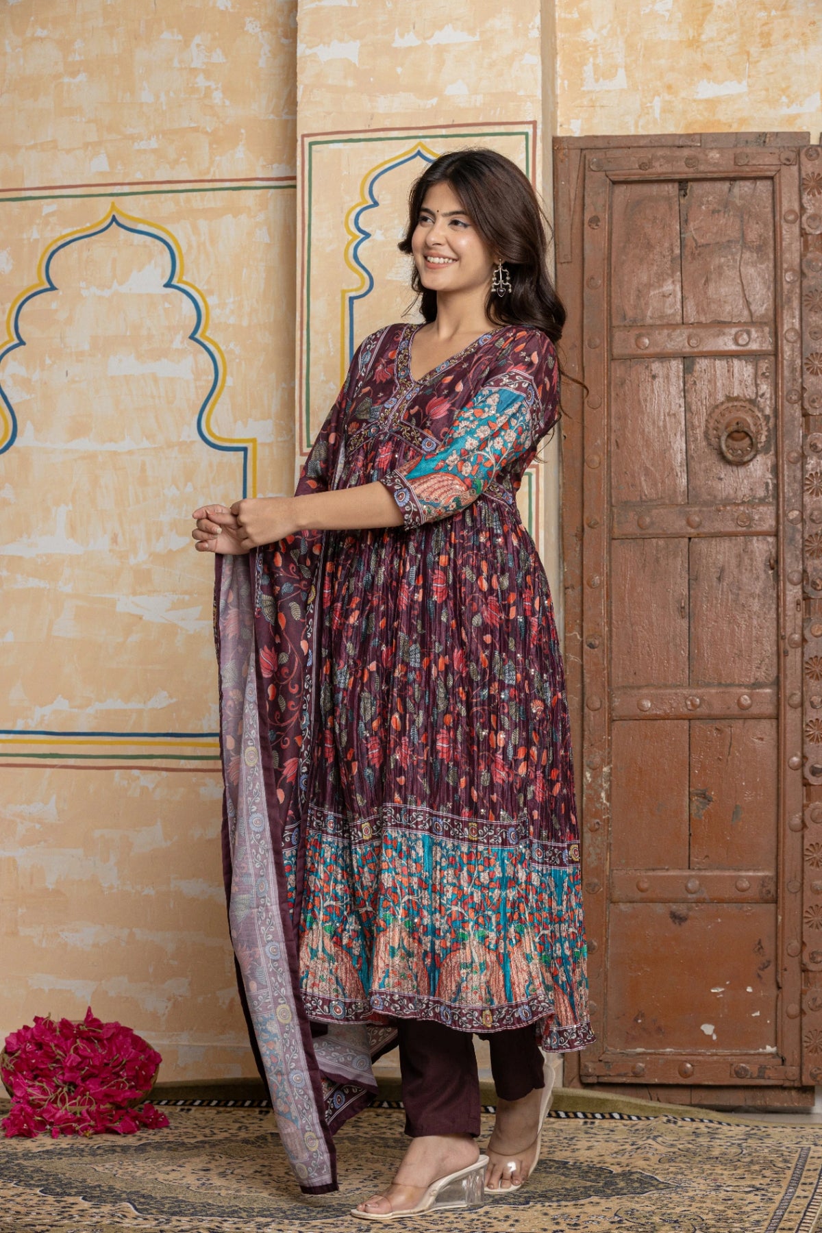 Embody regal grace in this magnificent Wine suit set from The navra, a true masterpiece that blends luxurious fabric with breathtaking artistry. The deep, jewel-toned wine kurta, crafted from lustrous crushed chinnon, flows in a classic Anarkali silhouette. Its body is adorned with a rich floral vine print, shimmering with subtly scattered sequins.
