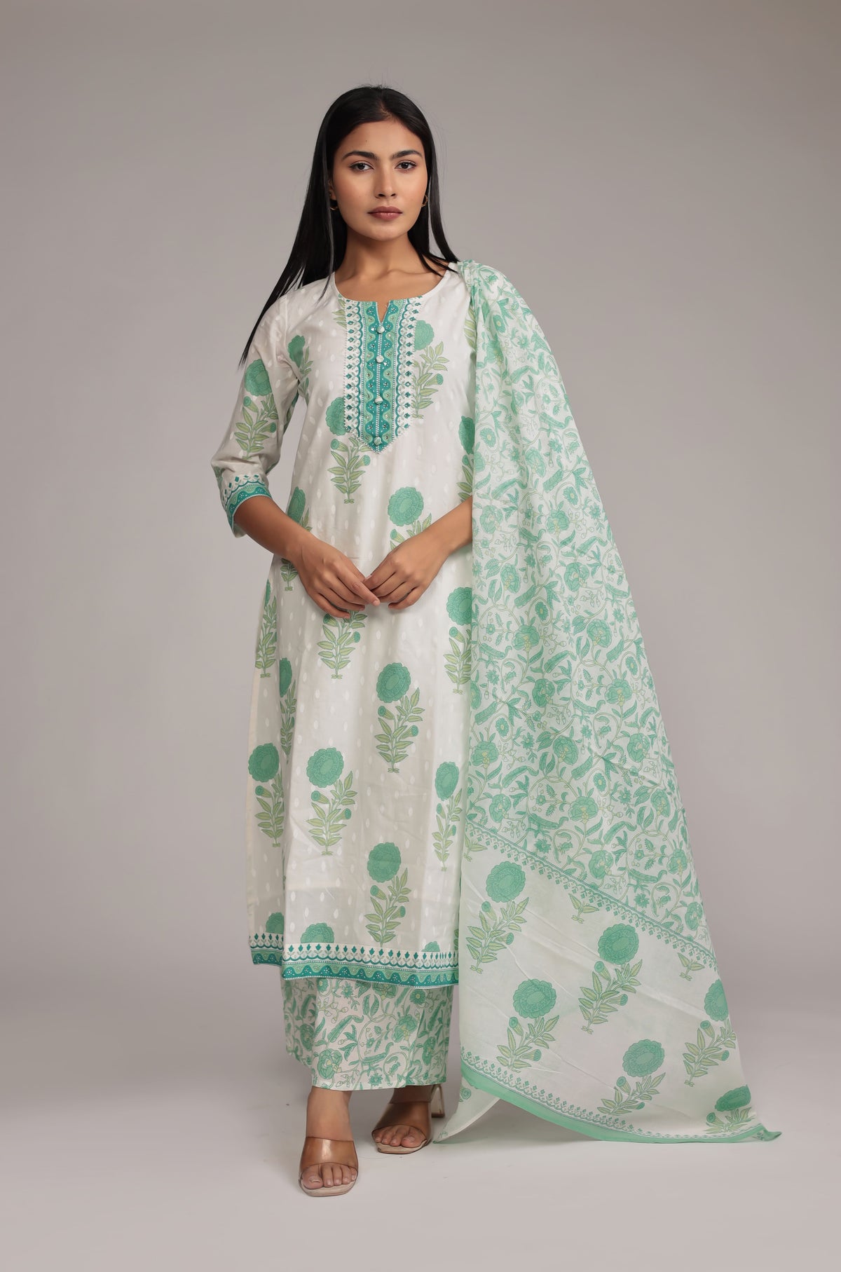 Discover comfort and elegance with this Premium Cotton Dupatta set. Highlighted by exquisite hand embroidery detailing on the neck, perfect for everyday sophistication.
