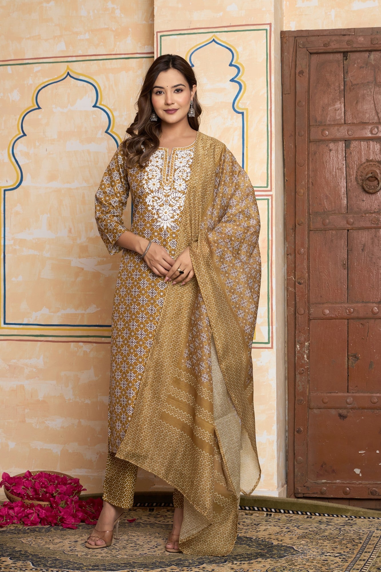 The Navra Golden Ochre Printed Cotton Kurta Set with Embroidery