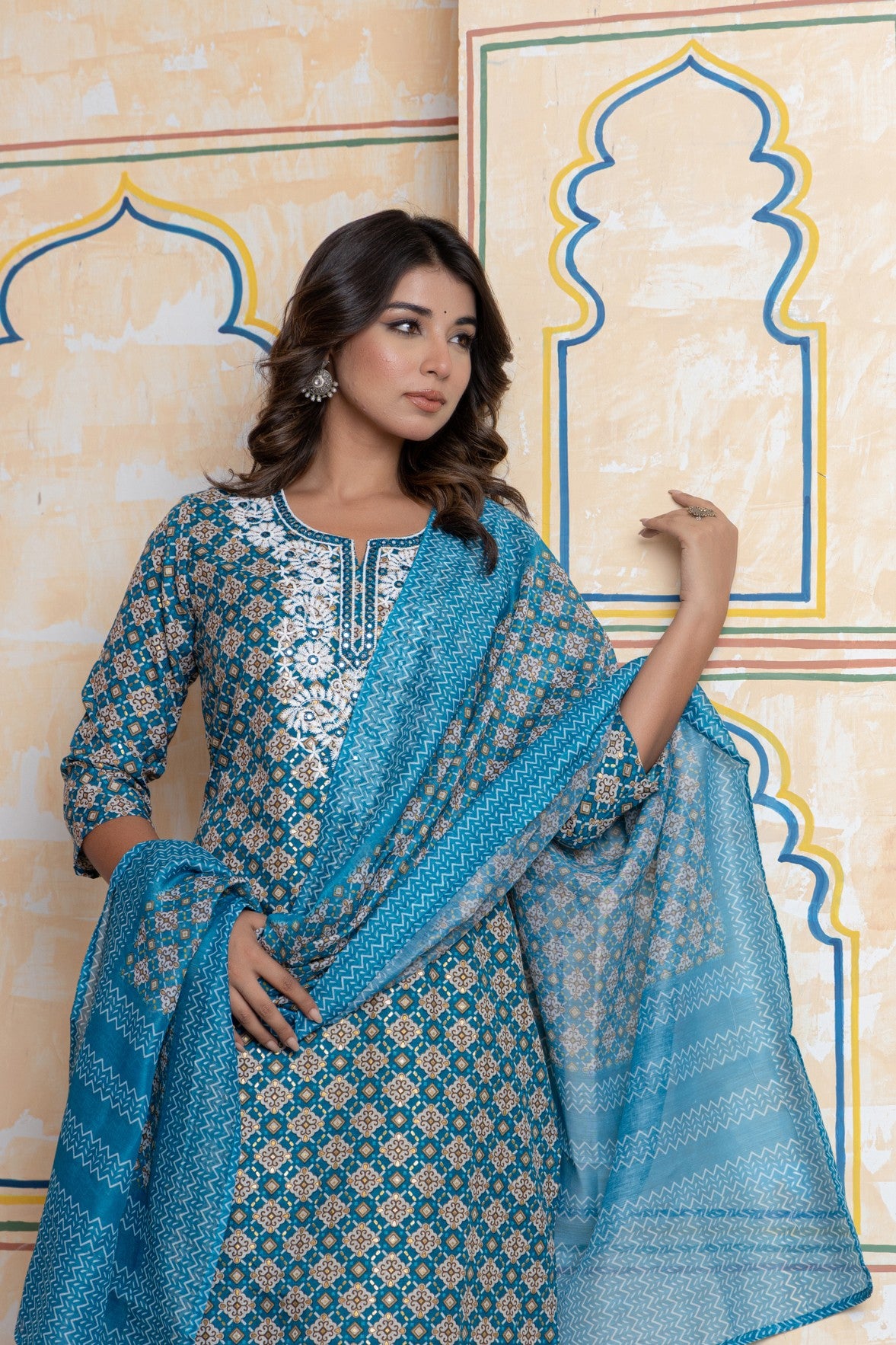 The Navra Teal Blue Cotton Kurta Set with Embroidery & Dupatta