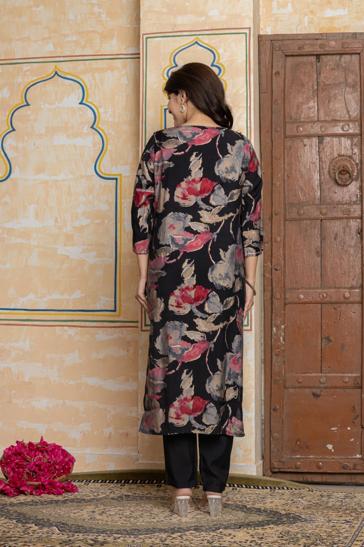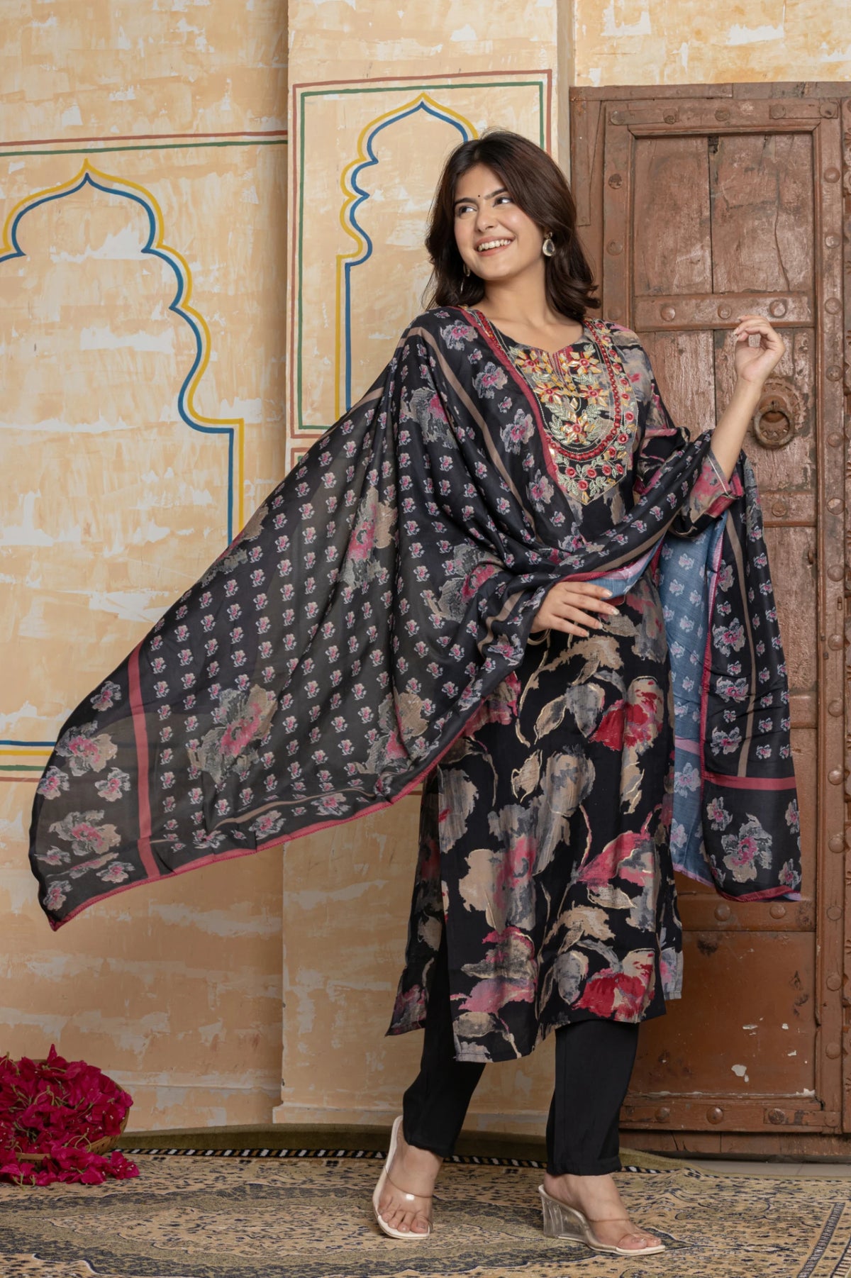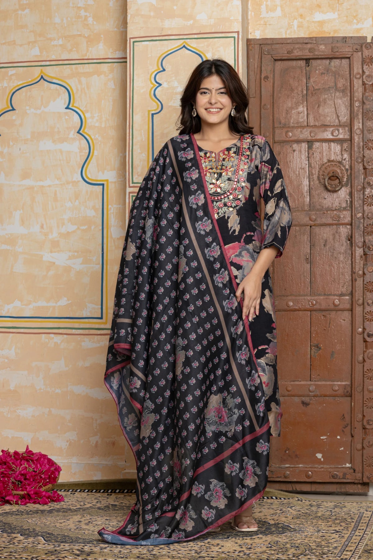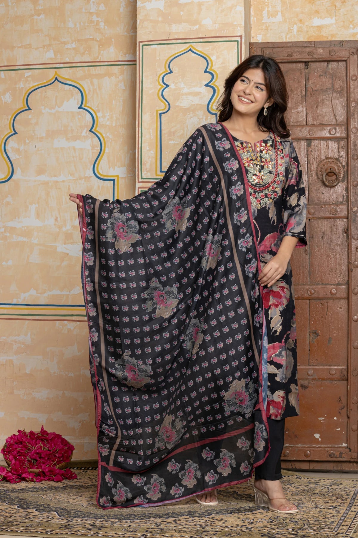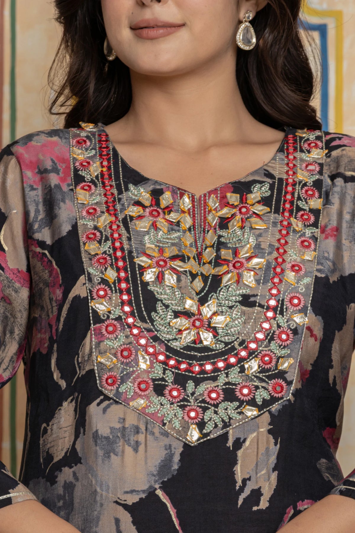 Embrace timeless evening elegance with the Suit Set. Crafted from lustrous Chanderi silk in a classic black, this ensemble from The Navra features a sophisticated floral print. The true masterpiece is the neckline, a stunning showcase of artisanal Rajasthani Gota Patti, intricate embroidery, and mirror work.