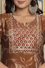 Step into a world of refined opulence with this exquisite brown suit set from The navra. A perfect harmony of texture and tradition, this ensemble pairs a lustrous Chanderi silk kurta with a gracefully tiered voile skirt. The kurta, adorned with a sophisticated leafy print, is distinguished by a lavishly embroidered yoke that showcases meticulous craftsmanship with shimmering sequins and intricate threadwork.