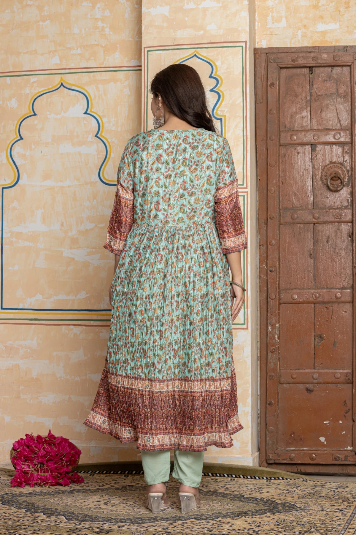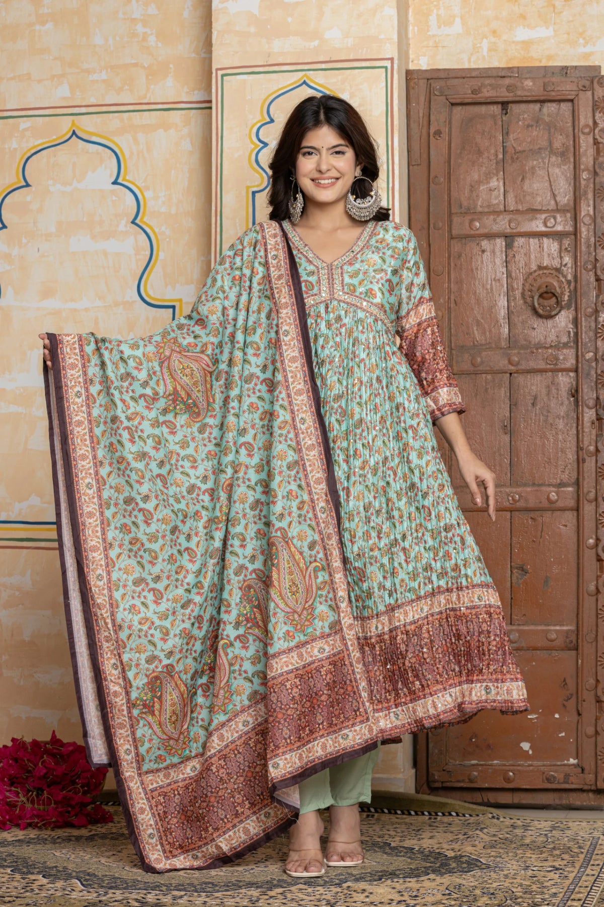 Silhouette: Flared Anarkali with gathers for a voluminous look.