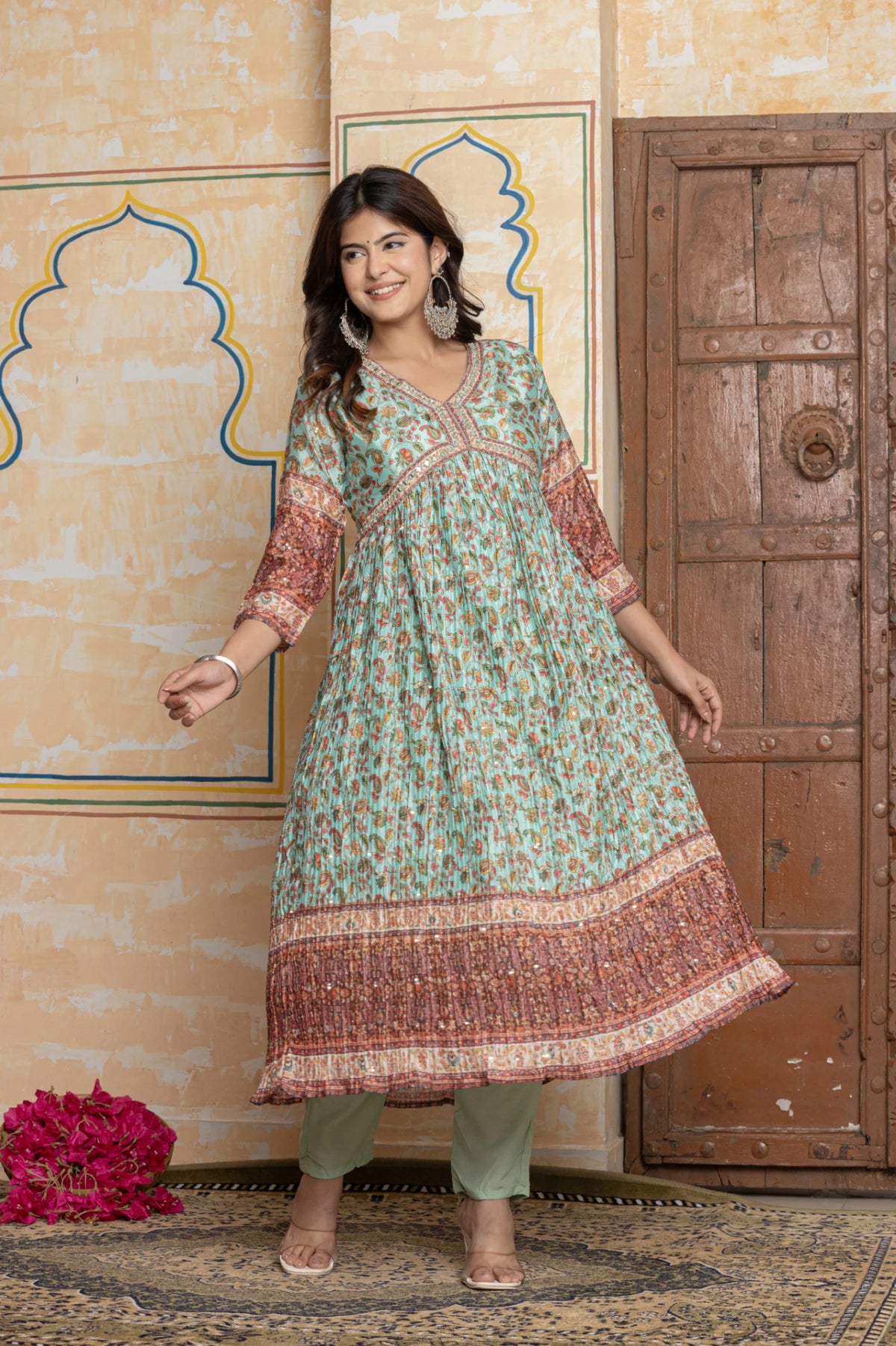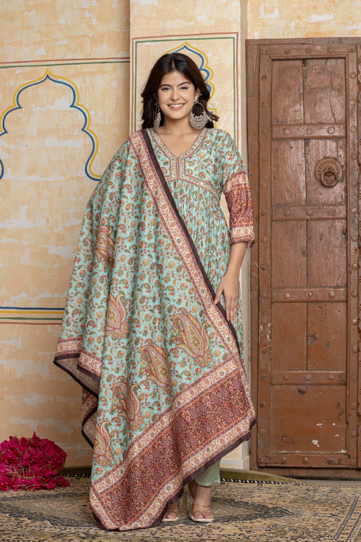 The kurta is fashioned from ethereal crushed Chinnon fabric, which offers a beautiful, fluid drape and a subtle sheen. The highlight is the stunning digital print inspired by traditional Kalamkari, featuring intricate motifs of birds and botanicals in earthy hues of indigo, rust, and ochre against a soft blush-beige canvas. The V-neckline is a canvas of exquisite hand-embroidery, lavishly adorned with shimmering mirror work and multi-coloured threads. The graceful, flared Anarkali silhouette flows from an empire waist, offering a beautiful twirl with every movement.