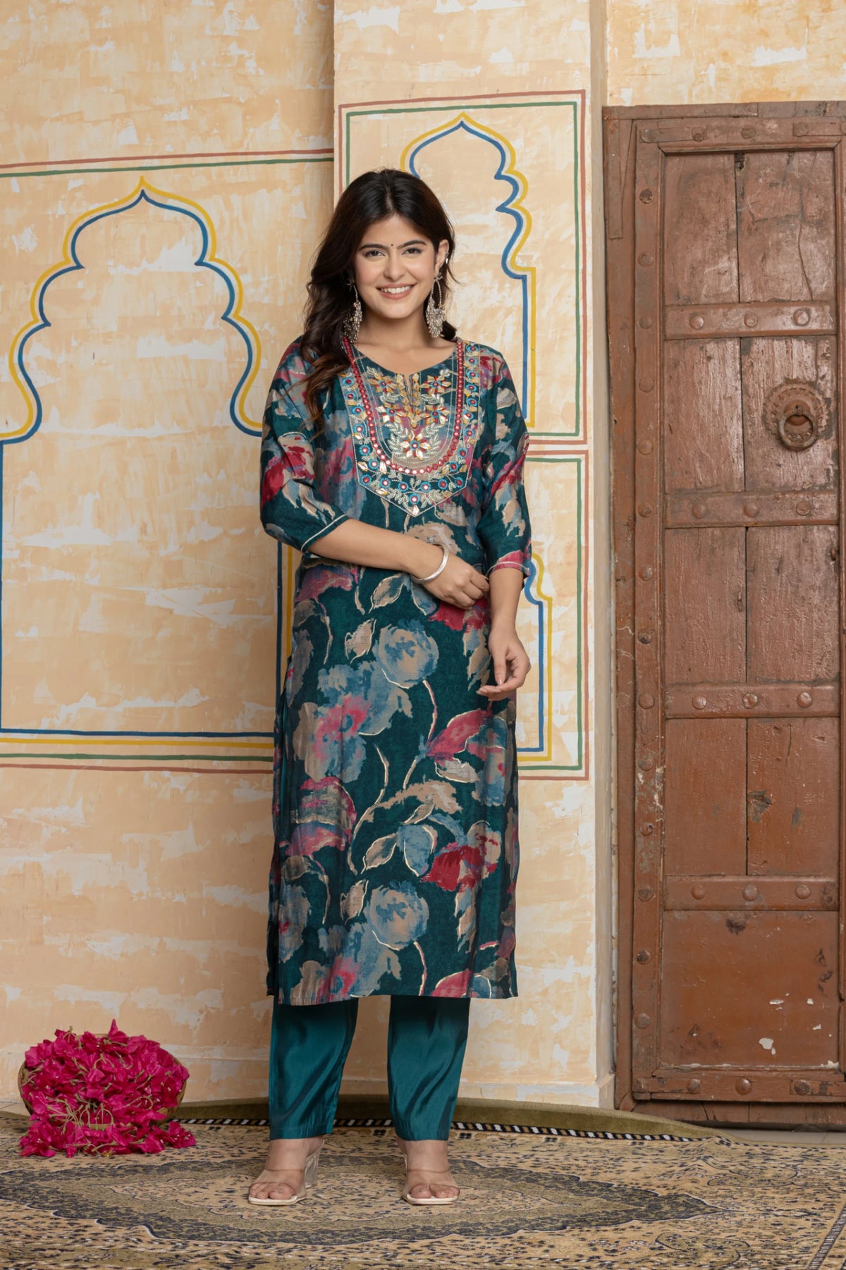 Immerse yourself in festive grandeur with the Mayura Suit Set. Crafted from lustrous Chanderi silk in a regal Rama Green, this ensemble from The Navra serves as a canvas for a magnificent, handcrafted yoke. Artisanal Rajasthani Gota Patti, intricate embroidery, and shimmering mirror work come together in a breathtaking display of heritage craft.