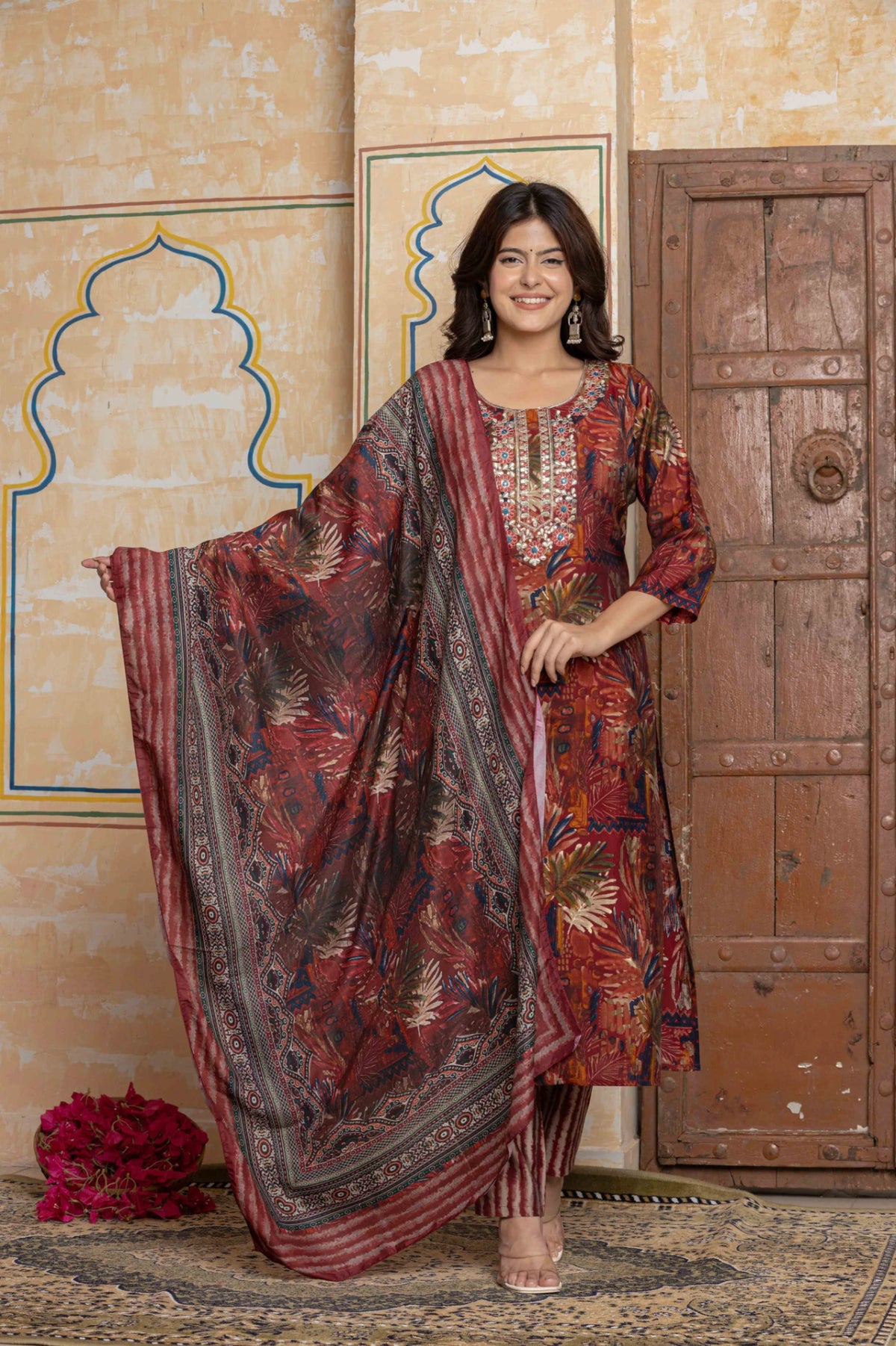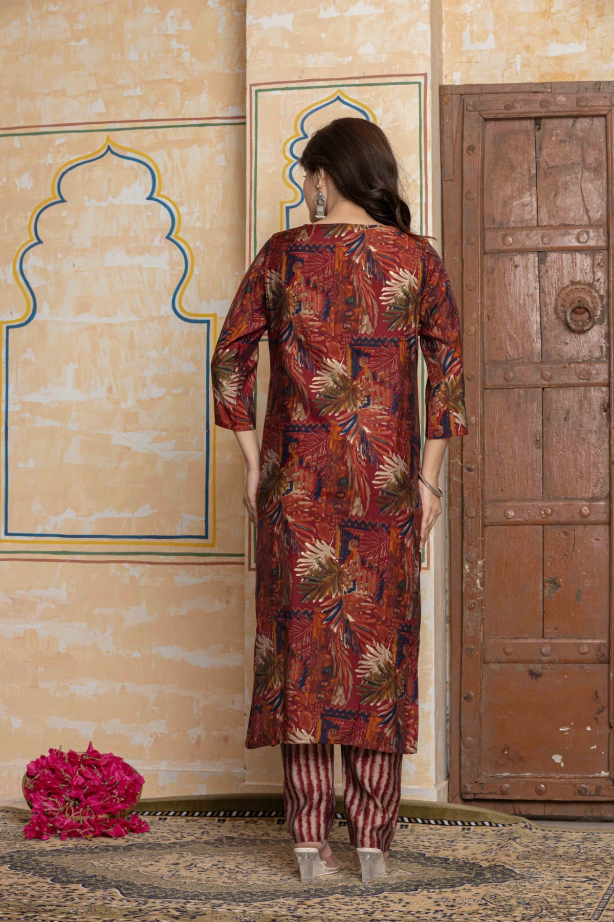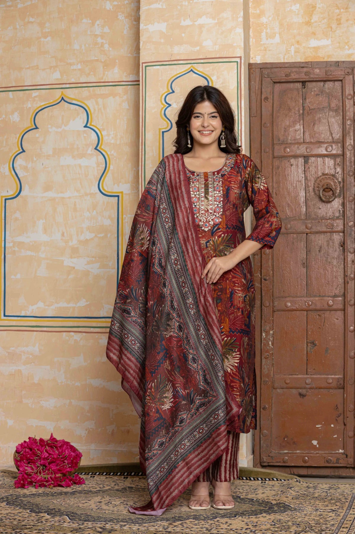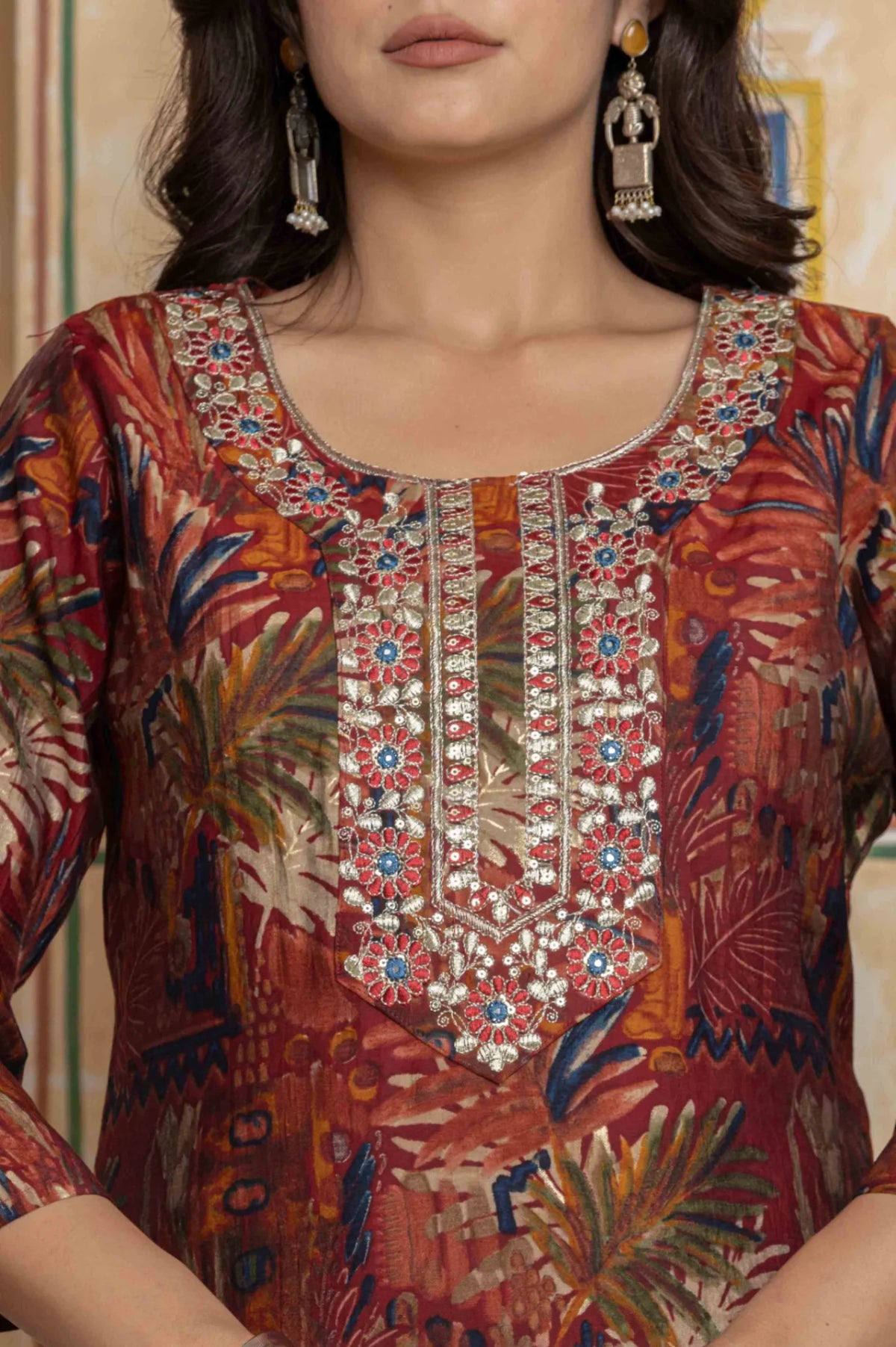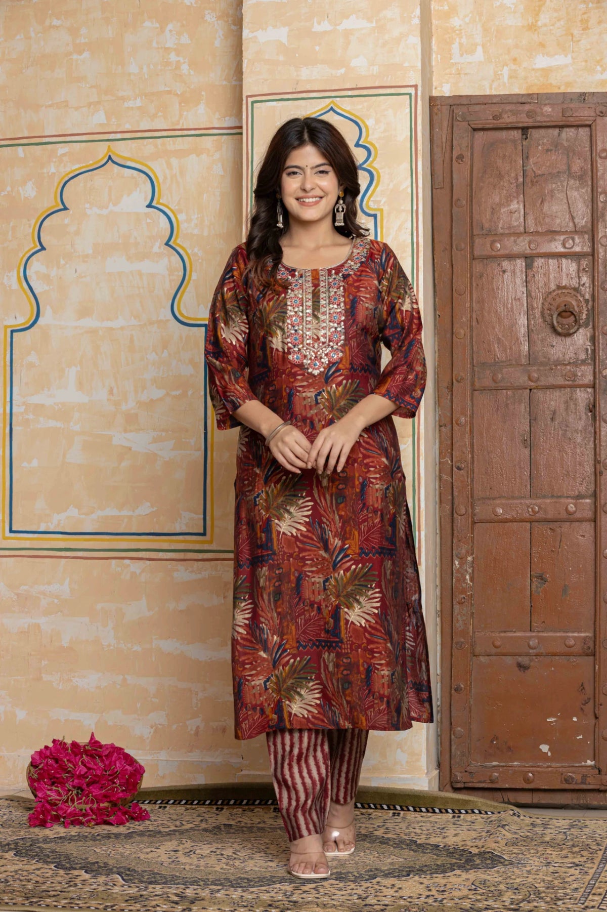 Discover artistic elegance with the Mihira Suit Set. Crafted from lustrous Chanderi silk in a warm rust brown, it features a unique abstract foliage print. This ensemble from The Navra is elevated by an exquisitely handcrafted yoke of Zari and beadwork, and perfectly complemented by chic striped pants and a matching dupatta.