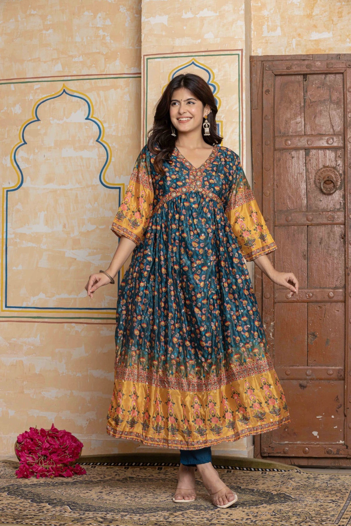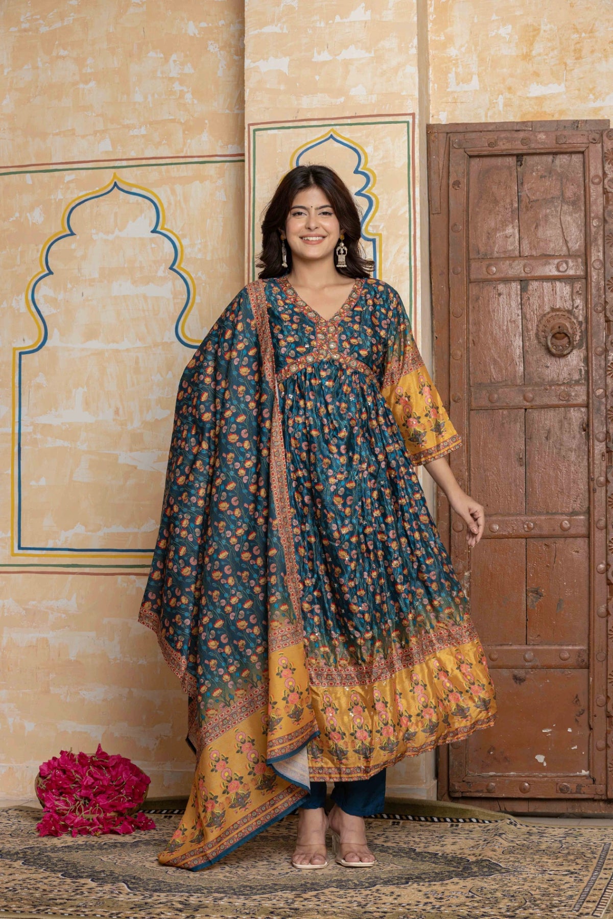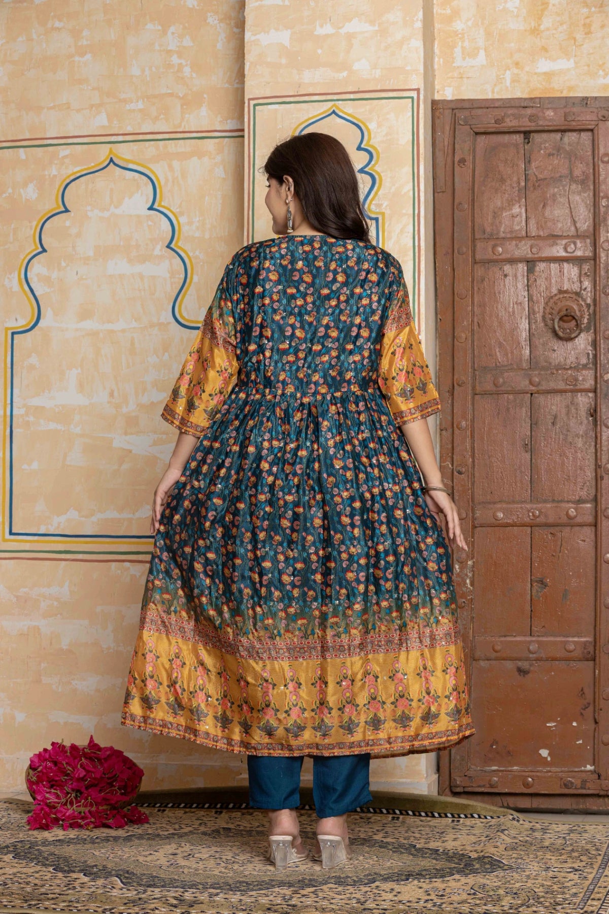 Teal & Mustard Embroidered Anarkali Suit Set | Festive Crushed Chinnon Kurta