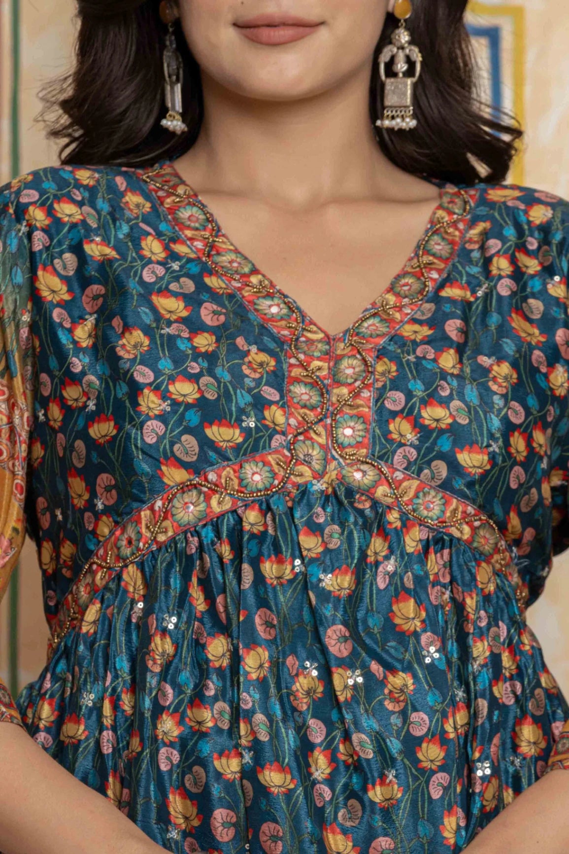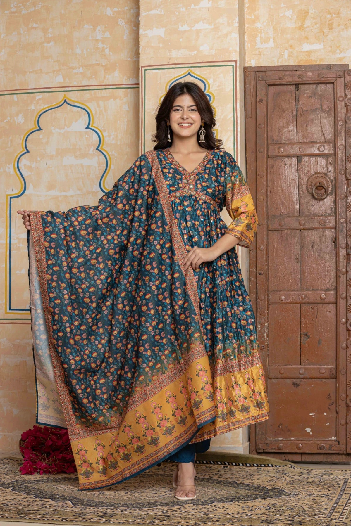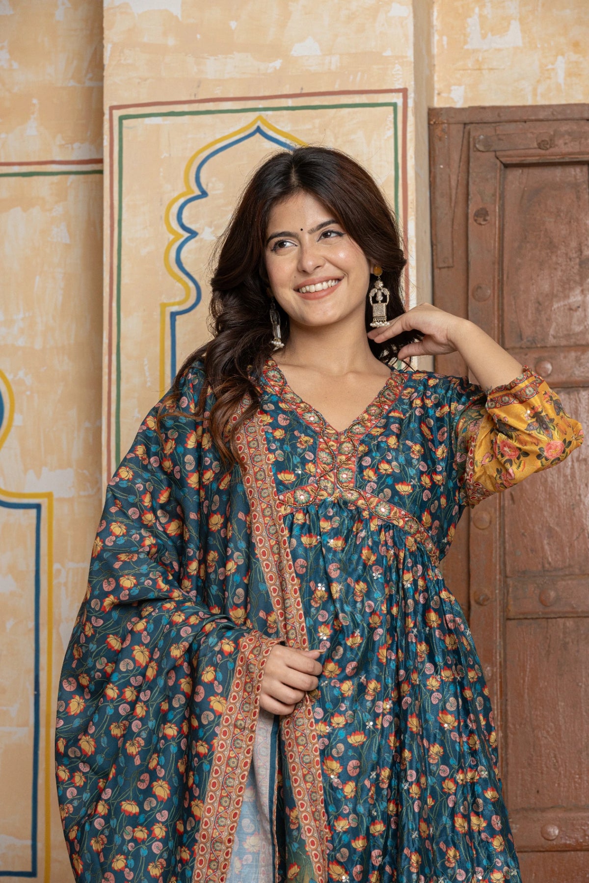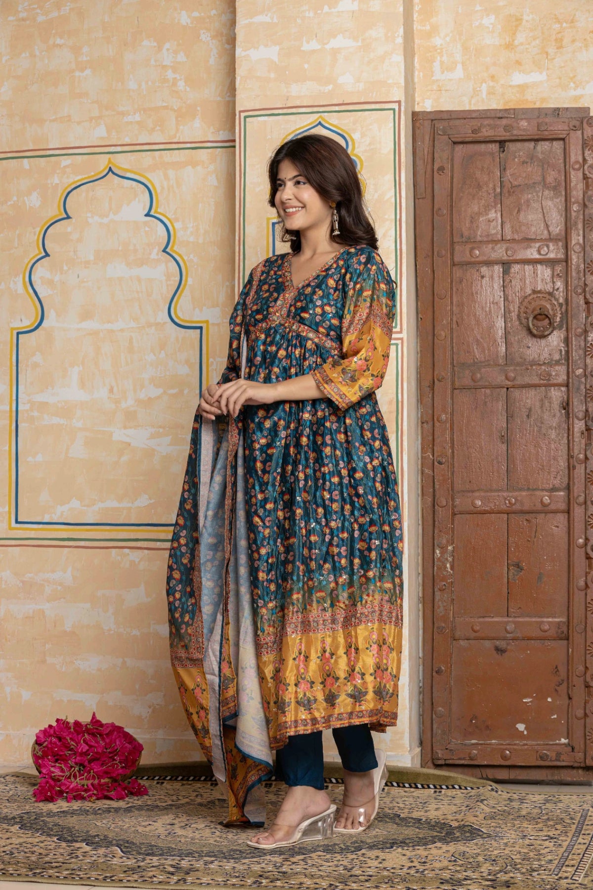 Teal & Mustard Embroidered Anarkali Suit Set | Festive Crushed Chinnon Kurta