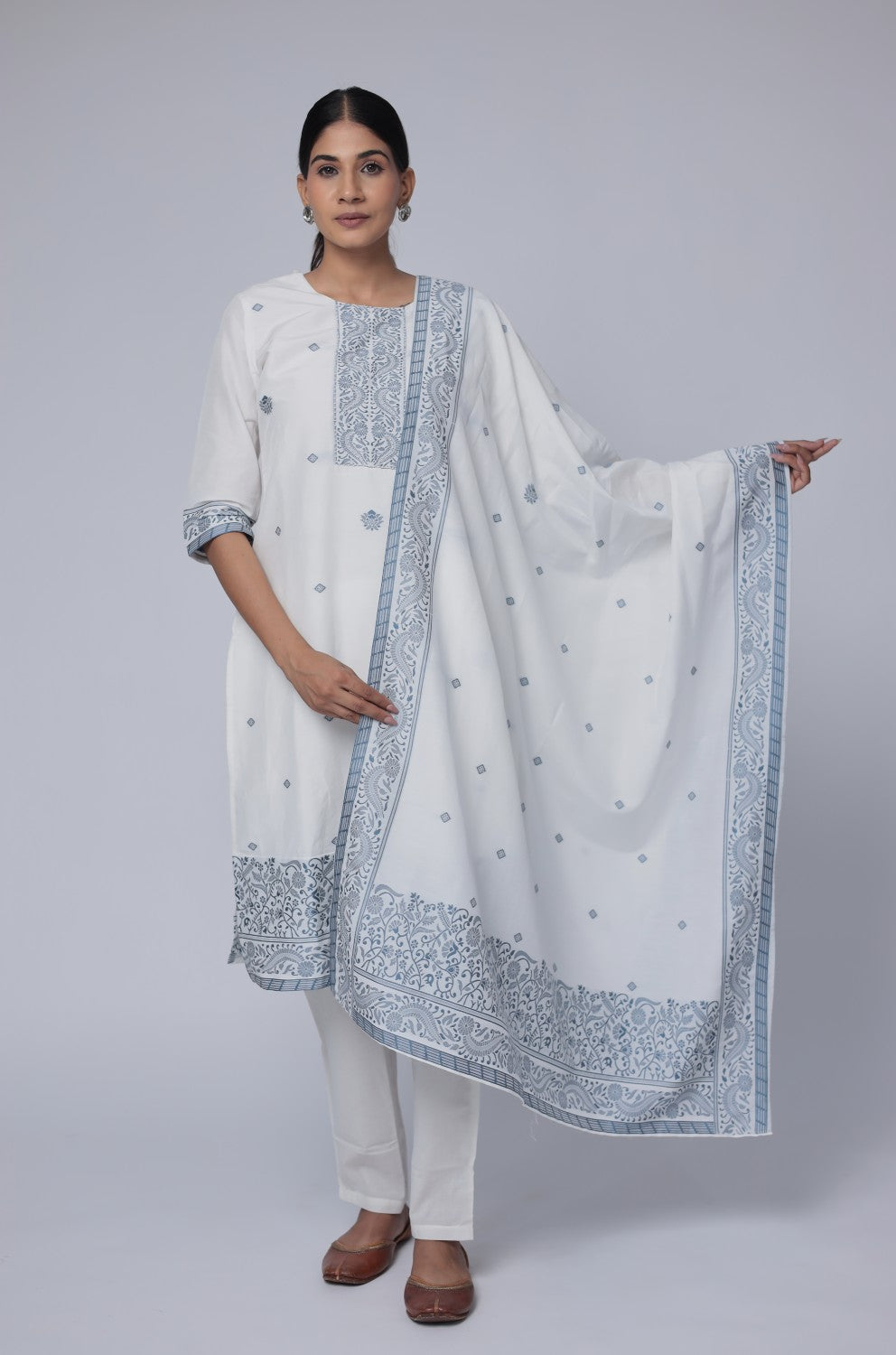 White Blue cotton jacquard dupatta set detailed with detailing on front
