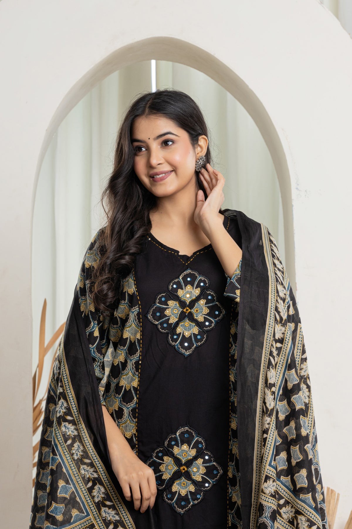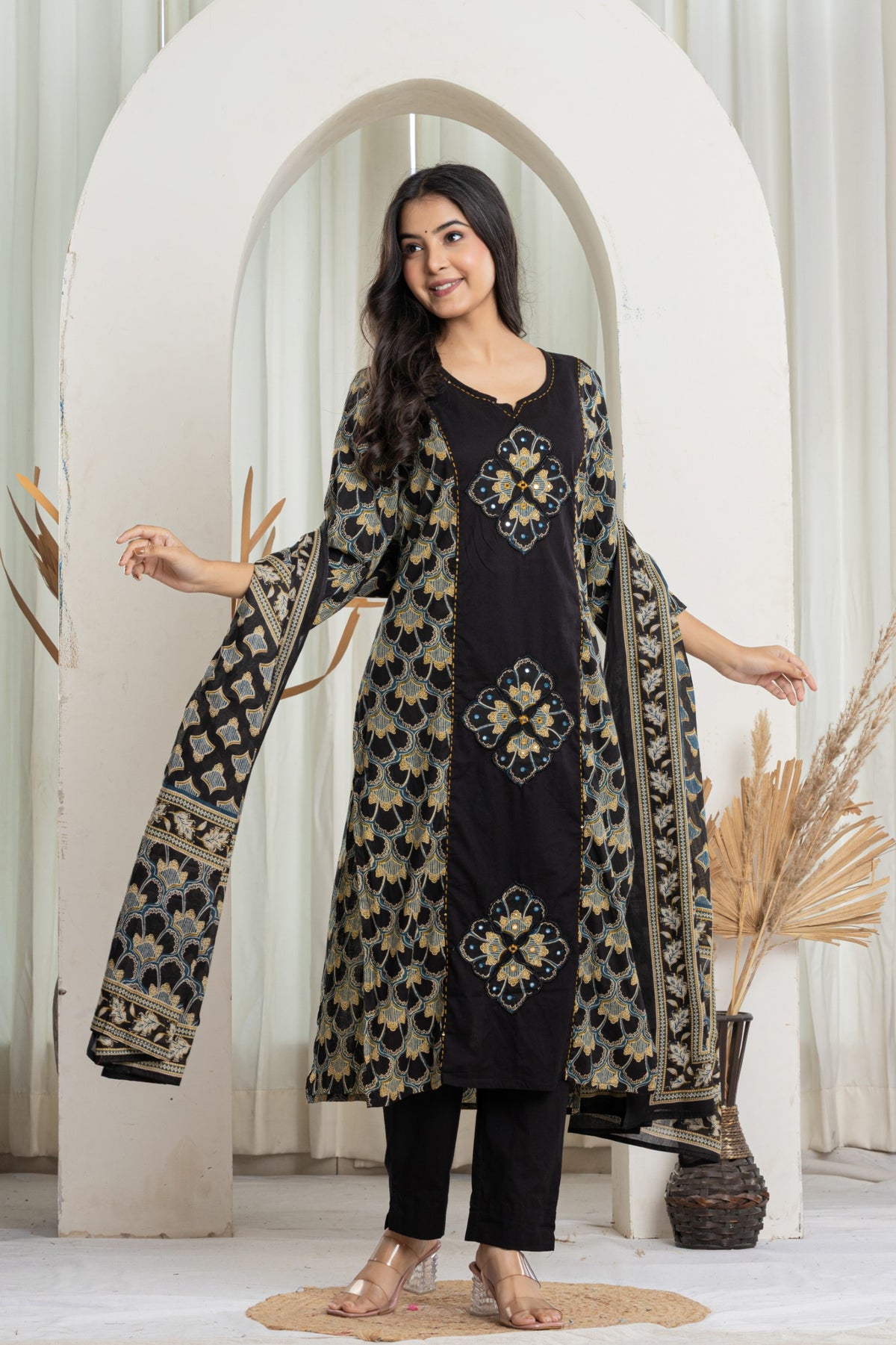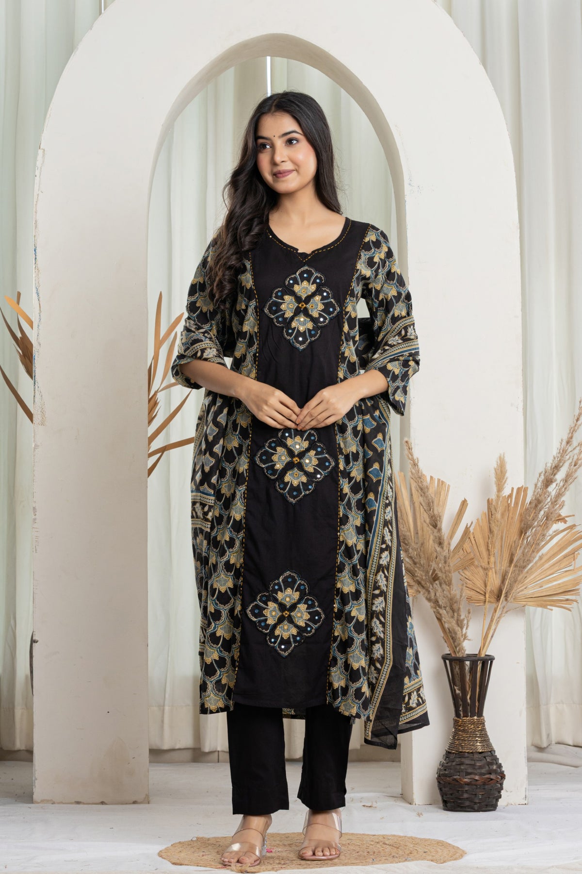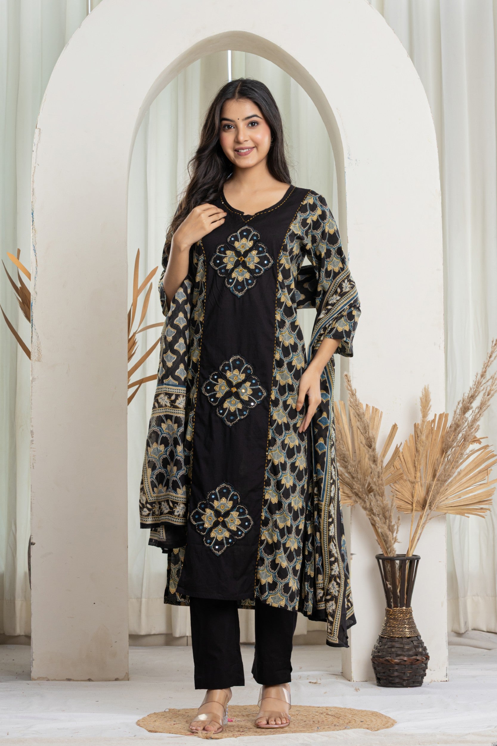 Complete 3-Piece Ensemble: Includes the straight-fit A-line kurta, solid black trousers, and a full-length printed cotton dupatta.