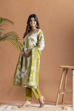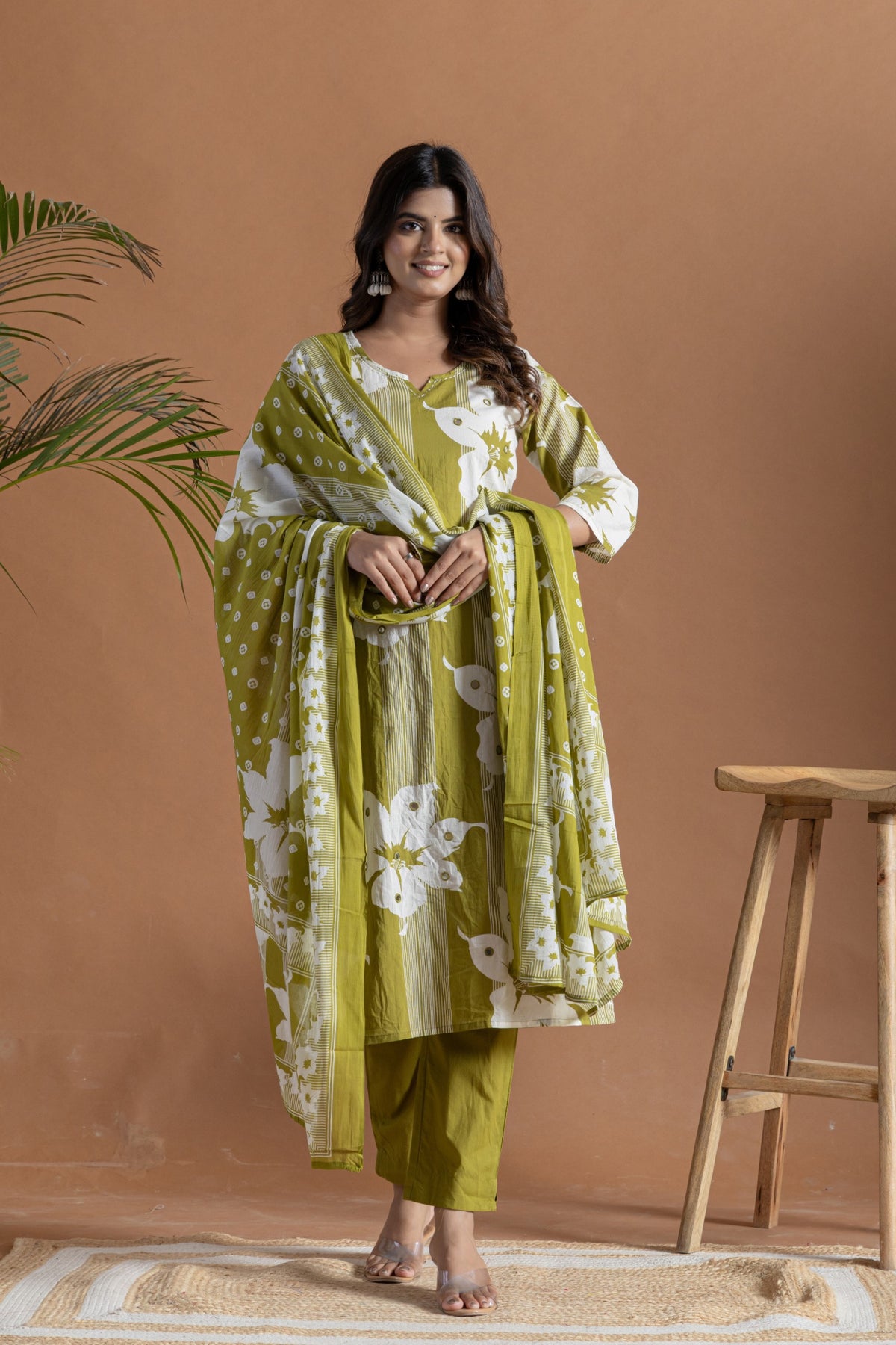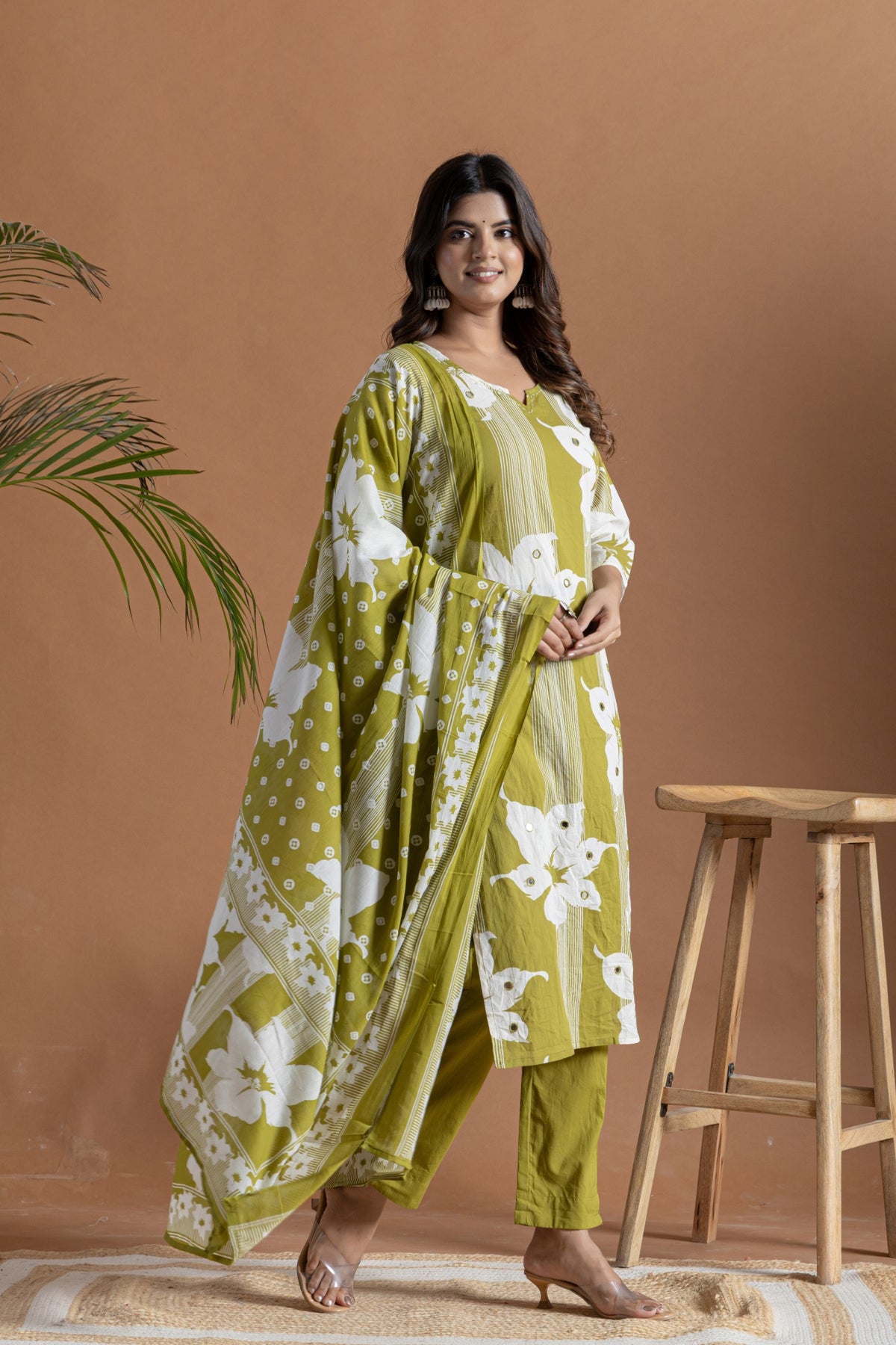 Embrace the warmth and joy of the winter festive season with this stunning Mehendi green suit set. Crafted from premium, breathable cotton, this ensemble is perfectly comfortable for all-day celebrations and cozy at-home gatherings. The A-line kurta features a vibrant, large-scale painterly floral print in a crisp, contrasting white.