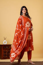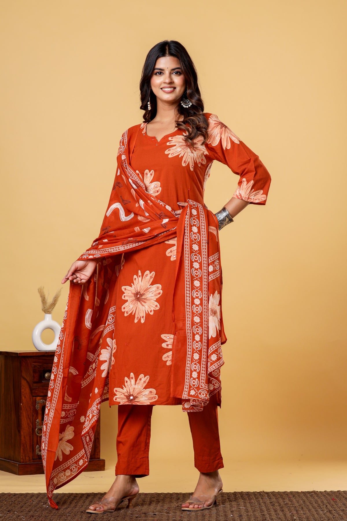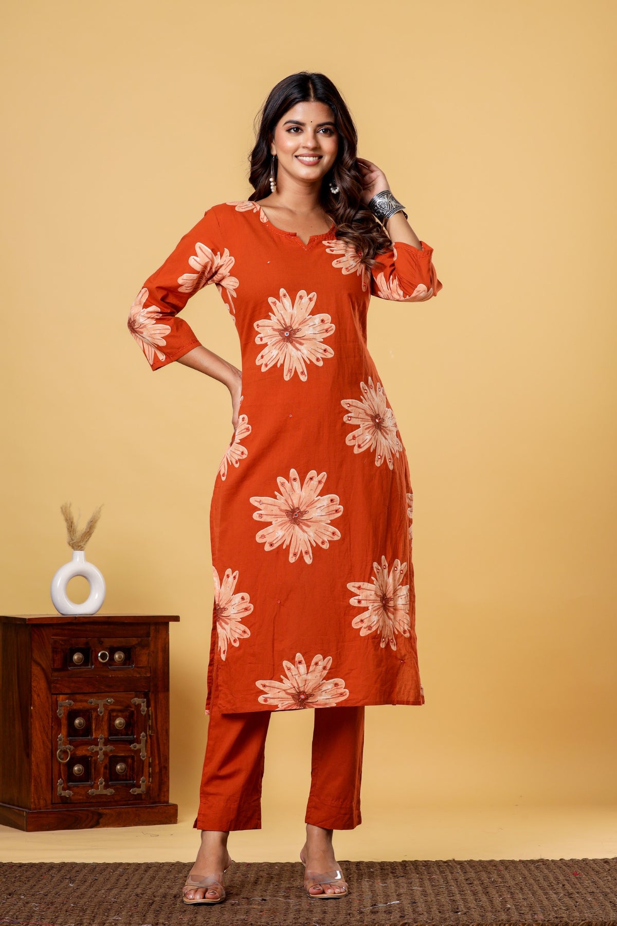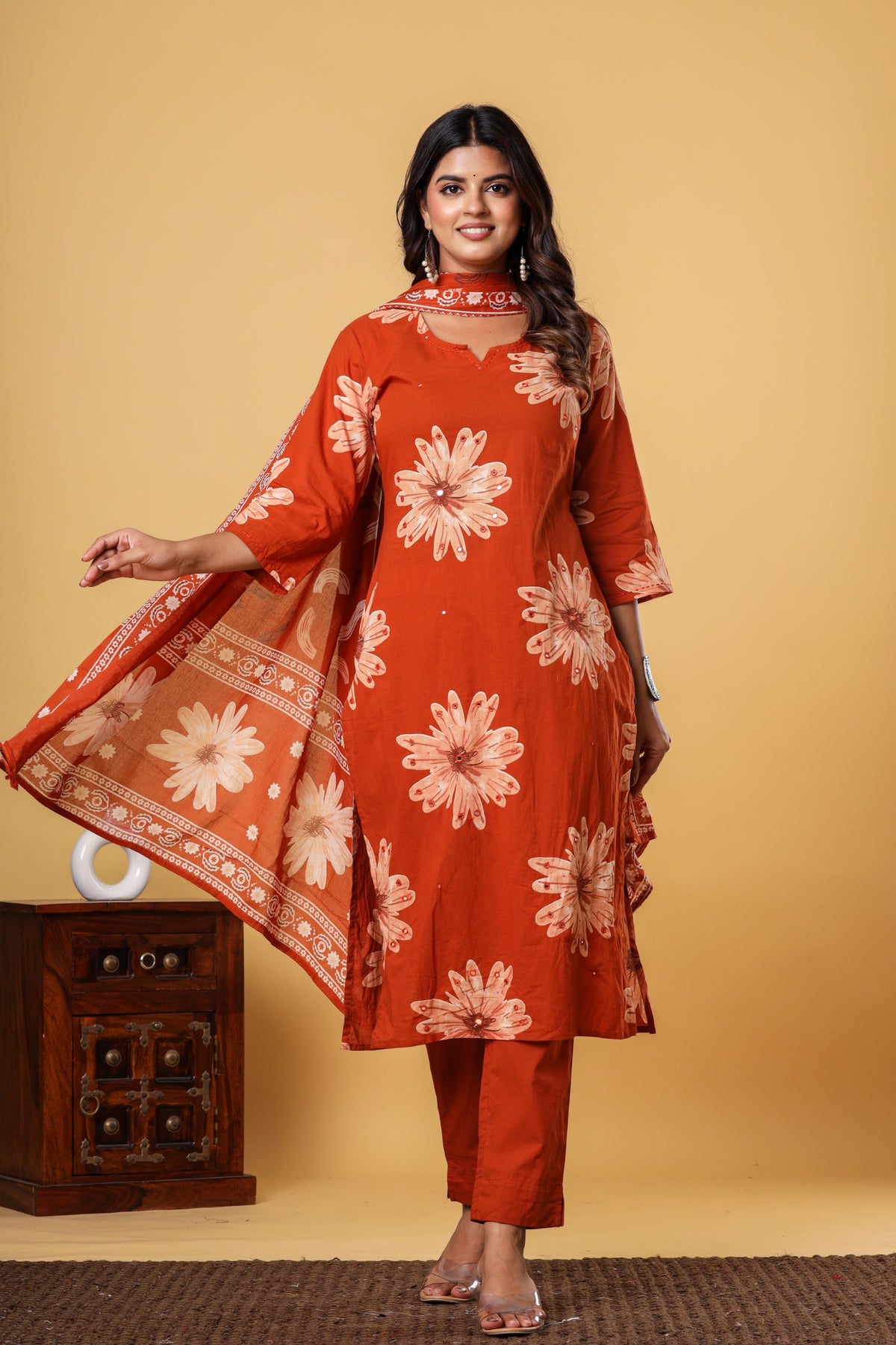 Festive Rust Floral Cotton Suit Set | Mirror Work