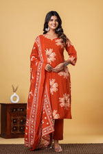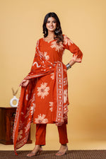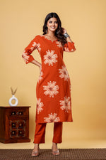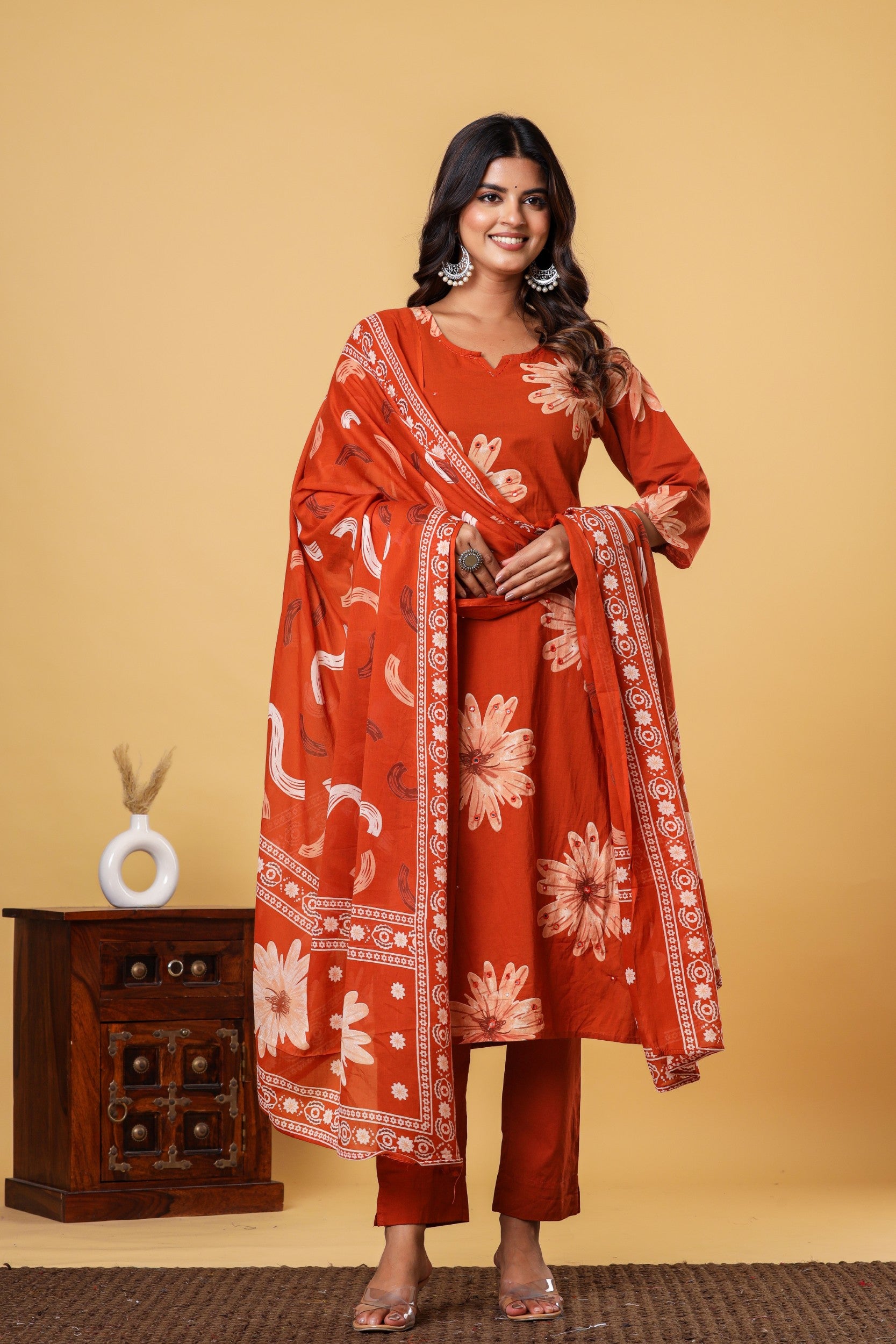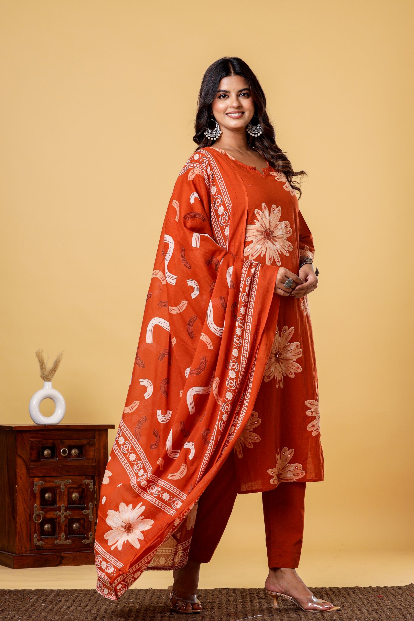 Embrace the warmth and joy of the winter festive season with this stunning rust-orange suit set. Crafted from premium, breathable cotton, this ensemble is perfectly comfortable for all-day celebrations and cozy at-home gatherings. The A-line kurta features a vibrant, large-scale painterly floral print, making a bold artistic statement.