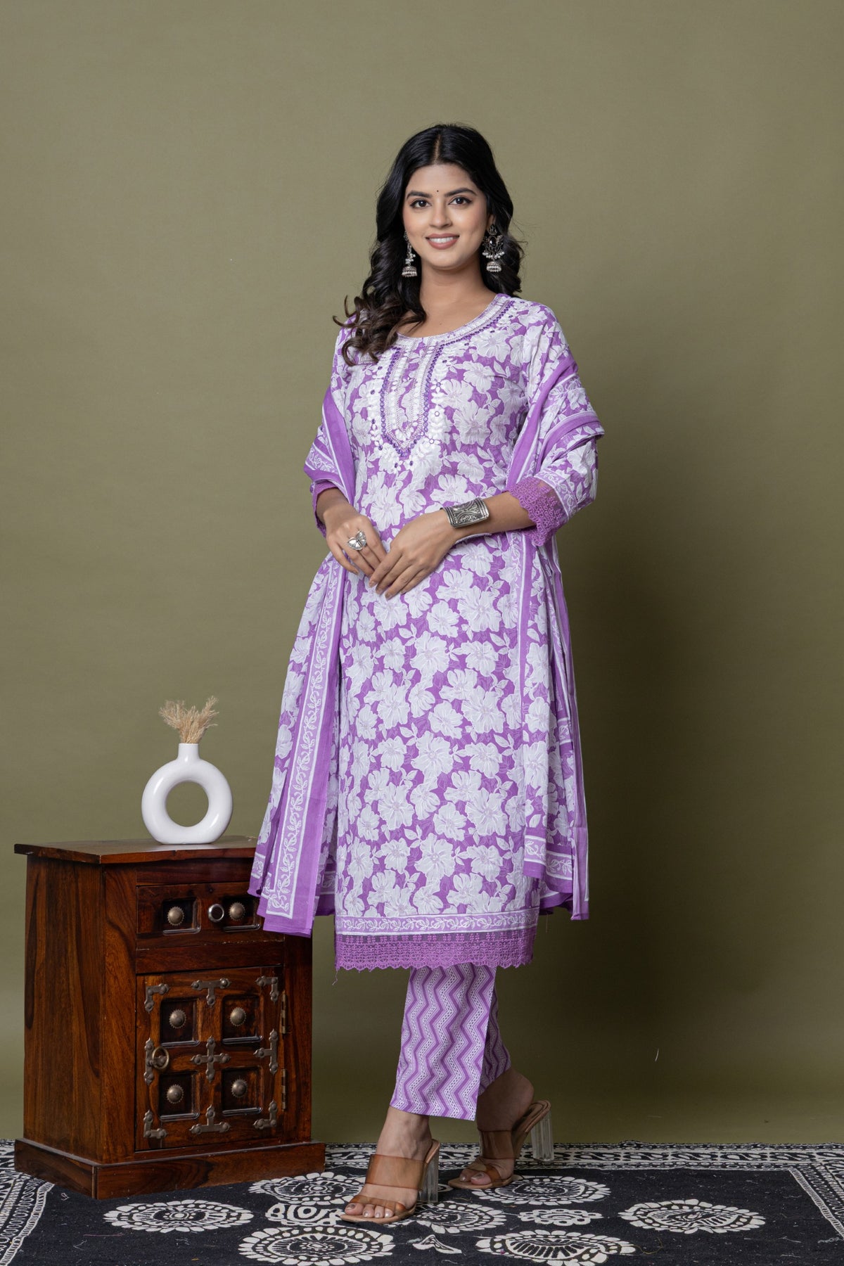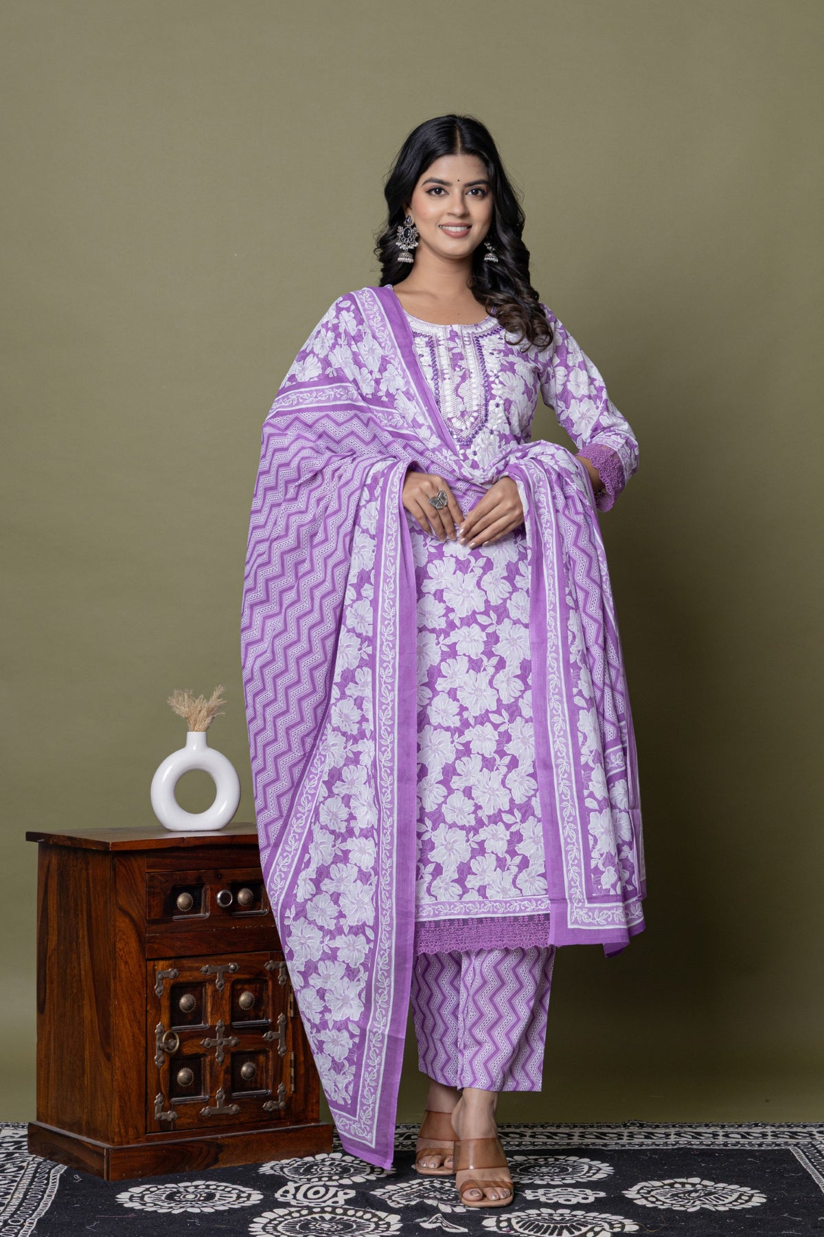 Lavender Embroidered Cotton Suit Set | Floral & Chevron Print