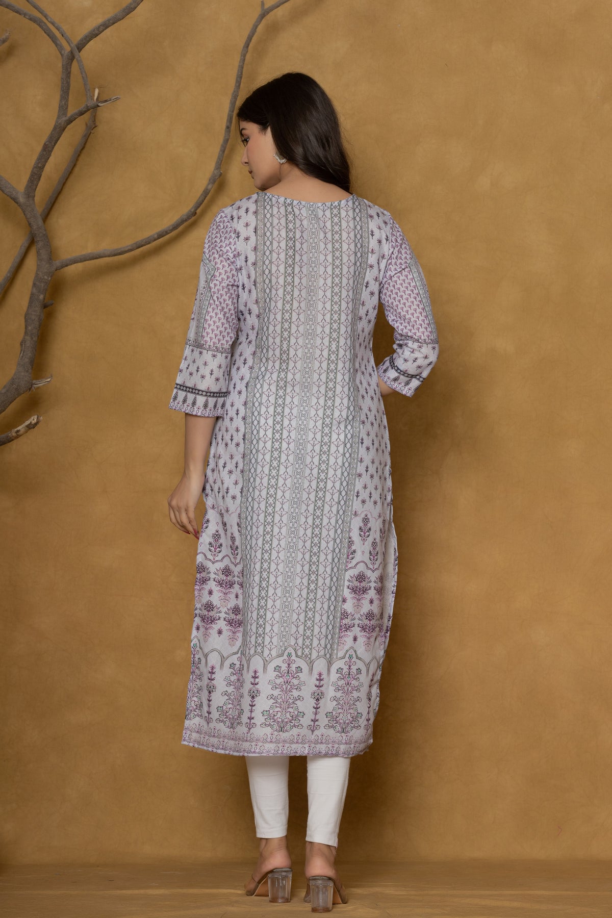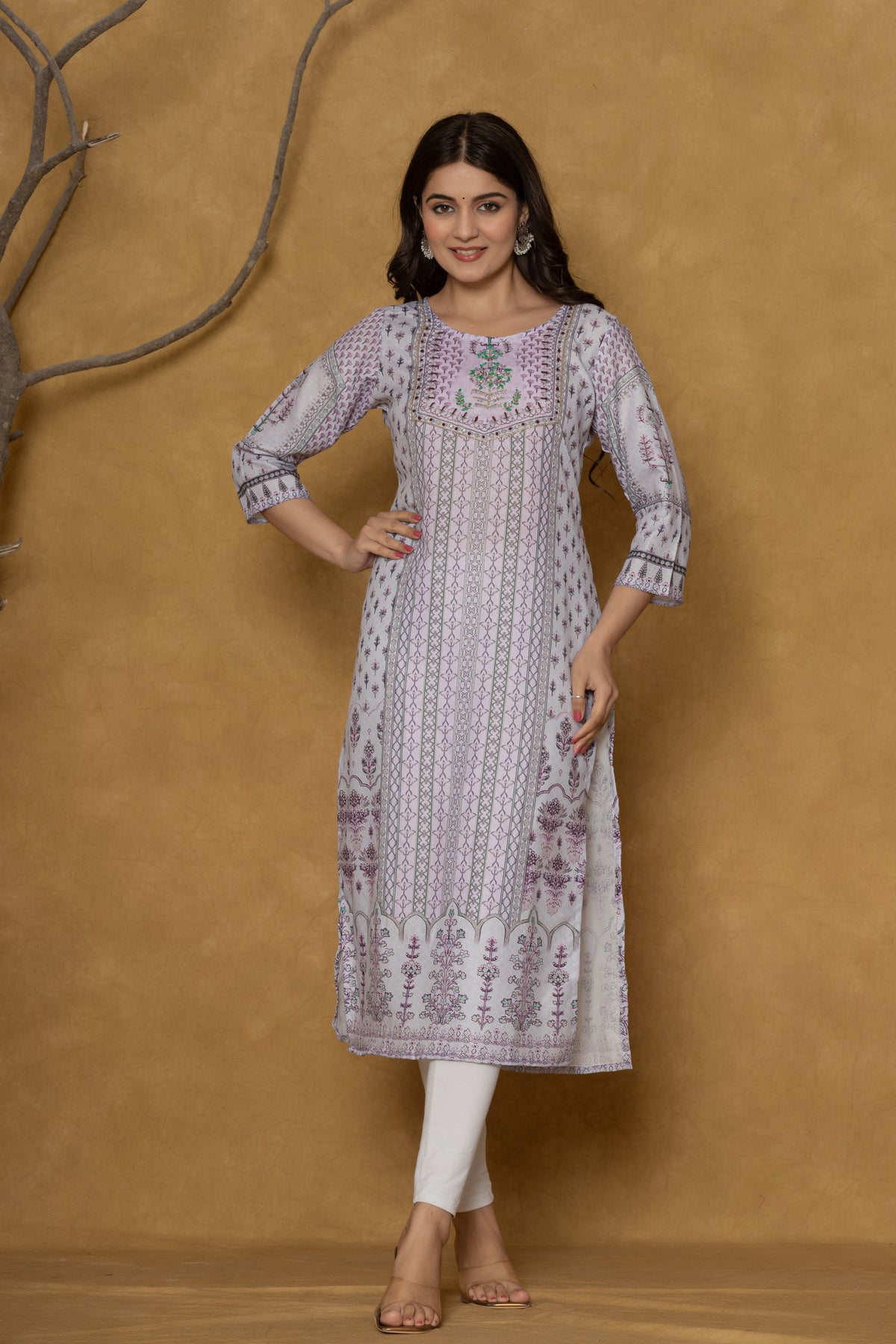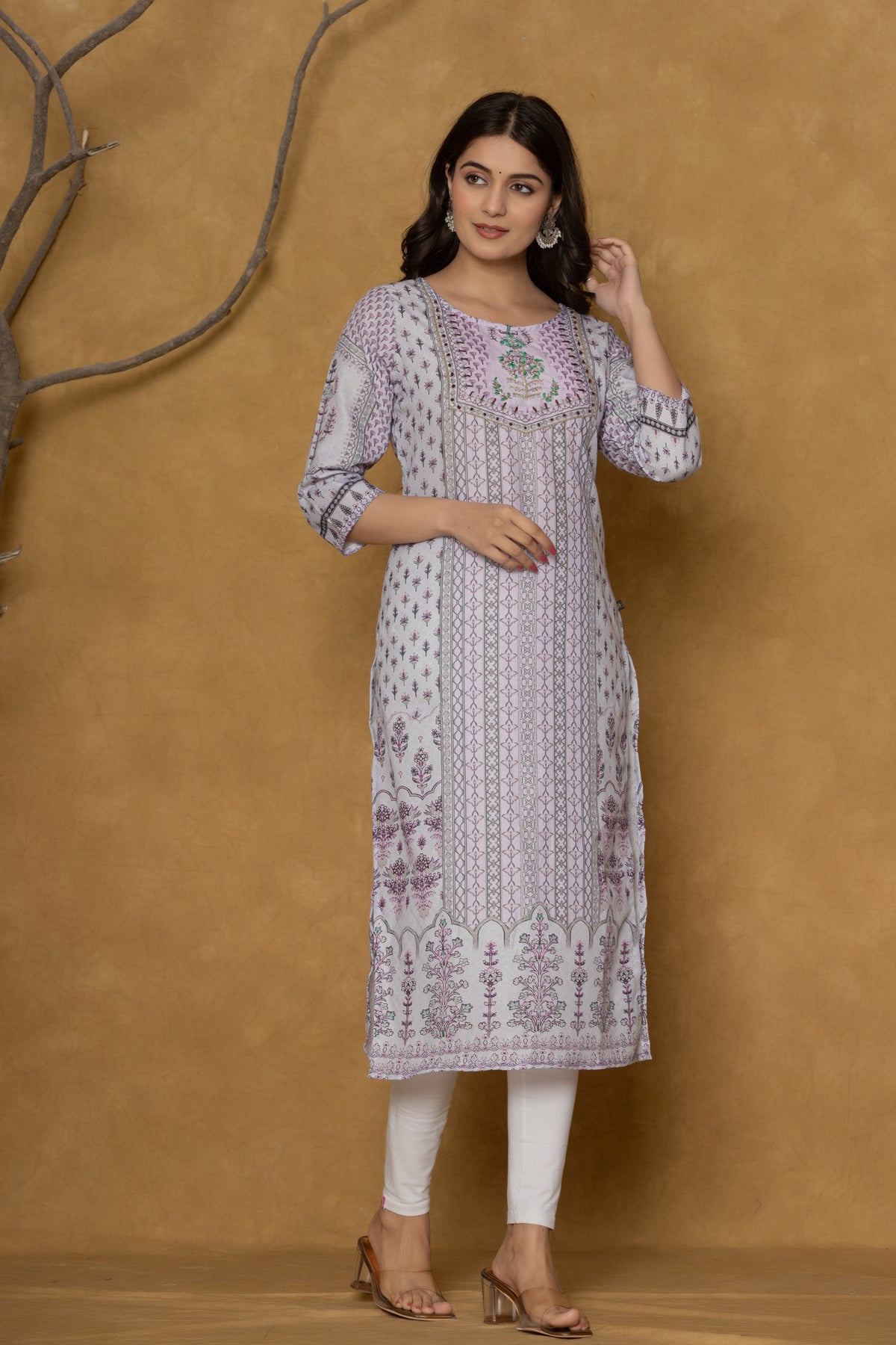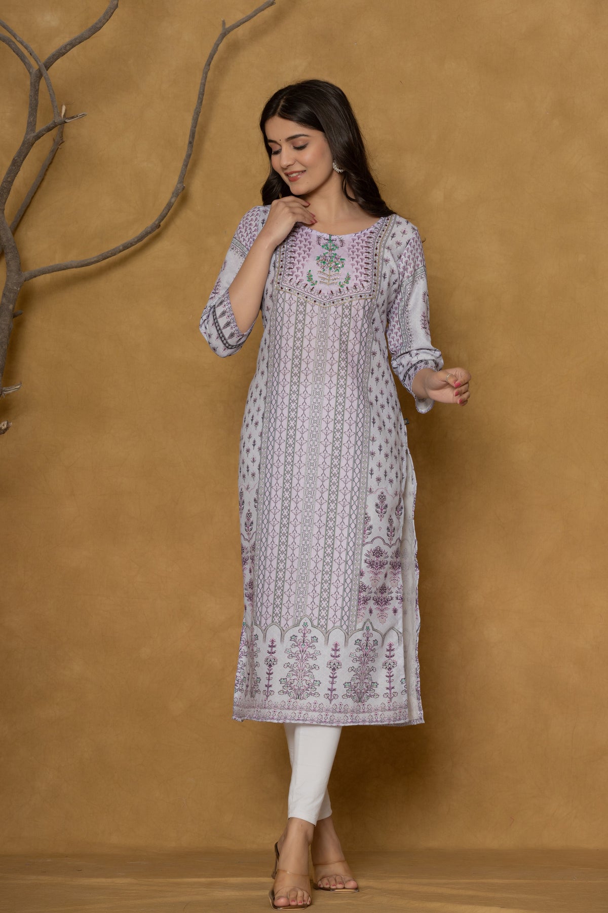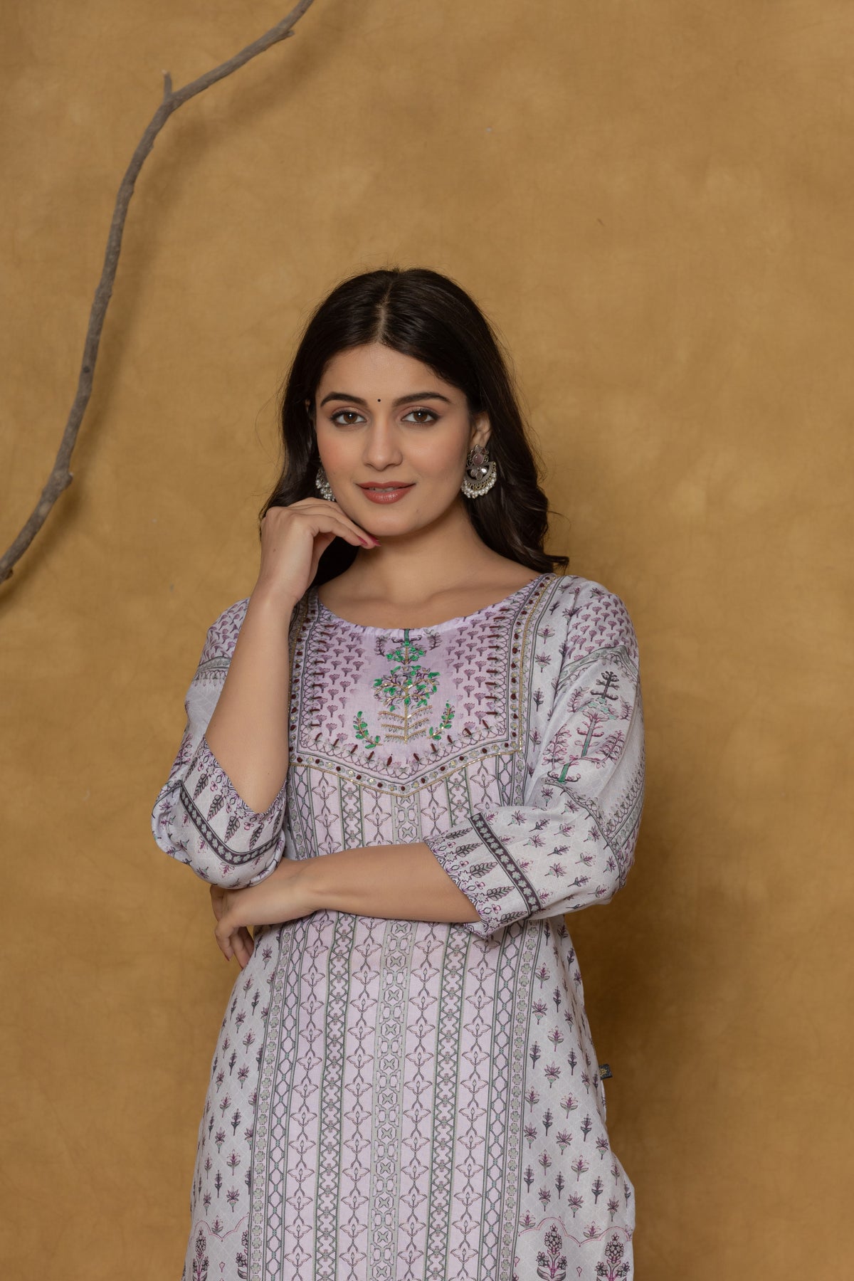 A soft lavender kurta with delicate handwork embellishing the round neckline. A perfect blend of femininity and sophistication.