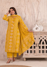 Embrace the warmth and joy of the winter festive season with this stunning mustard yellow suit set from The navra. Crafted from premium, breathable cotton, this ensemble is perfectly comfortable for all-day celebrations and cozy at-home gatherings. The A-line kurta features an authentic, all-over Jaipuri Bandhani-inspired print, arranged in elegant vertical panels that create a flattering silhouette.