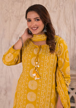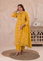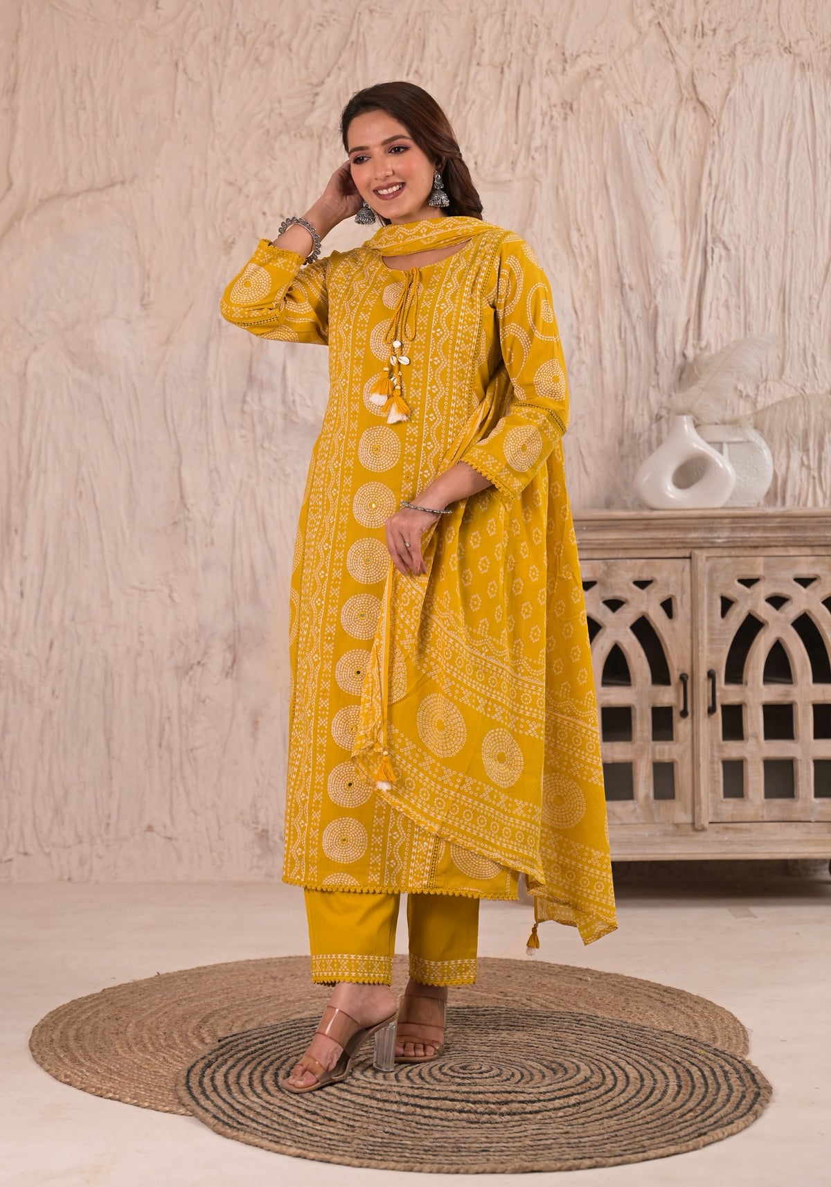 Mustard Yellow Bandhani Print Cotton Suit Set | Tassel Detail