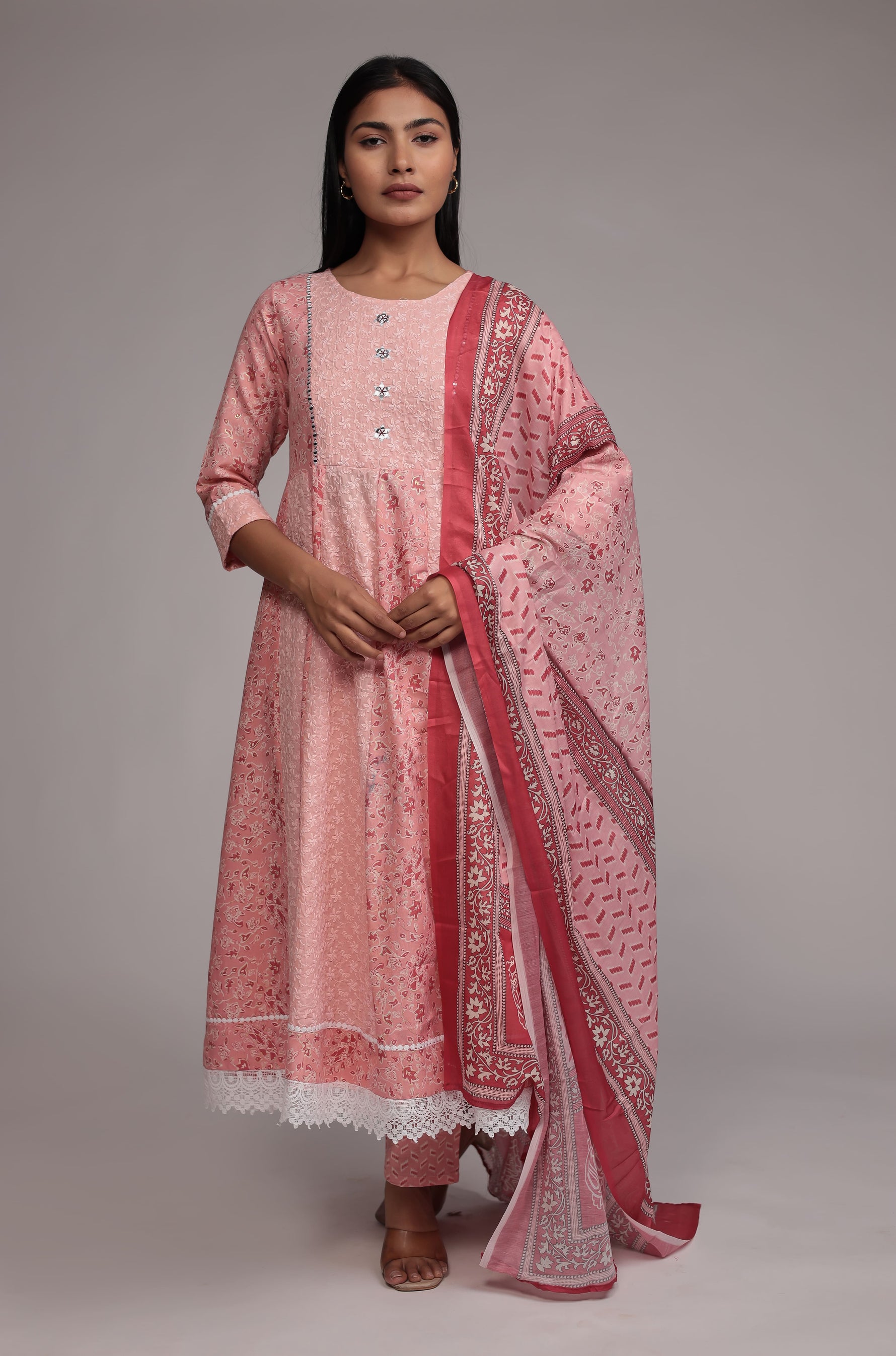 Peach schiffli Anarkali Dupatta Set Detailed with mirror work