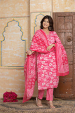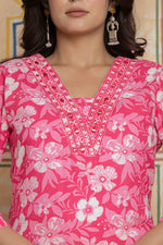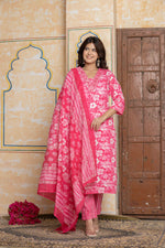 Rani Pink Mirror Work Cotton Suit Set | Floral & Leheriya Print