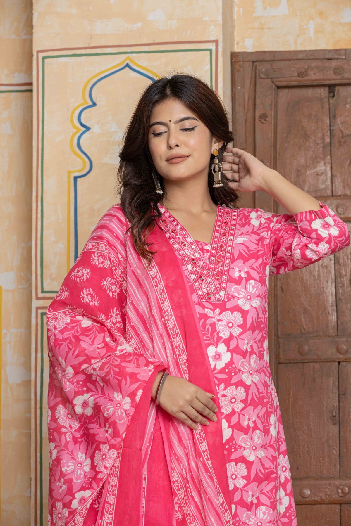 • Dynamic Print Mix: A cheerful floral print on the kurta, expertly paired with a traditional Leheriya print on the trousers and dupatta.