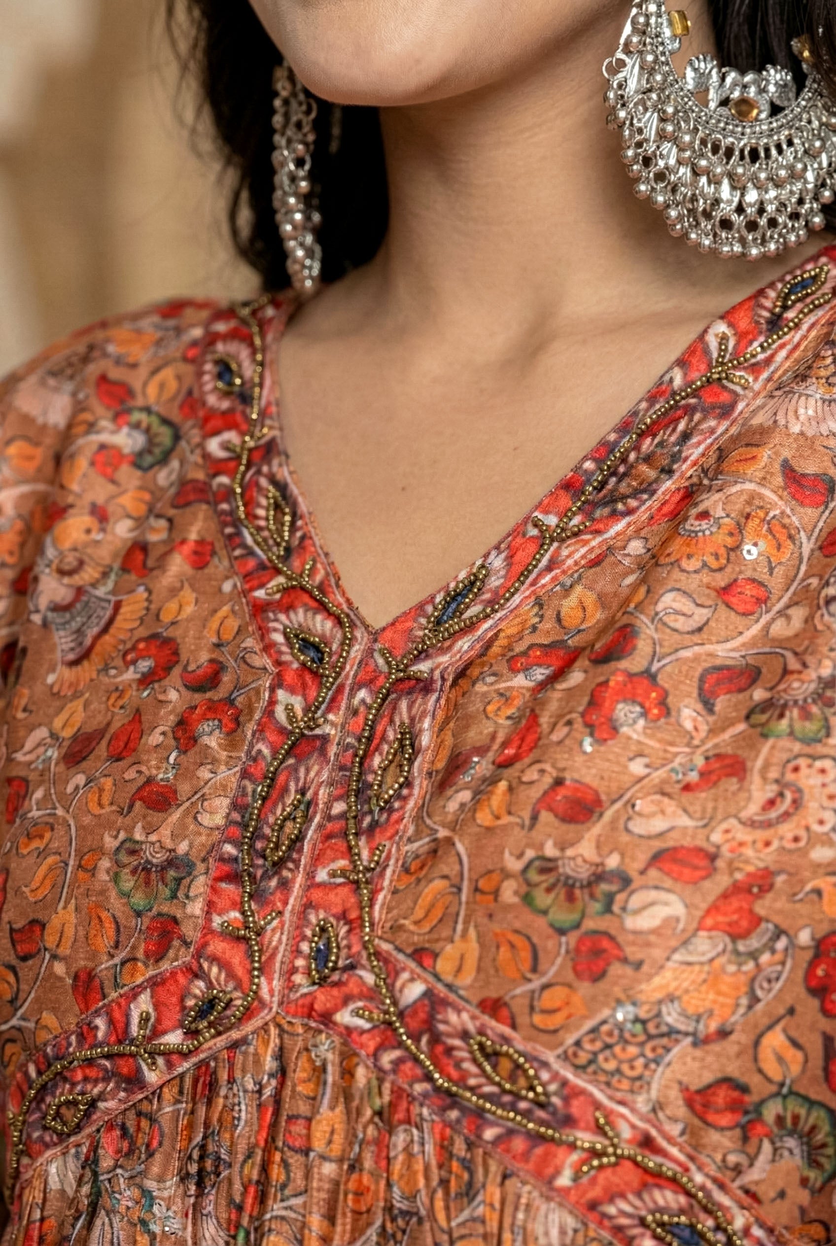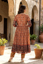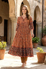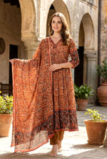 Immerse yourself in the warm, inviting glow of this stunning Rust Brown suit set from The navra. A celebration of rich color and heritage artistry, this ensemble is designed to make a sophisticated impression at any grand occasion. The lustrous crushed chinnon kurta features an intricate, Kalamkari-inspired digital print, evoking the beauty of traditional Indian textiles. Its flared Anarkali silhouette moves with breathtaking grace, ensuring you are the center of attention.
