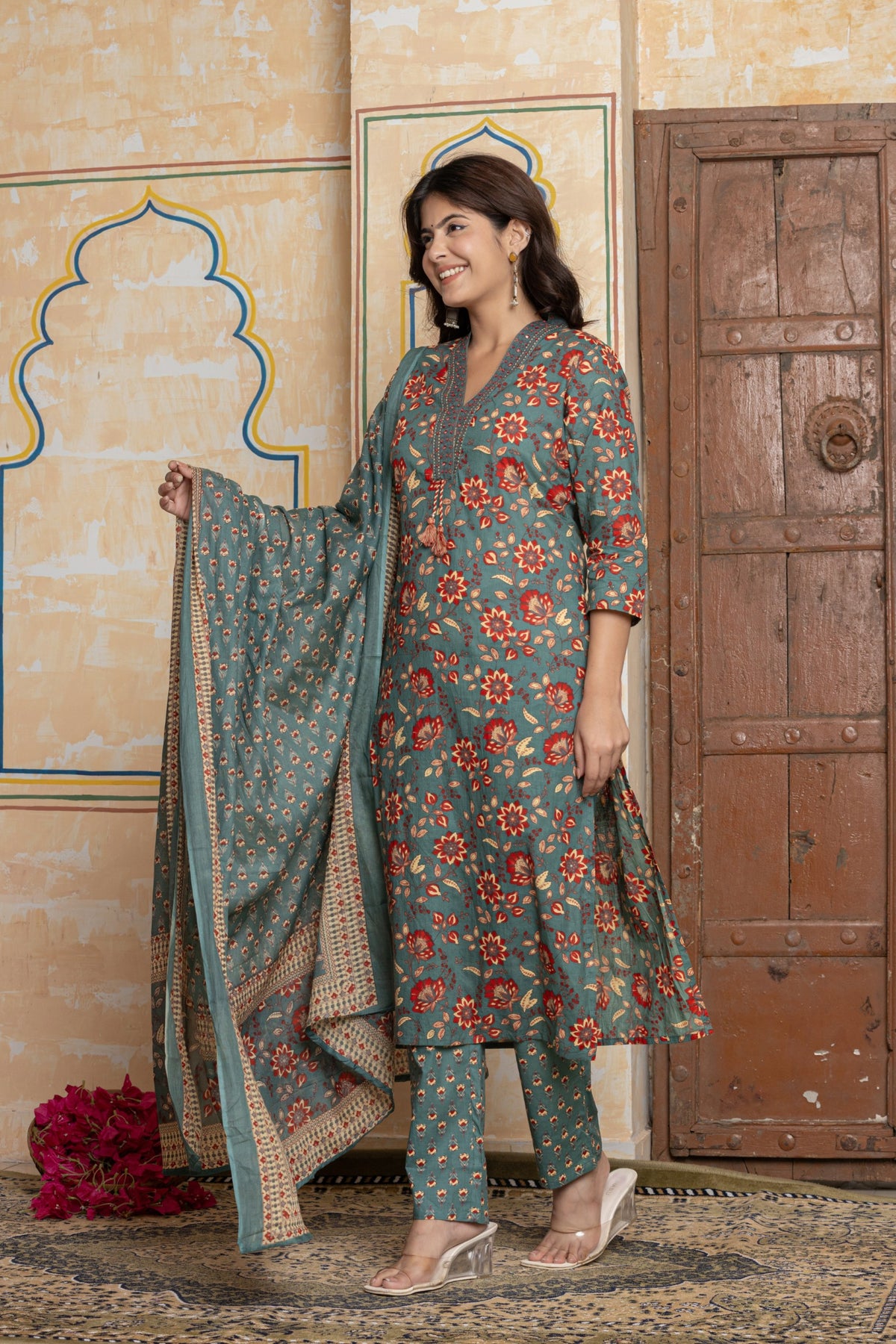 Vibrant Jaipuri Print: A timeless, all-over floral jaal on the kurta, paired with a matching buti print on the dupatta and trousers.