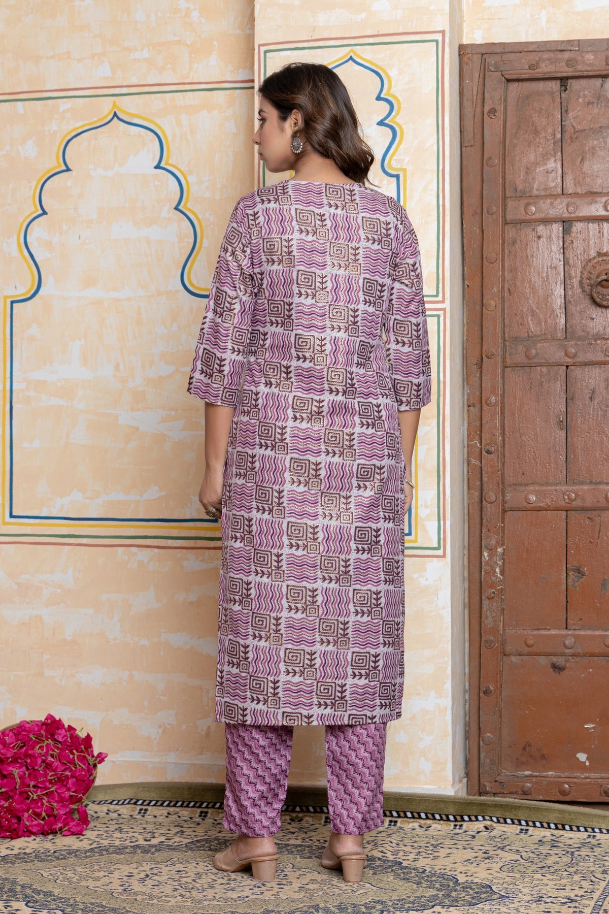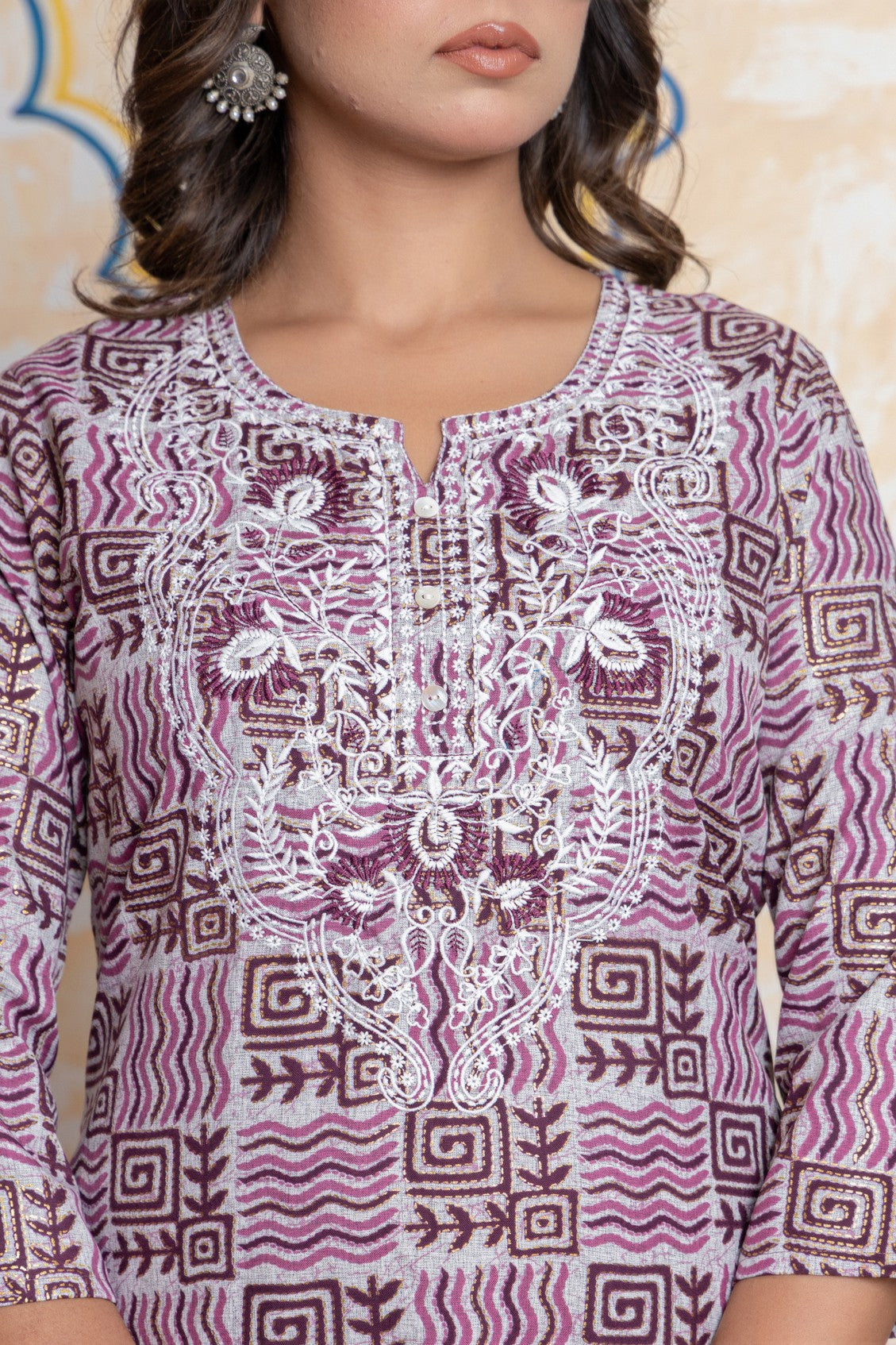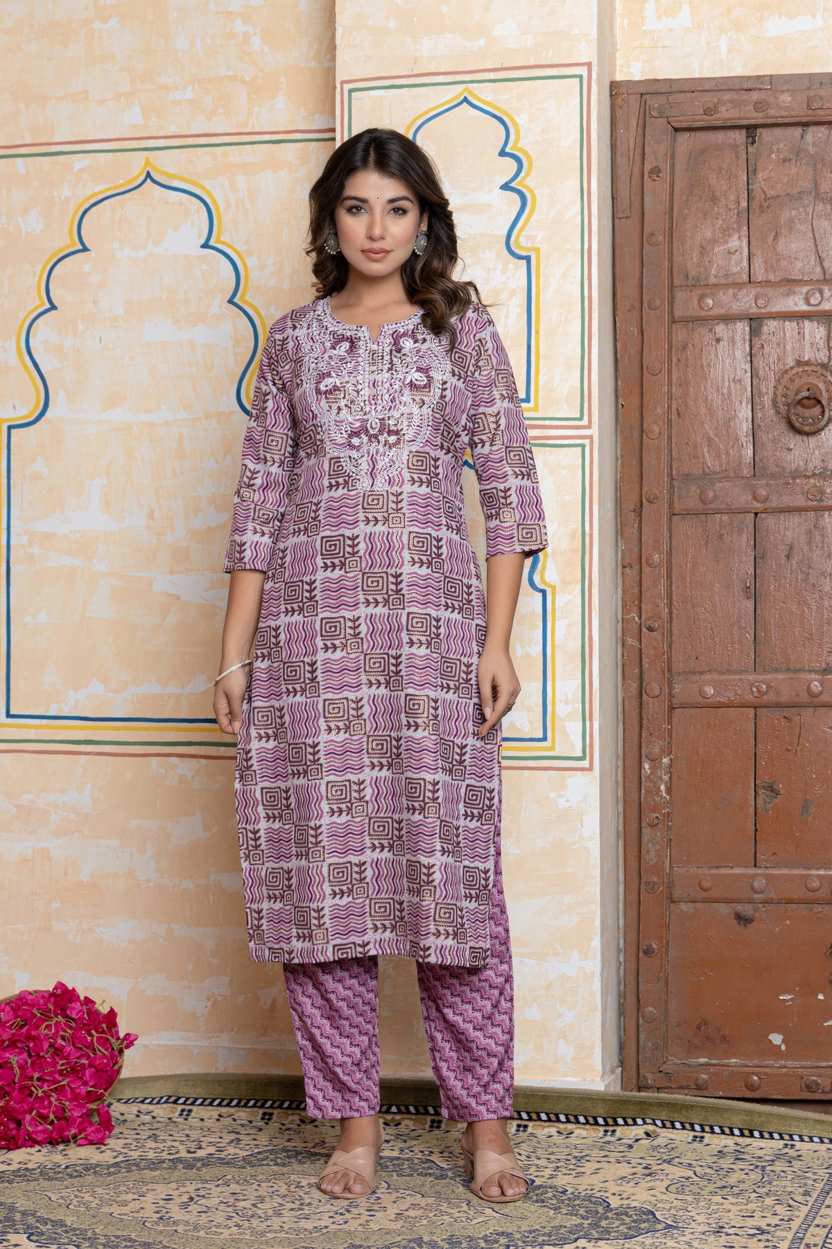 Step into a garden of grace with this enchanting Dusty Pink Kurta Set from The Navra. A beautiful expression of feminine charm, this ensemble is crafted from a soft, breathable cotton blend perfect for all-day comfort. The kurta's sophisticated dusty pink canvas is adorned with delicate floral motifs, while a panel of pristine white embroidery on the neckline adds a touch of exquisite, handcrafted elegance.
