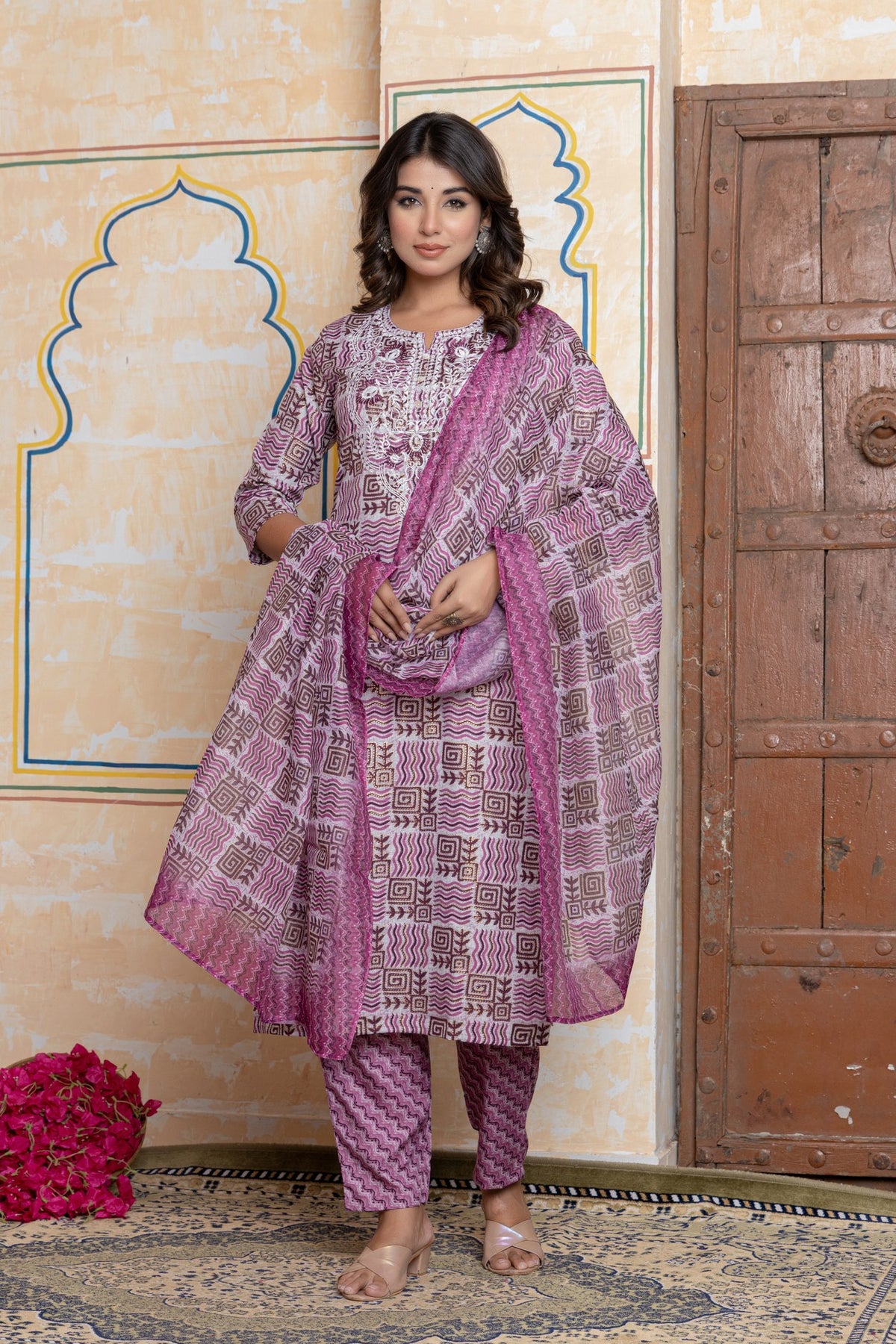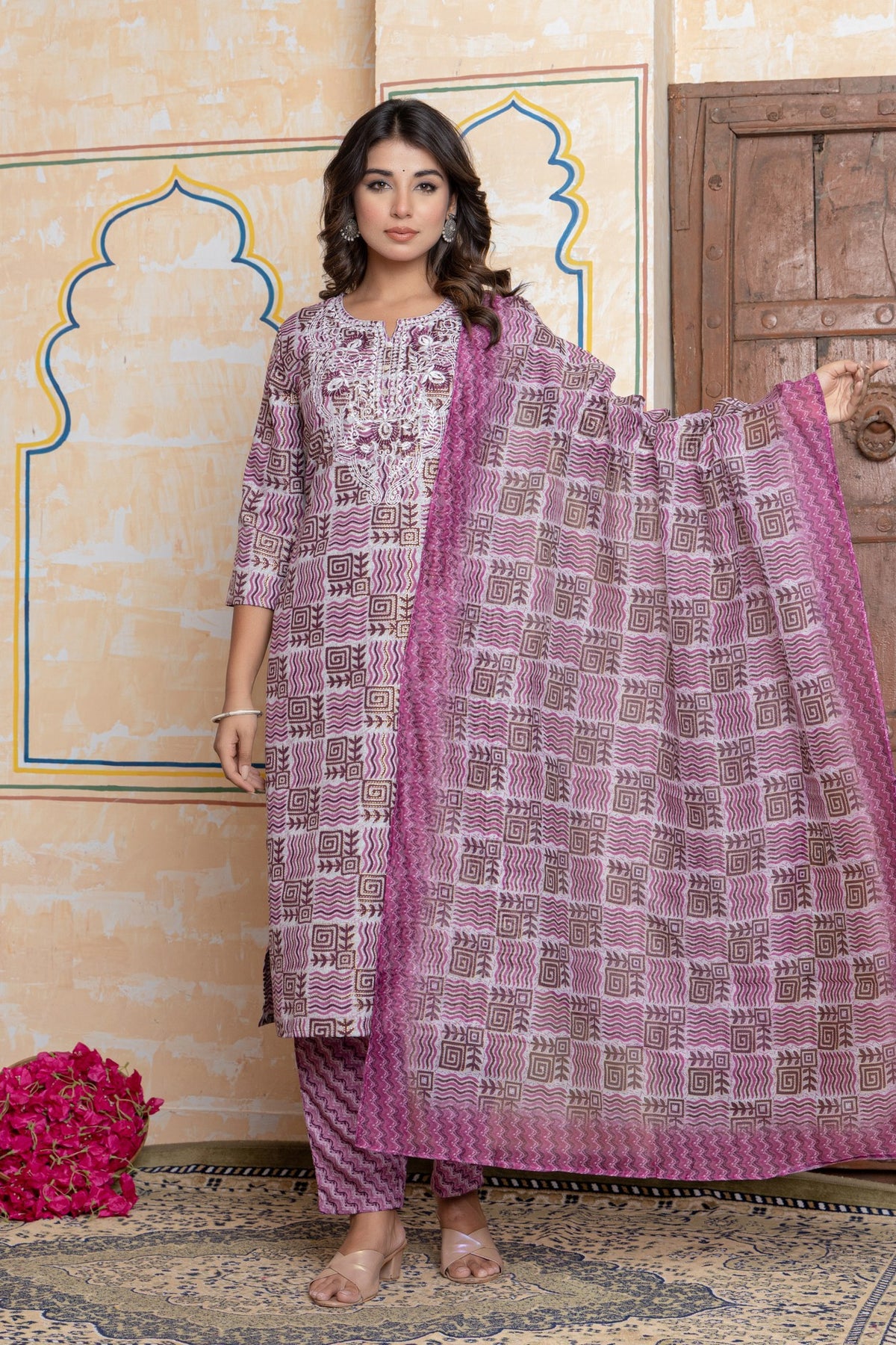 The Navra Dusty Pink Floral Cotton Kurta Set with Embroidery & Dupatta