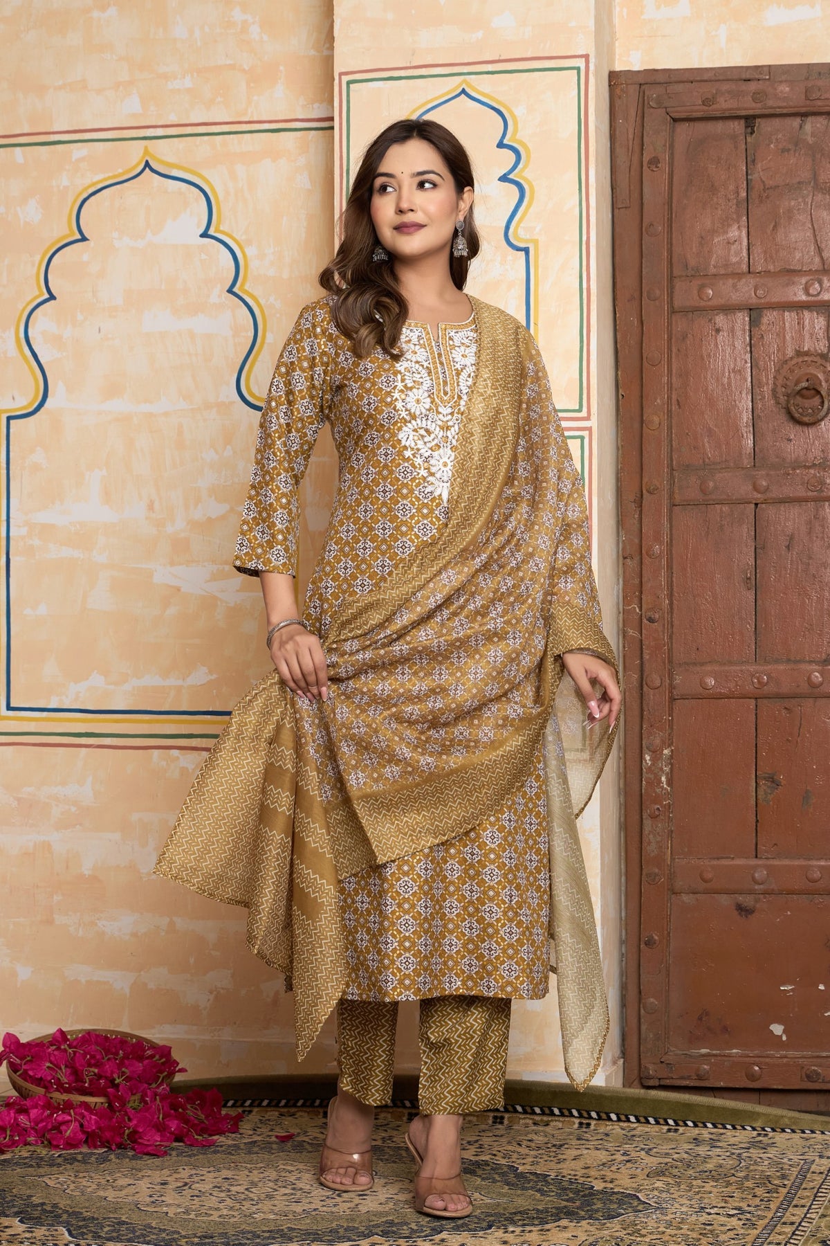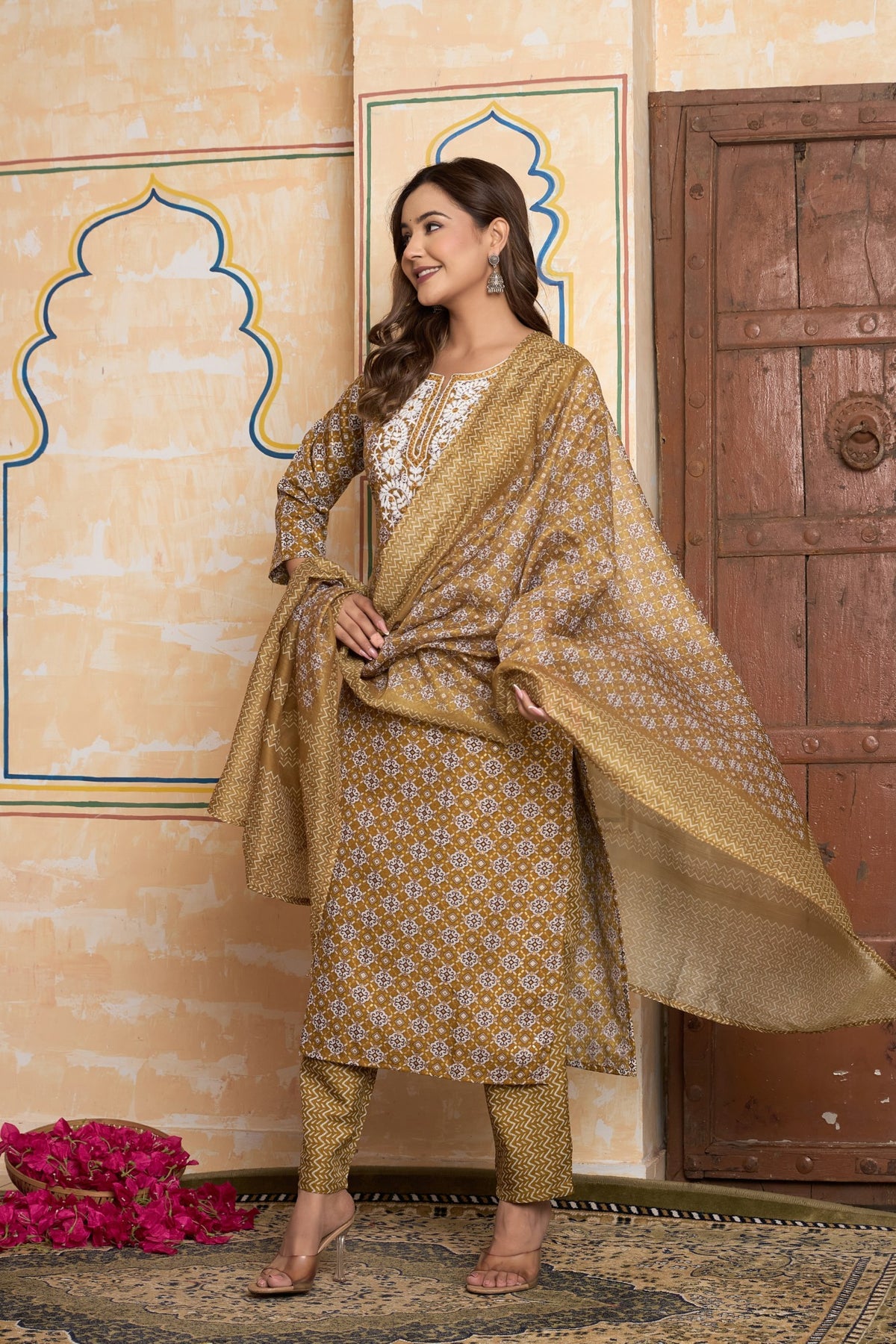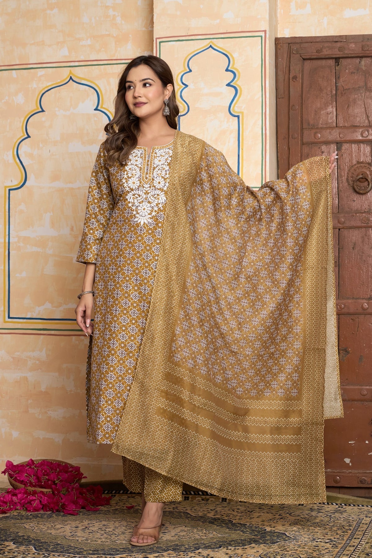 Complement the warm, golden tones of this outfit with classic gold jewelry, such as jhumkas or studs. Pearls would also create a stunning contrast against the white embroidery. For footwear, choose elegant gold, tan, or beige juttis, kolhapuri sandals, or comfortable block heels.
