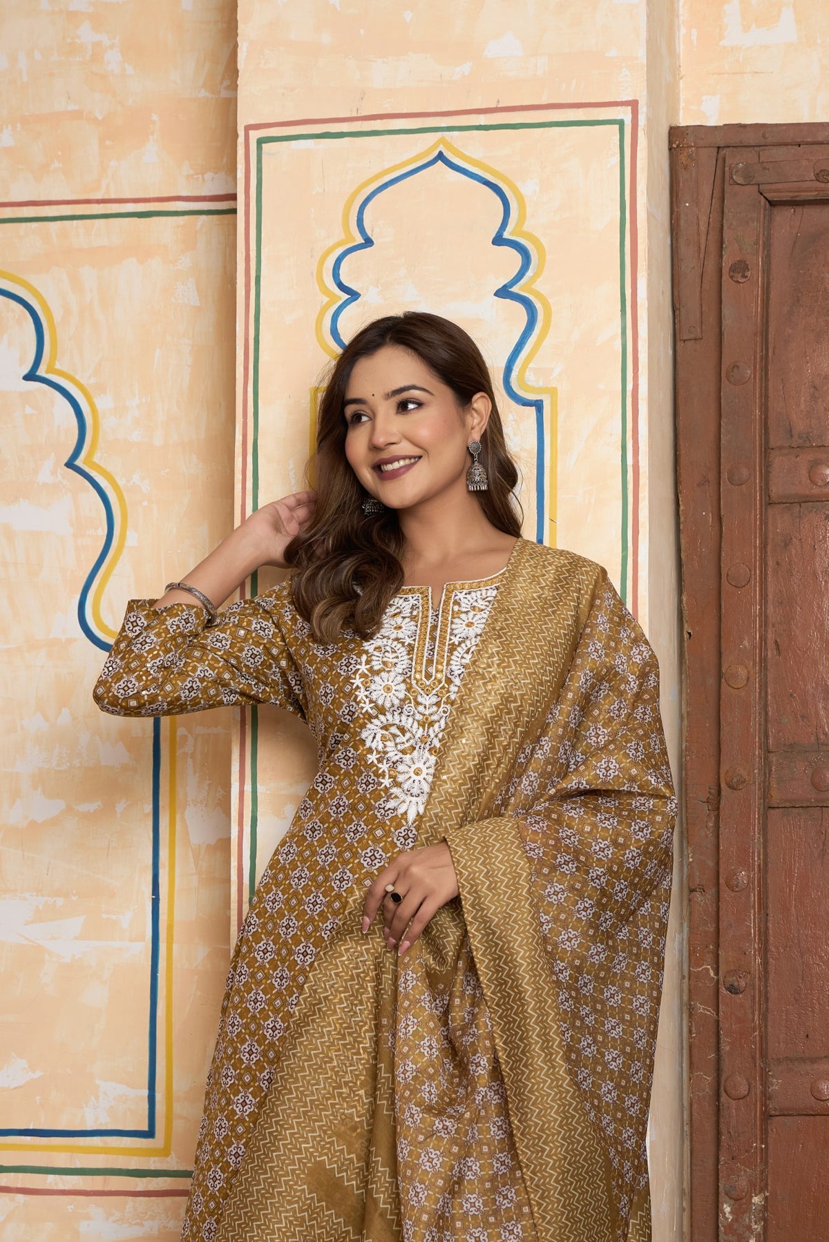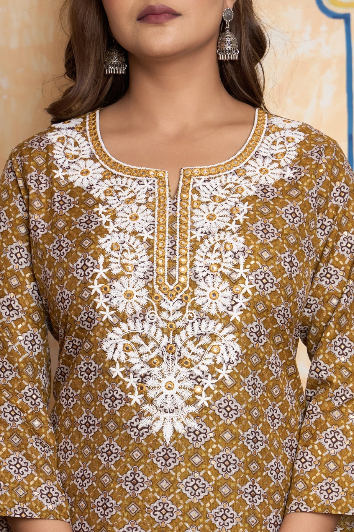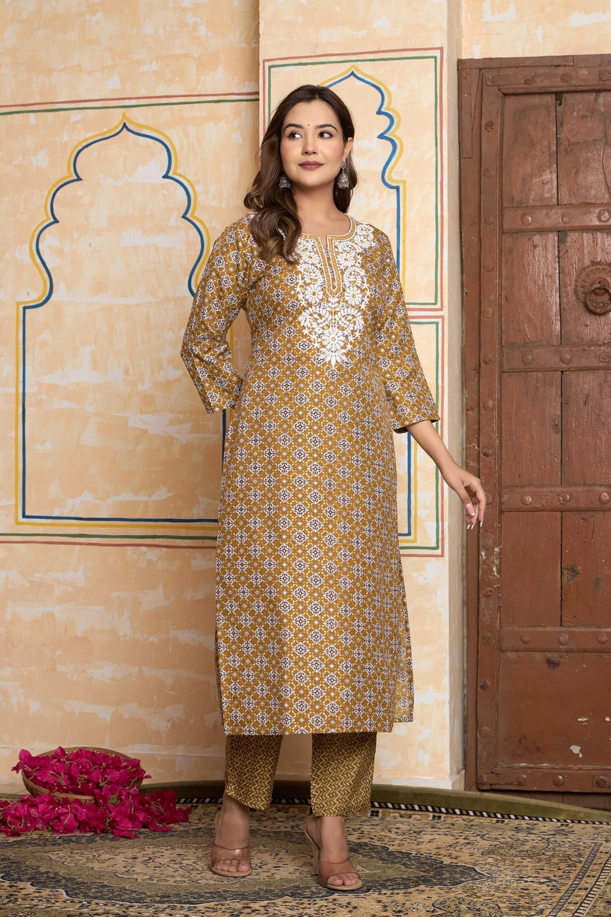 Complement the warm, golden tones of this outfit with classic gold jewelry, such as jhumkas or studs. Pearls would also create a stunning contrast against the white embroidery. For footwear, choose elegant gold, tan, or beige juttis, kolhapuri sandals, or comfortable block heels.