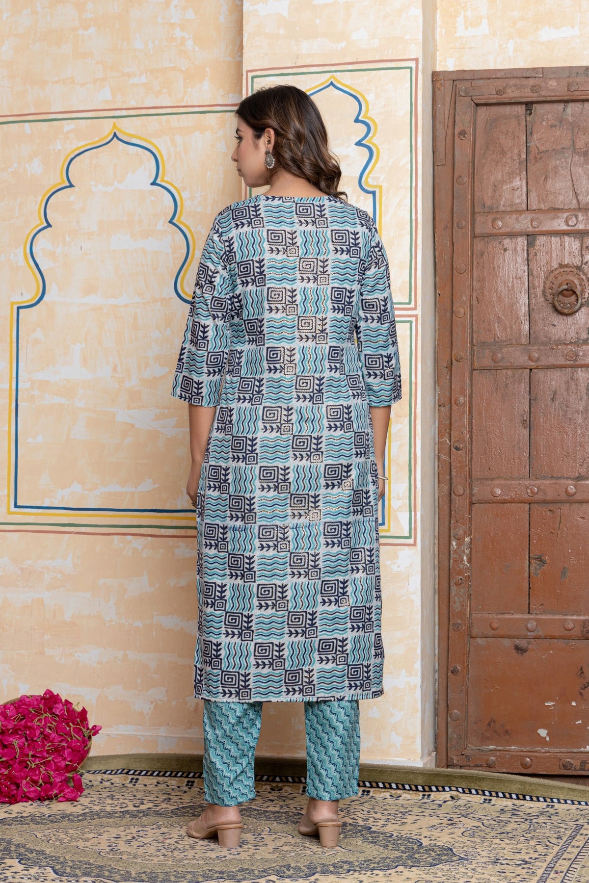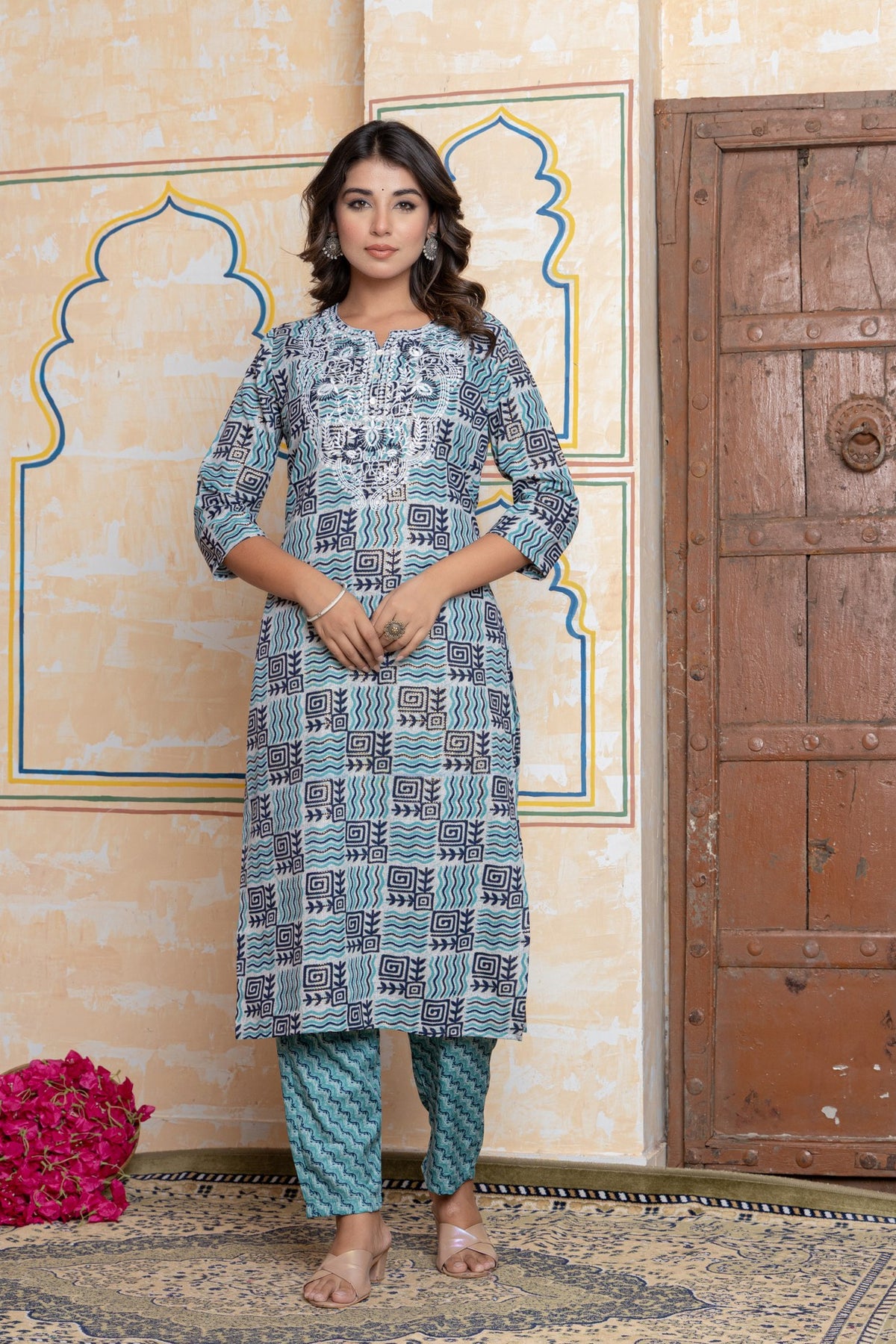 Pattern: Jaipuri Block Print, Geometric Print, Neck Embroidery