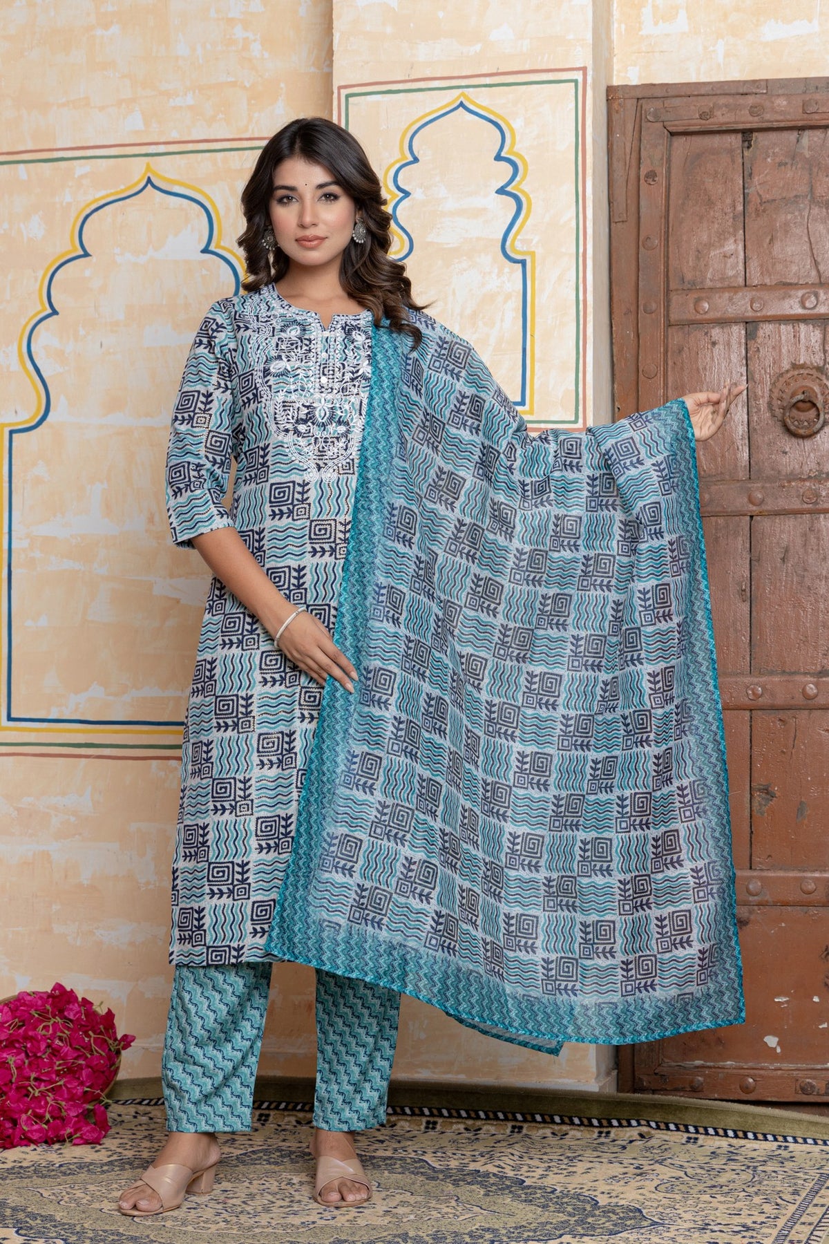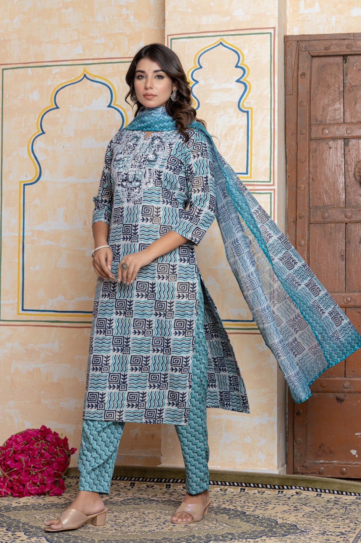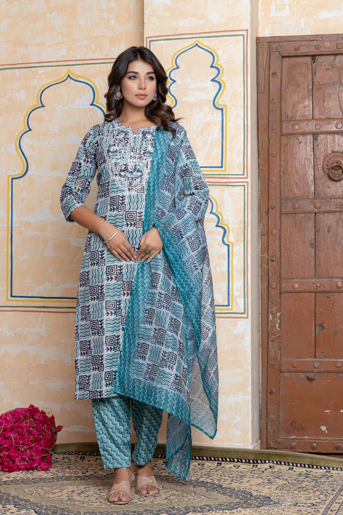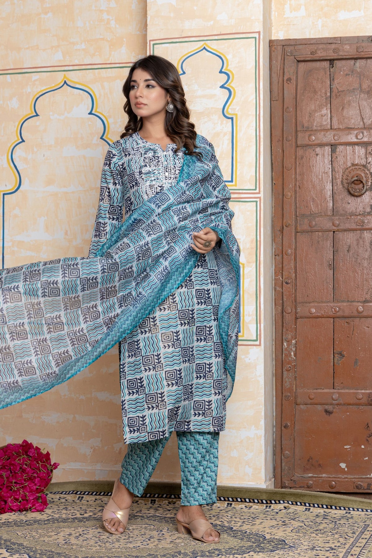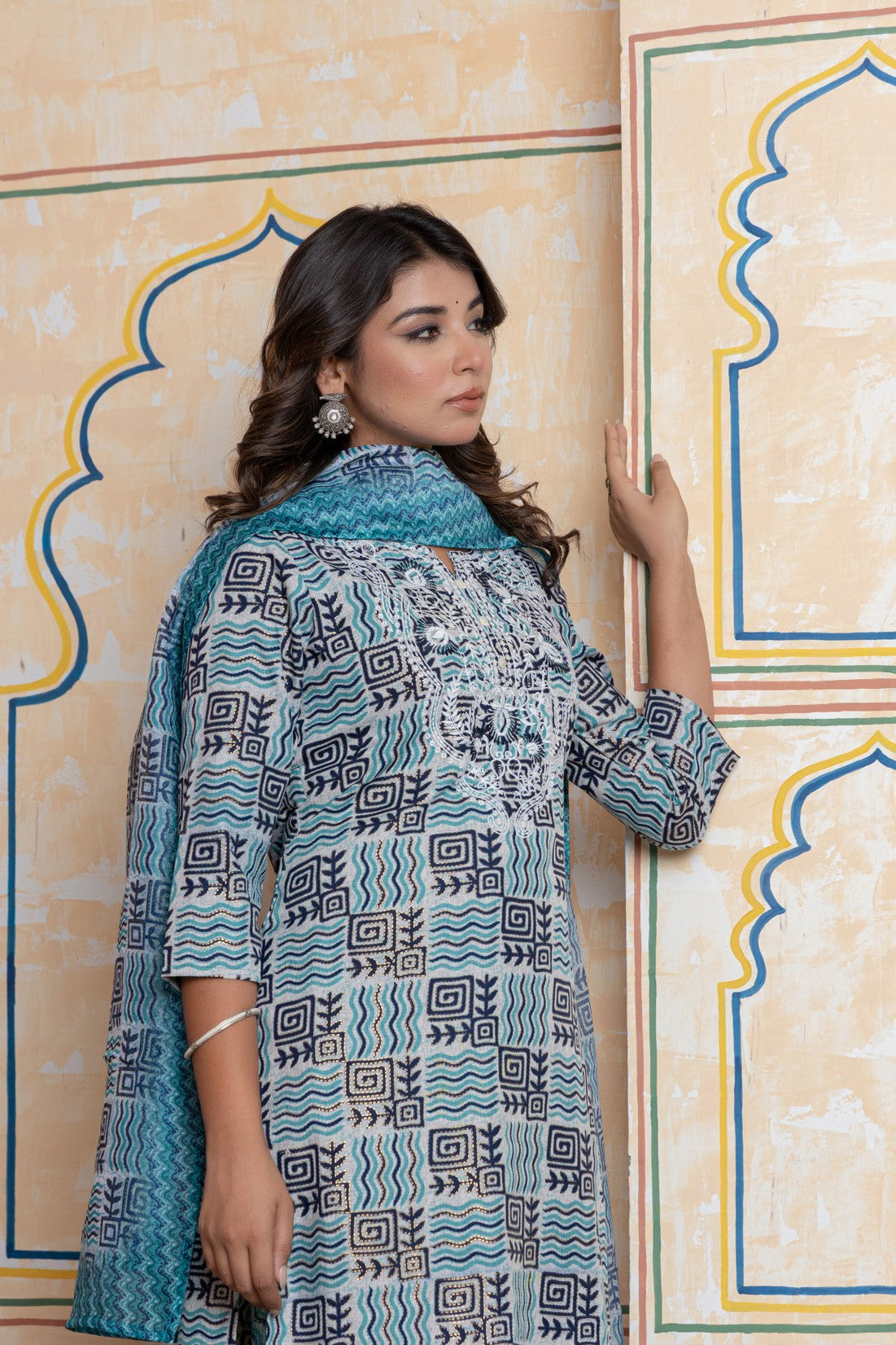 The Navra Indigo Blue & Grey Printed Cotton Kurta Set with Embroidery & Dupatta