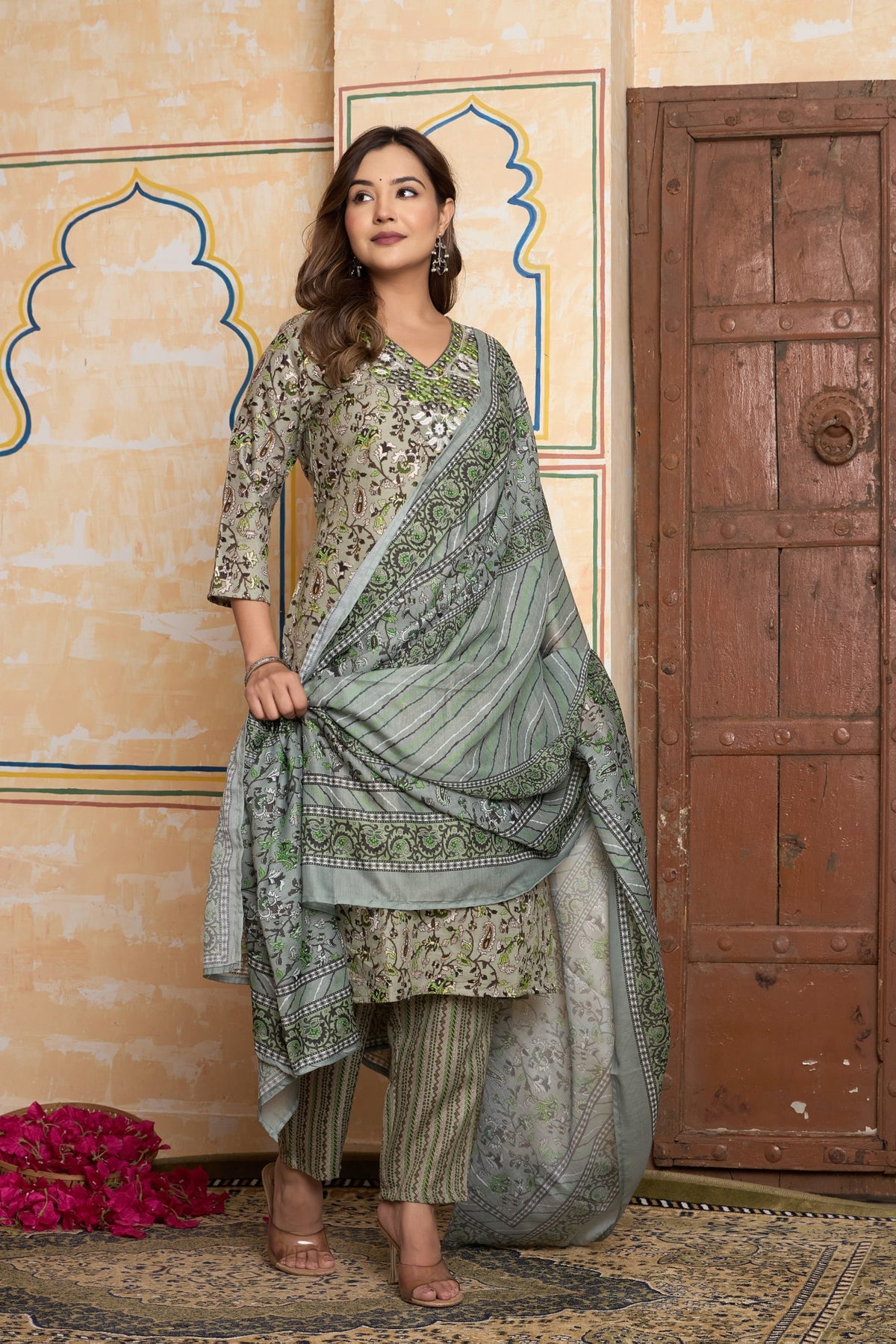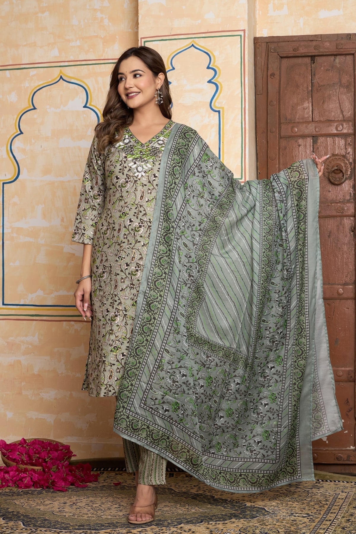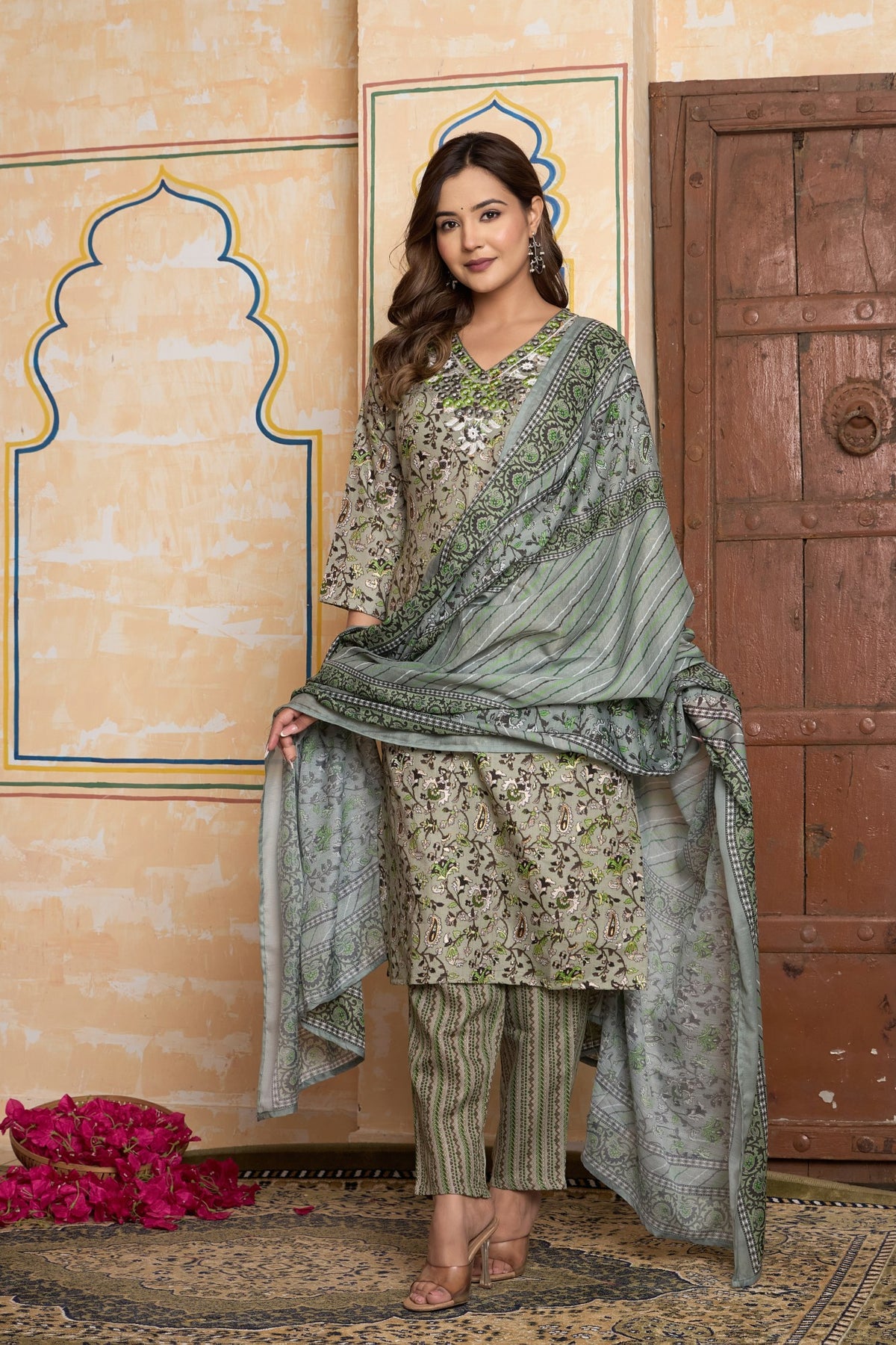 Illuminate your style with this exquisite Sage Green and Beige Kurta Set from The Navra. This ensemble is a perfect marriage of earthy, elegant tones and festive shimmer, designed for special occasions. Crafted from a soft, comfortable cotton blend, the kurta's chic beige canvas is detailed with delicate floral prints in serene sage green. The true highlight is the dazzling V-neckline, adorned with intricat embroidery that catches the light with every movement, adding a touch of celebratory glamour.