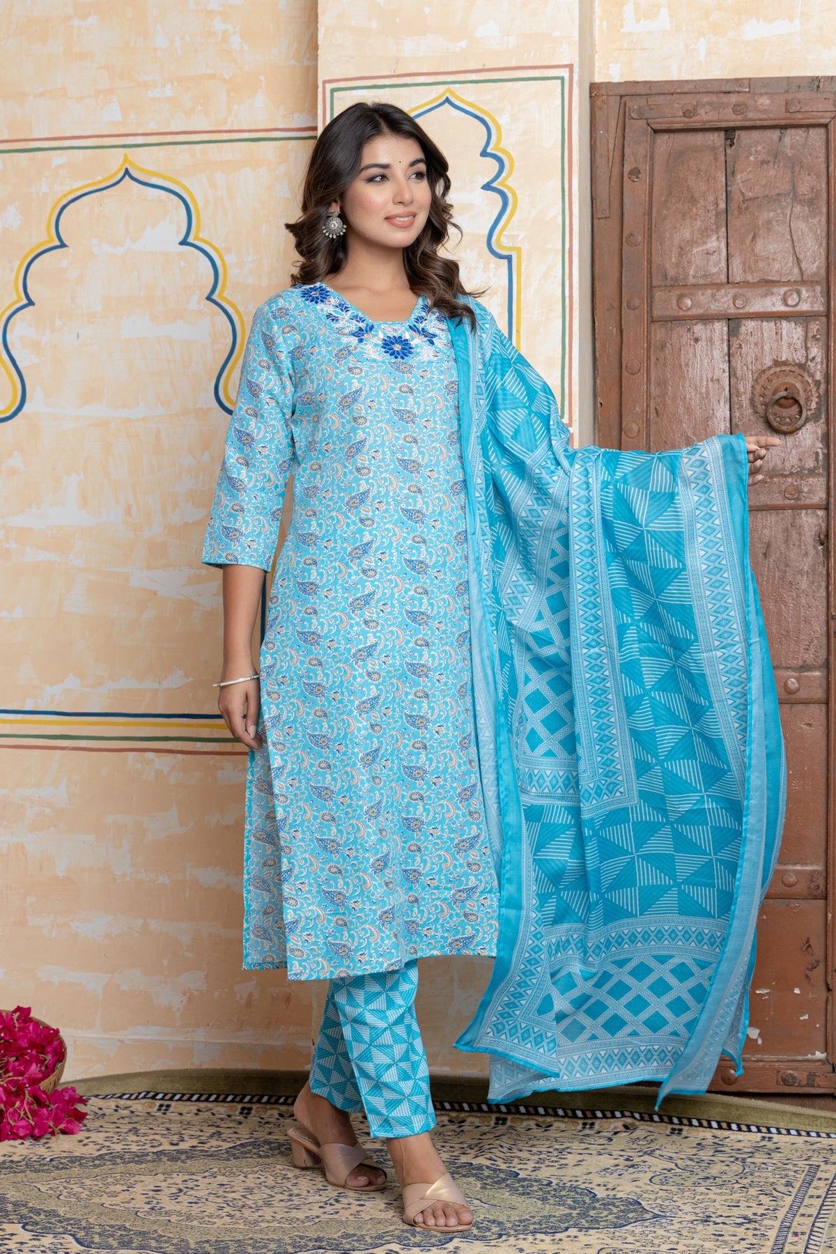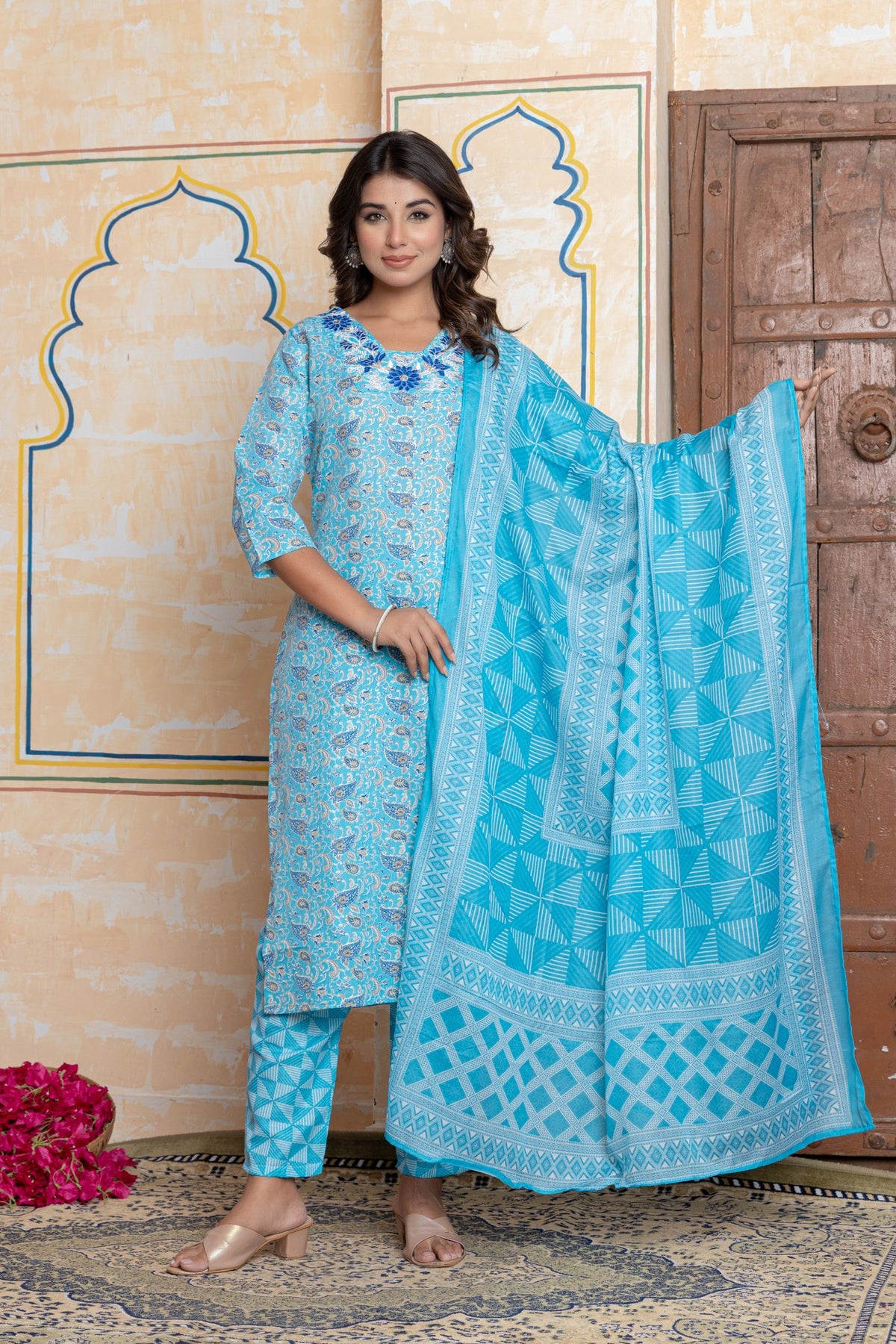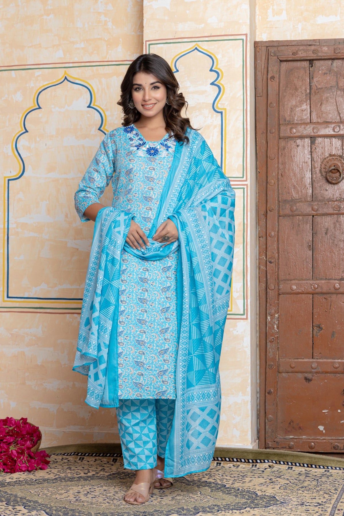 Complete Three-Piece Set: Includes a straight-fit kurta, contrasting pants, and a stunning turquoise dupatta.