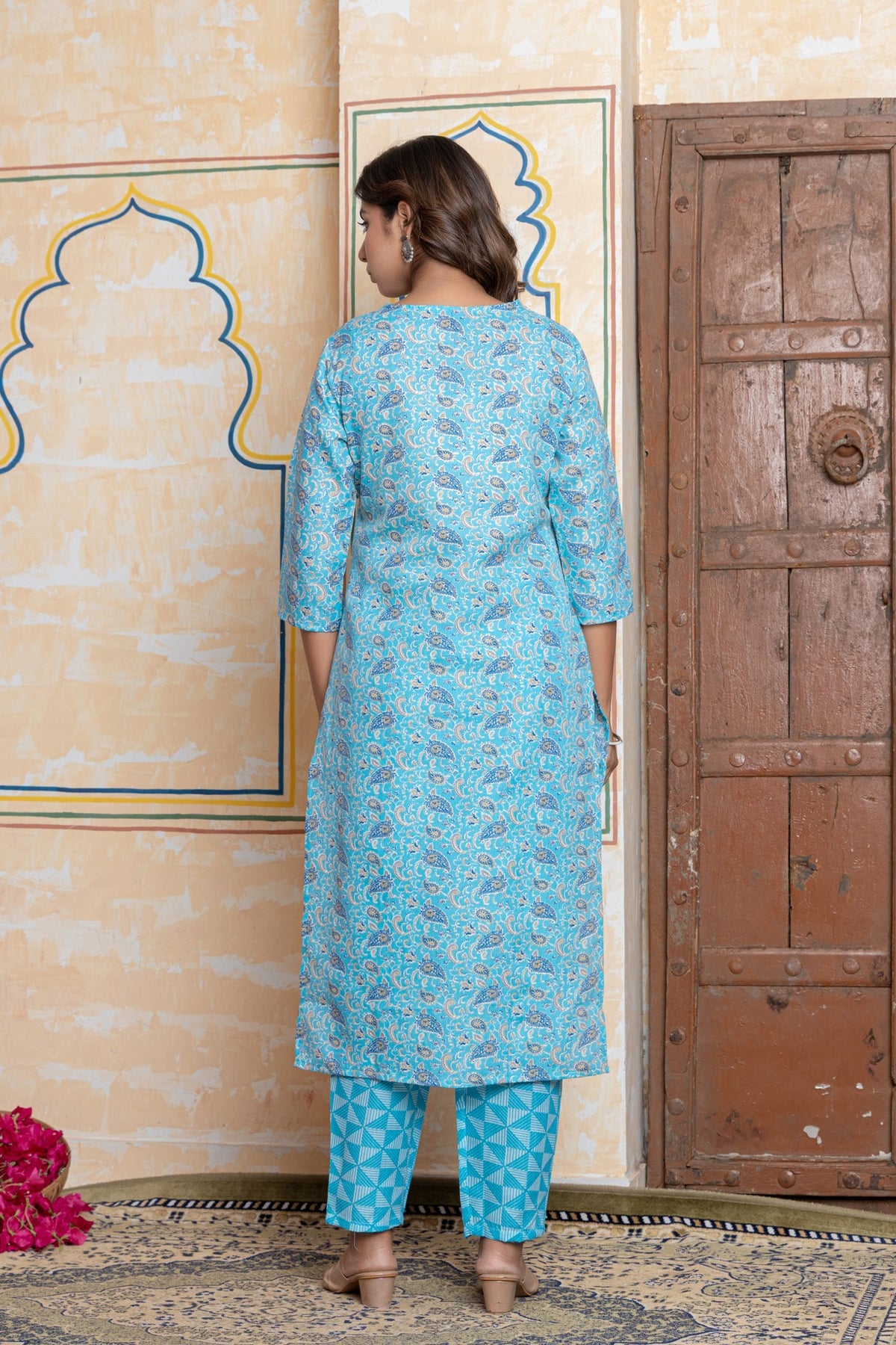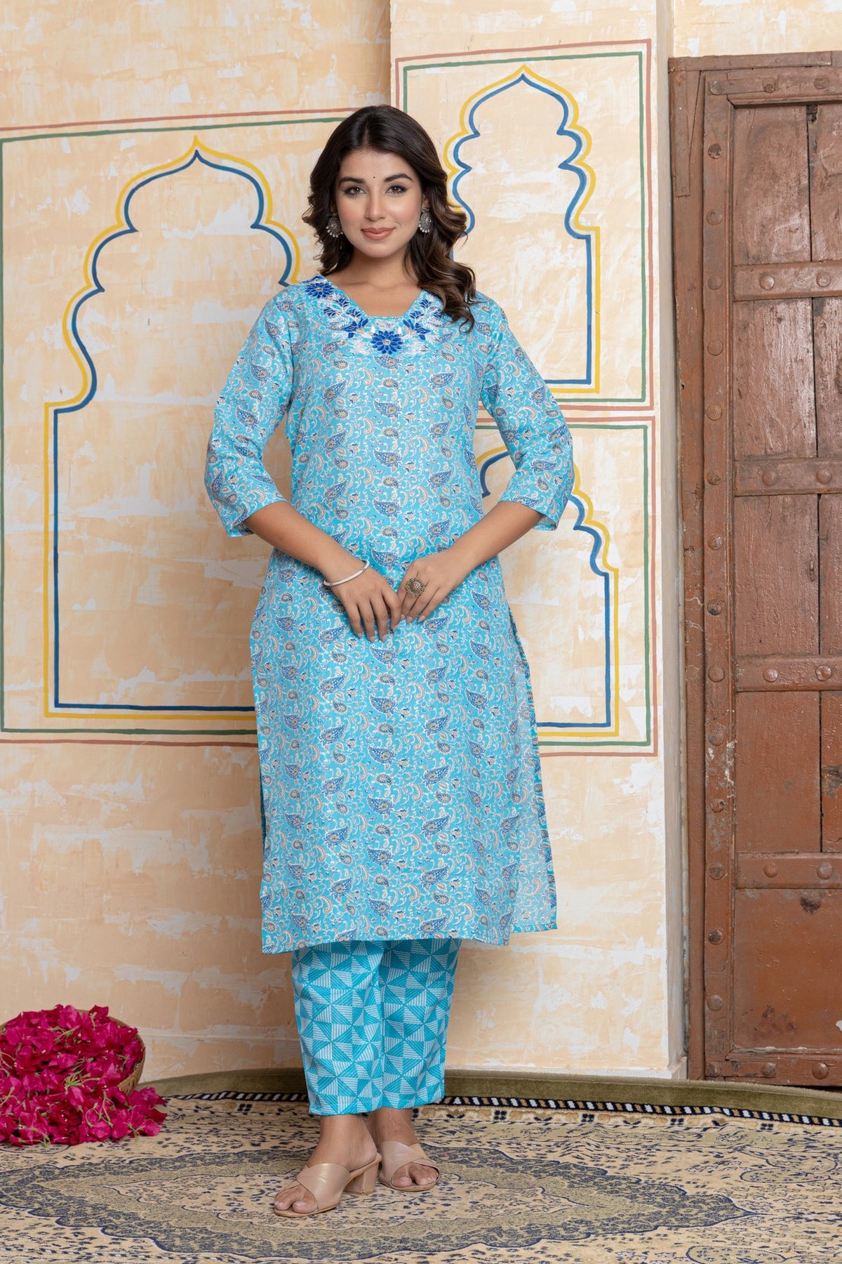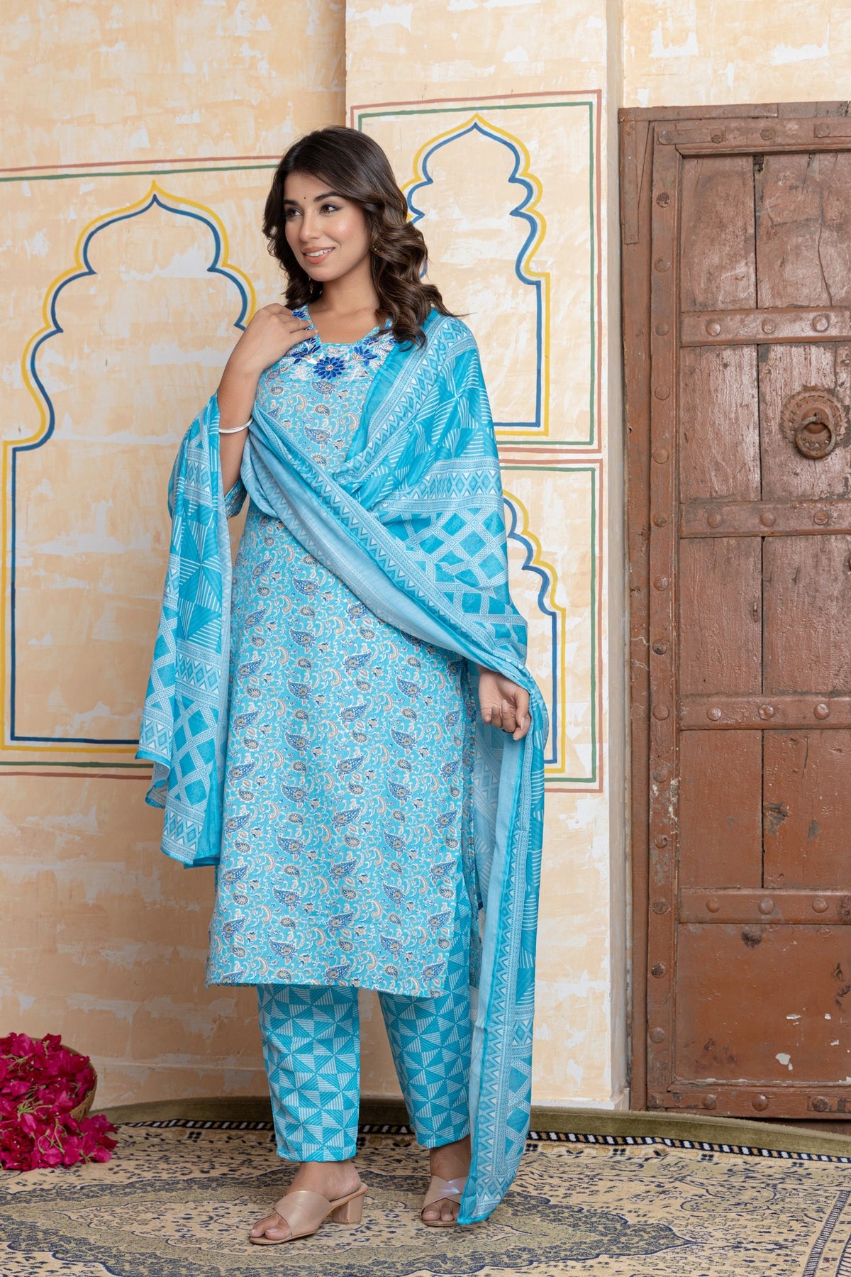 Complete Three-Piece Set: Includes a straight-fit kurta, contrasting pants, and a stunning turquoise dupatta.