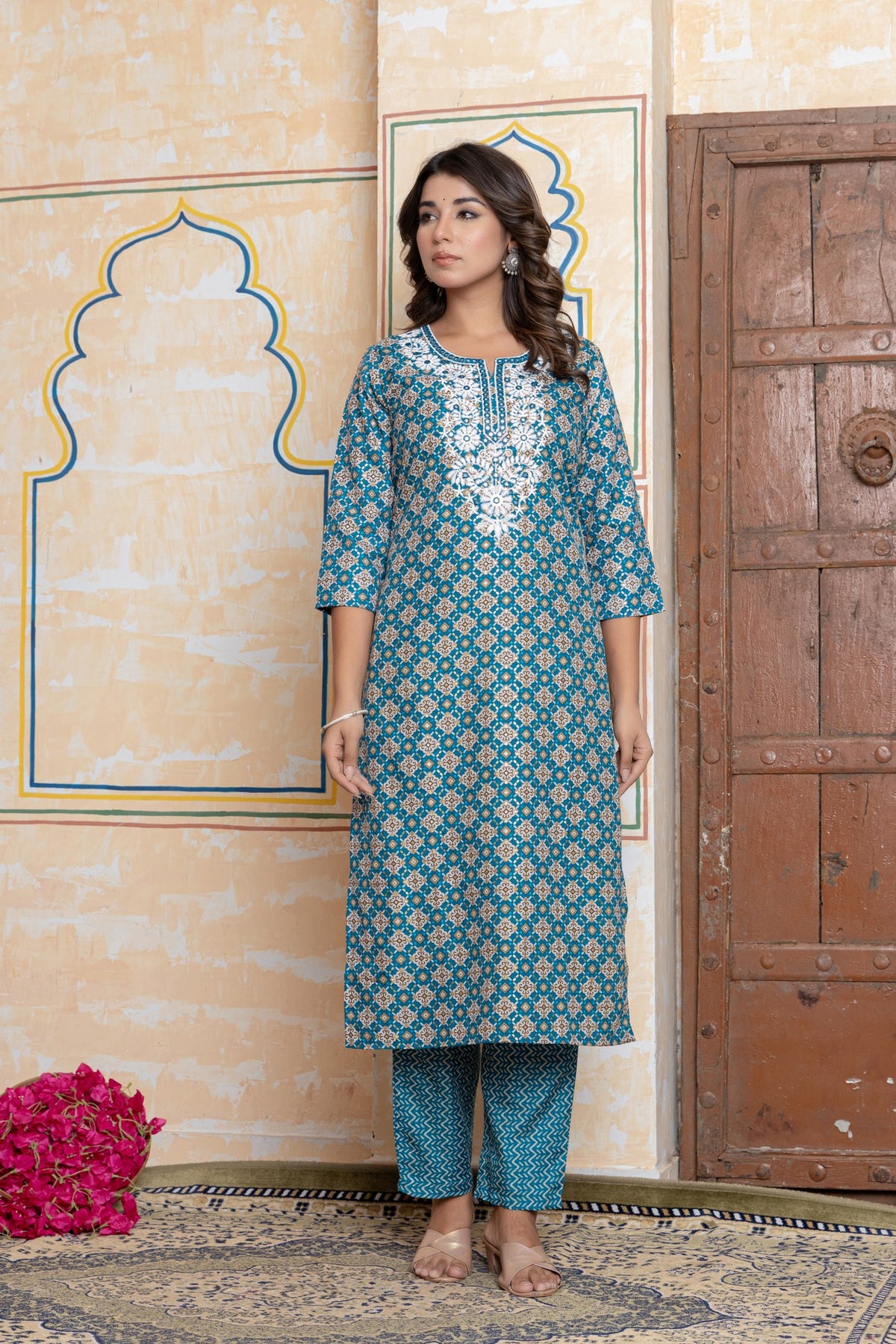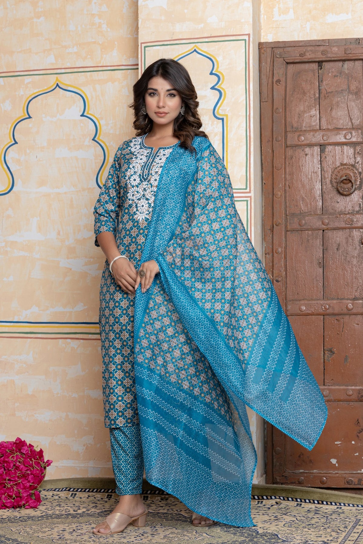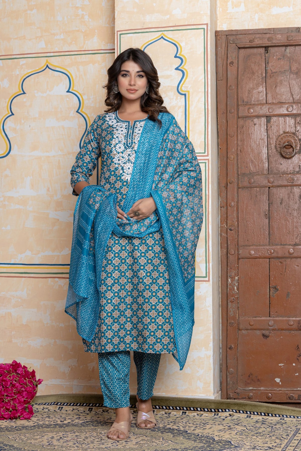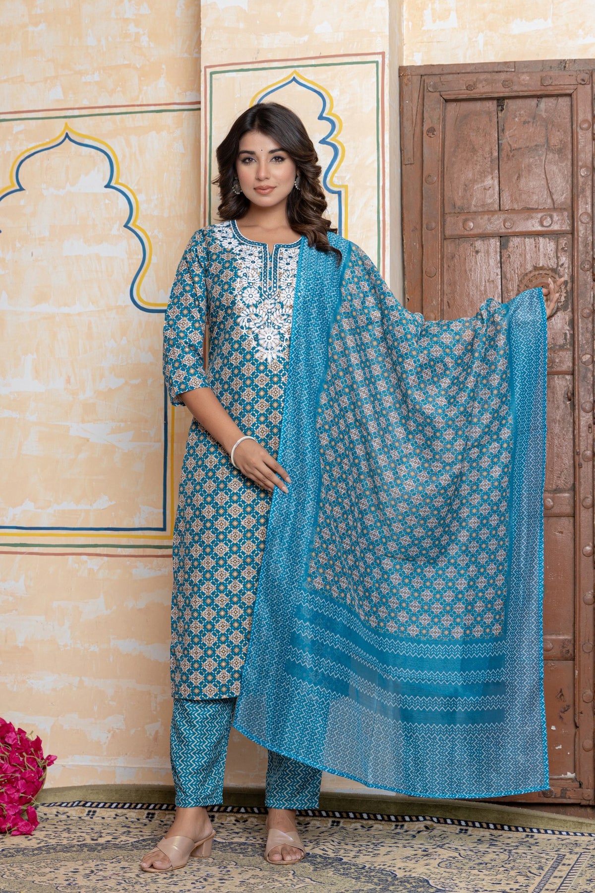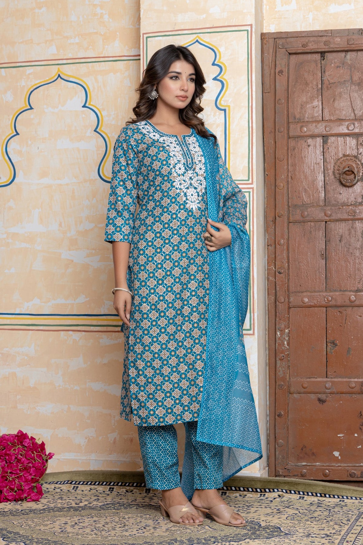 The Navra Teal Blue Cotton Kurta Set with Embroidery & Dupatta