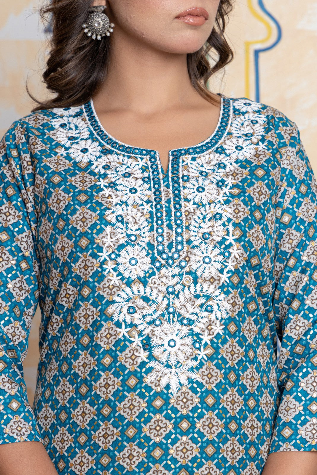 Step into serene sophistication. This Teal Blue Jaipuri Print Kurta Set from The Navra is a captivating ode to traditional artistry and refined elegance. Crafted from a soft, breathable cotton blend, its rich teal base comes alive with intricate geometric prints that exude timeless charm. Dense white neck embroidery adds a bespoke touch of luxury, elevating the suit's refined allure.