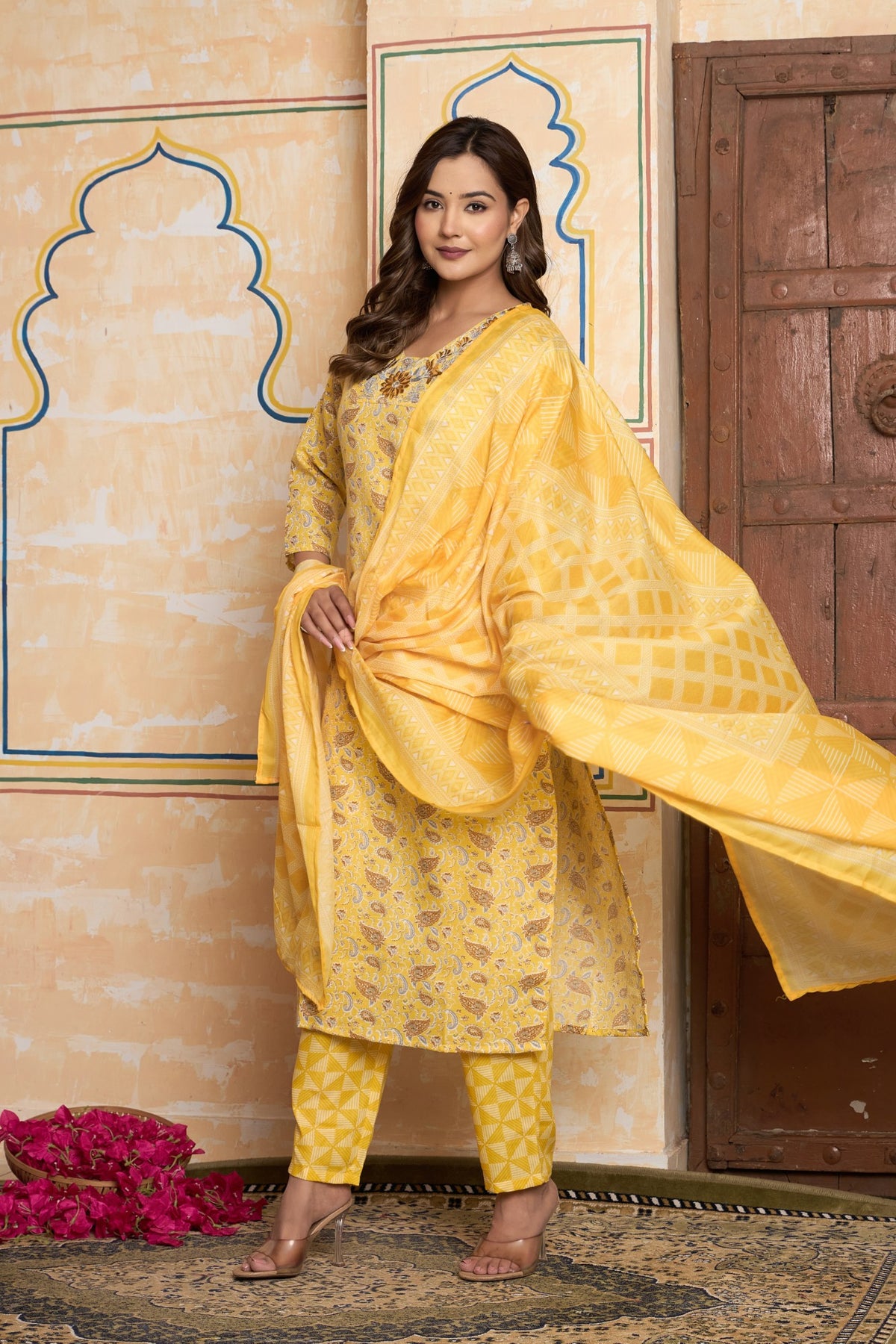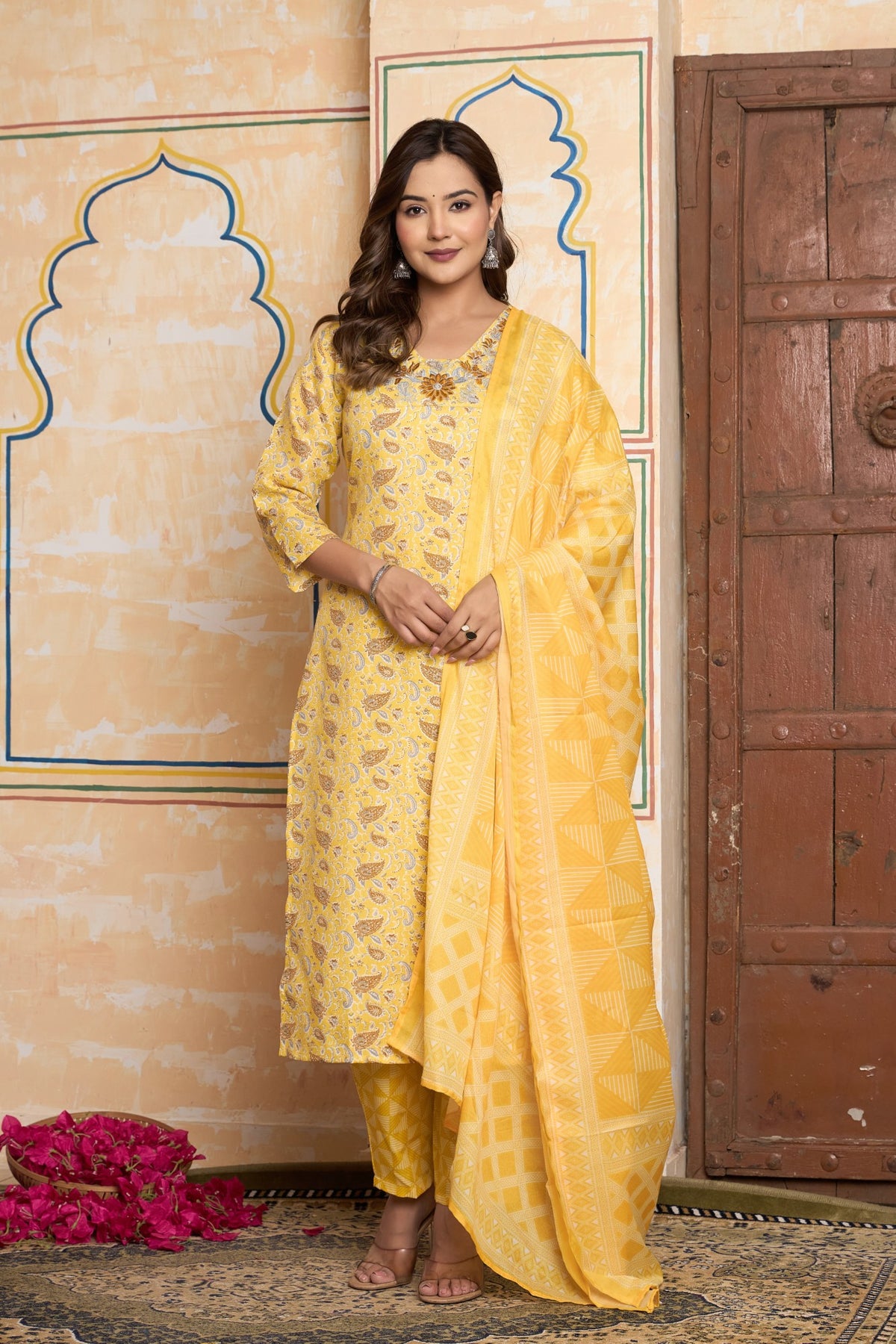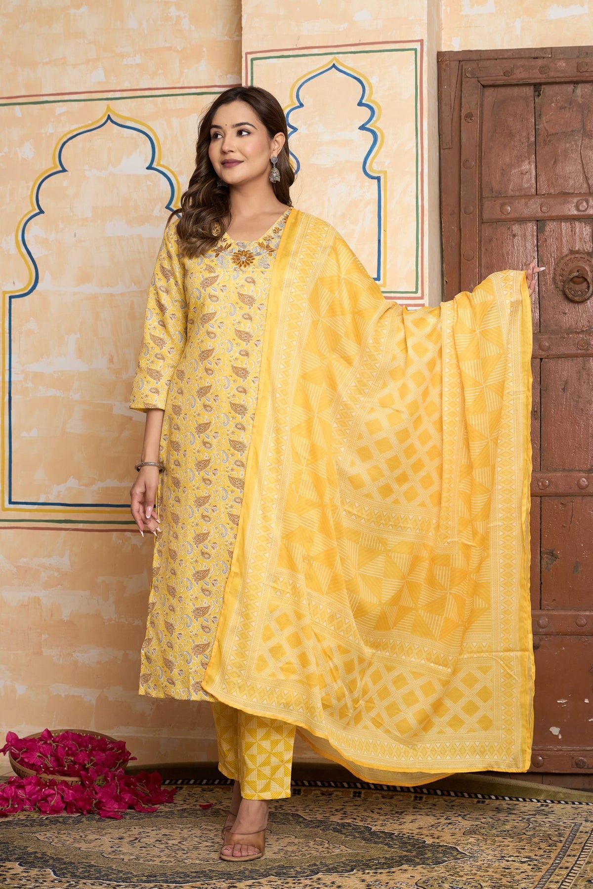 Designed for a chic and cohesive look, the graceful straight-fit kurta comes with perfectly matching printed pants. A light-as-air dupatta, featuring a playful geometric print, adds a lovely contrast and completes this stunning three-piece set. This vibrant outfit is the perfect choice for a Haldi ceremony, a daytime puja, or any festive gathering where you want to shine with happiness and effortless style.