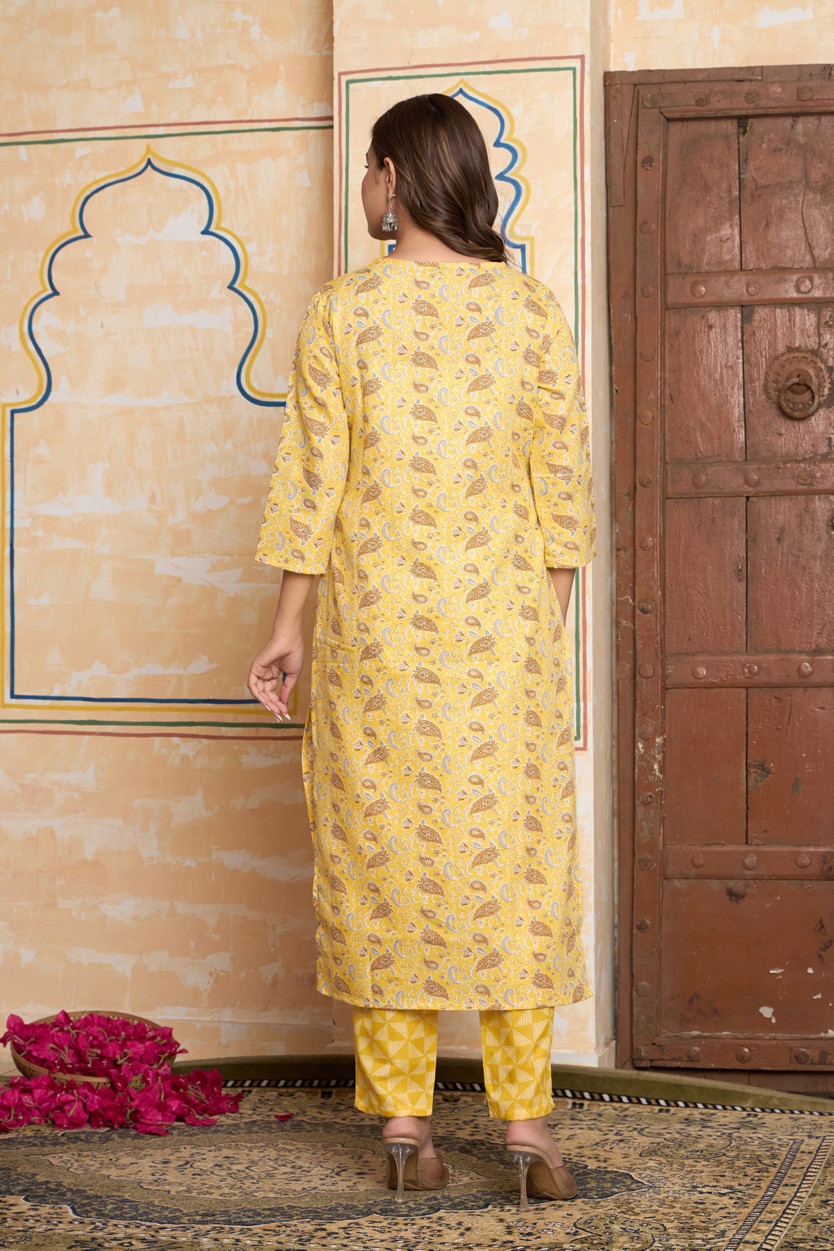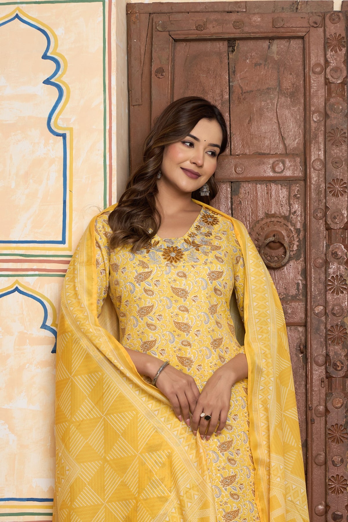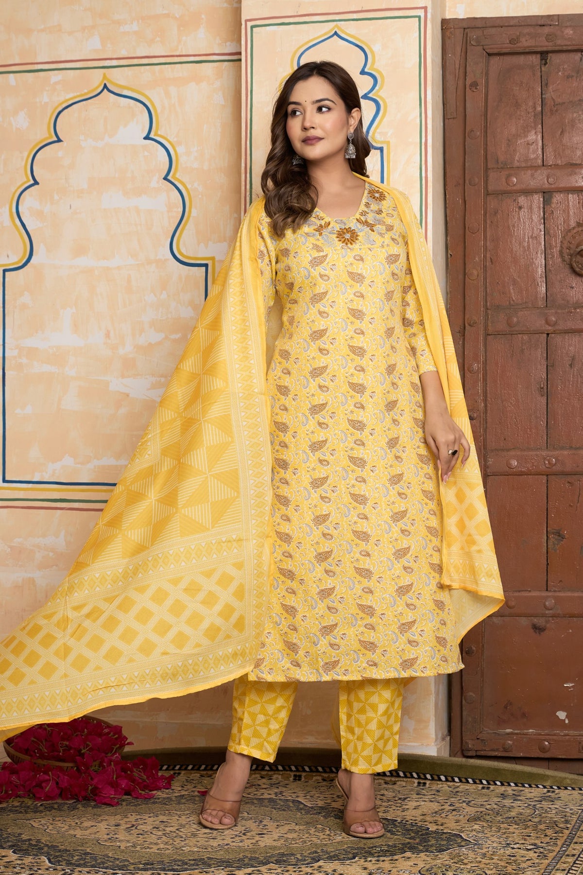 Designed for a chic and cohesive look, the graceful straight-fit kurta comes with perfectly matching printed pants. A light-as-air dupatta, featuring a playful geometric print, adds a lovely contrast and completes this stunning three-piece set. This vibrant outfit is the perfect choice for a Haldi ceremony, a daytime puja, or any festive gathering where you want to shine with happiness and effortless style.