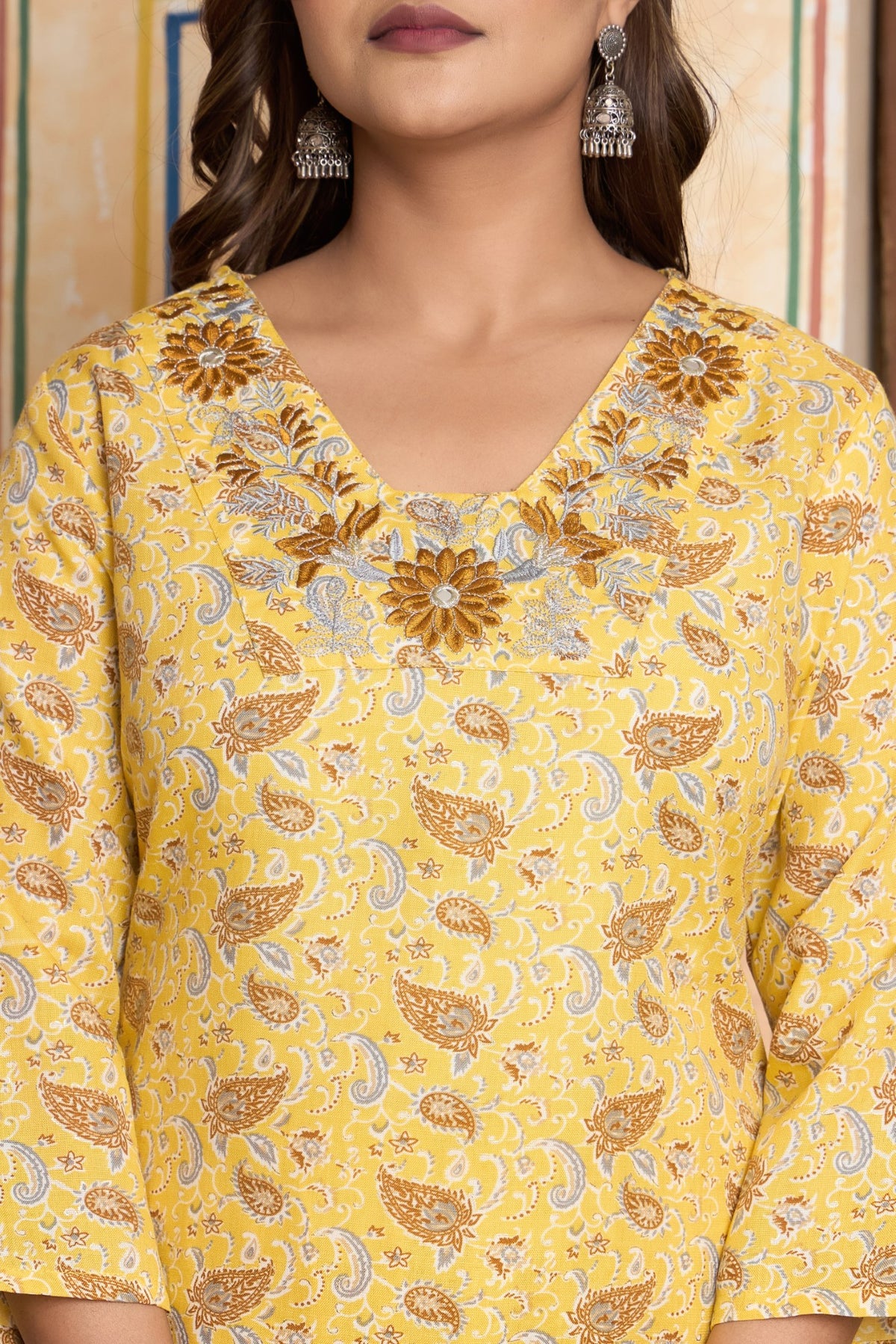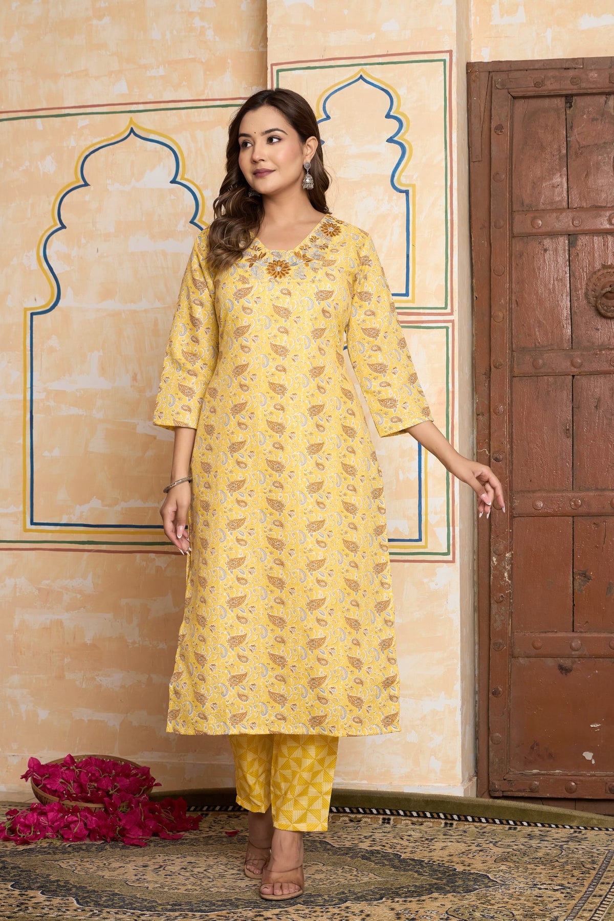 Step into the sunshine with this radiant Yellow Kurta Set from The Navra. An embodiment of pure joy and celebration, this ensemble is crafted from a soft, breathable cotton blend to keep you comfortable and glowing. The kurta's cheerful yellow canvas is adorned with delicate, all-over floral prints. The true highlight is the unique V-neckline, featuring a handcrafted embellishment with a burst of colorful threadwork and shimmering details that make this piece truly special.
